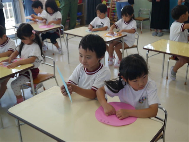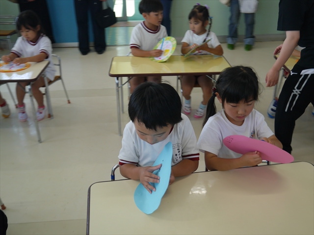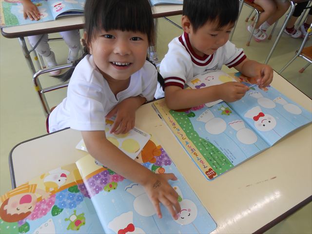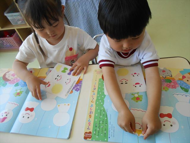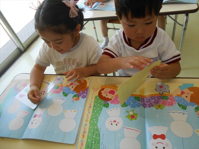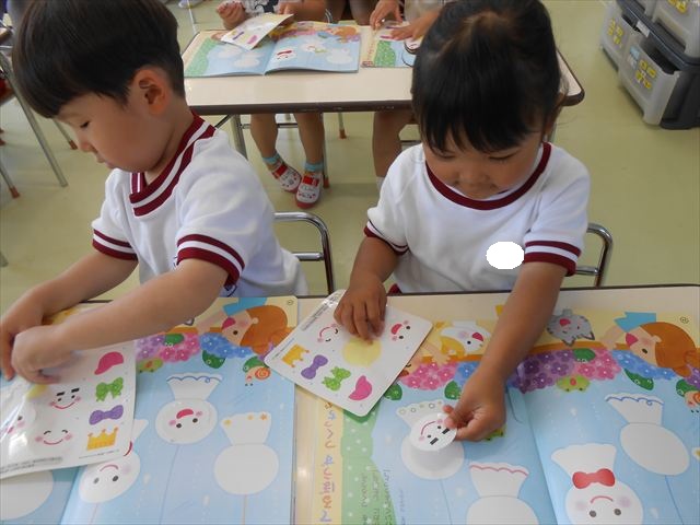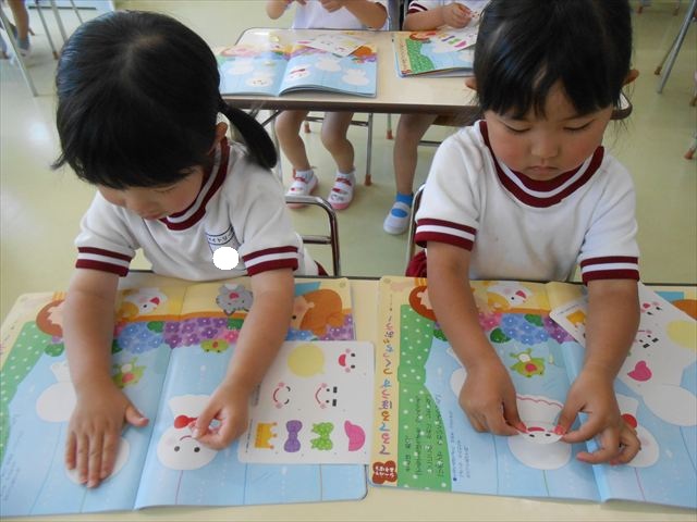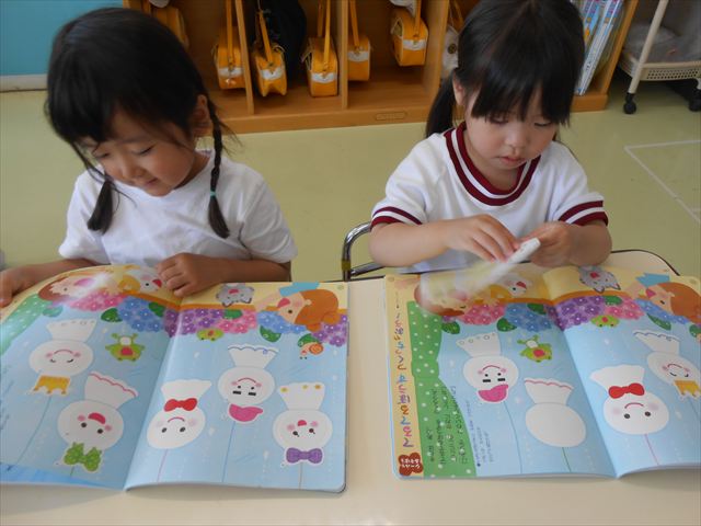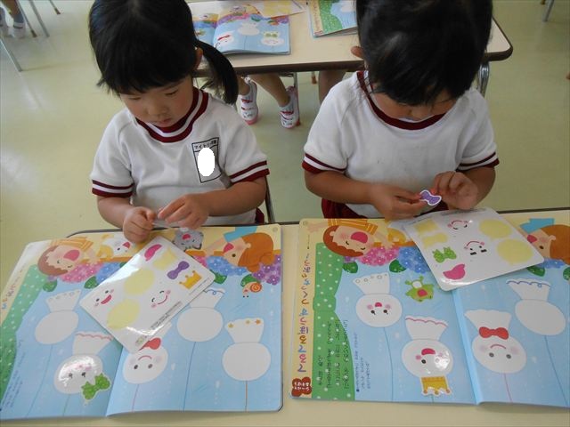 今日は、6月の月刊誌を見ました。飛行機が載っていて、かっこいい~乗りたーい!と盛り上がっていました。シールは、てるてる坊主!顔の表情を貼ったり、リボンを貼ったり楽しみながら取り組むことができました(