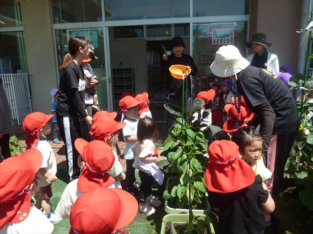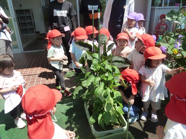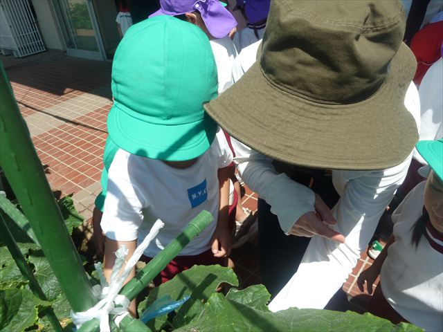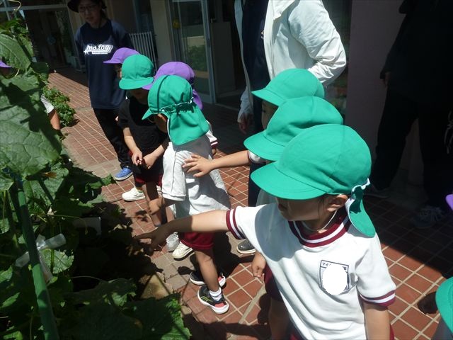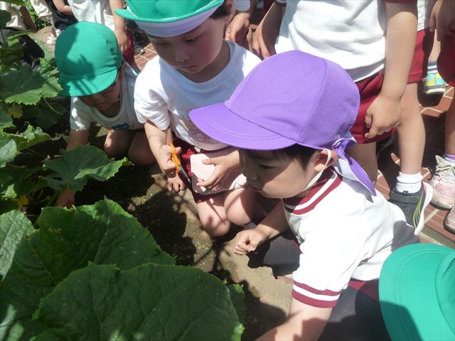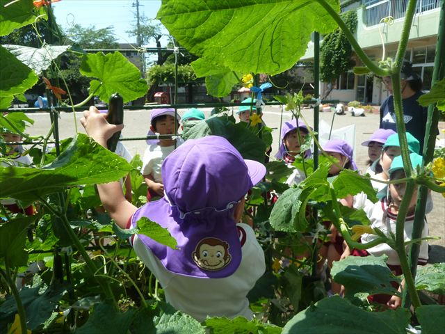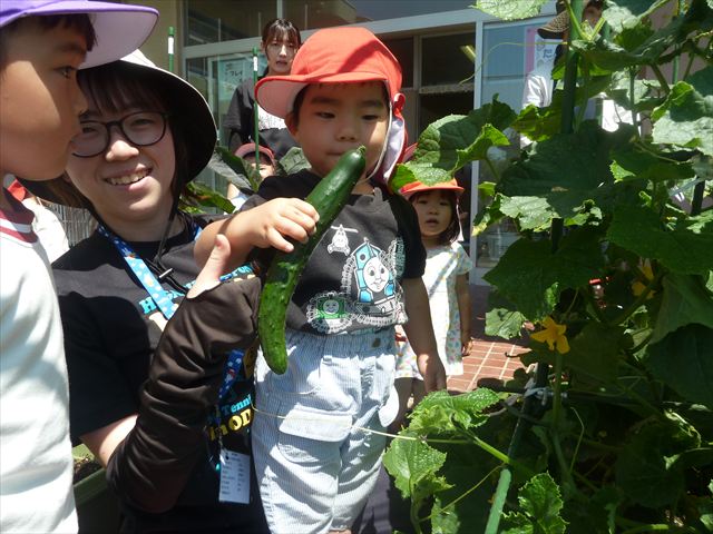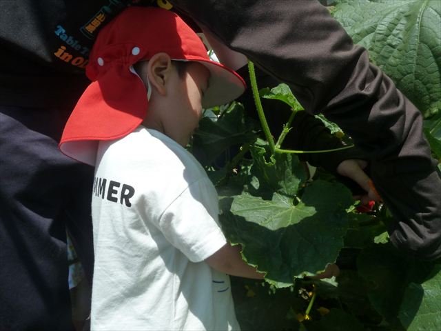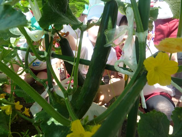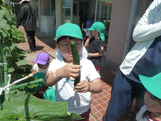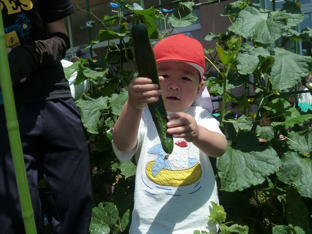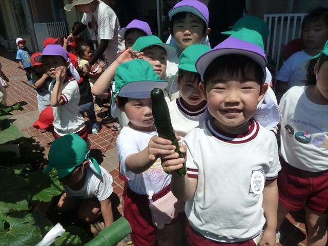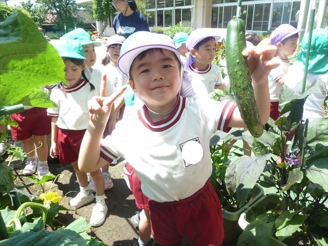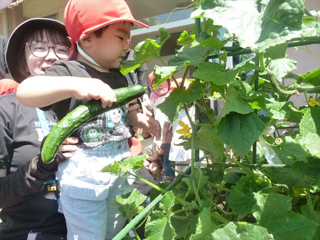 「食育単元:育てて食べる!」の一環として今日収穫して食べた物はきゅうり5本です!たんぽぽさんに2本、年中さんに3本収穫してもらいました。きゅうりのとげとげにびっくりして触るのに戸惑うかわいいたんぽぽさんの姿が見られました。年中さんは慣れたもので積極的に収穫していました!新鮮なきゅうりを塩もみにしてみんなでいただきました。とっても美味しかったです♡
