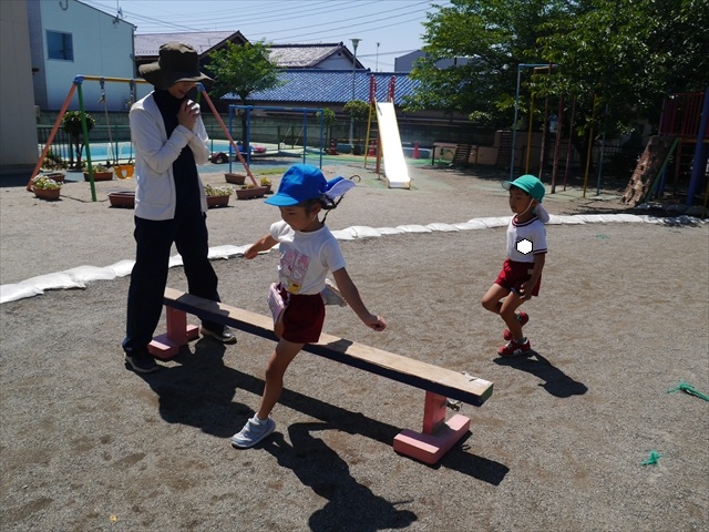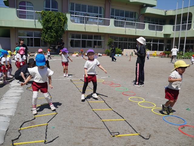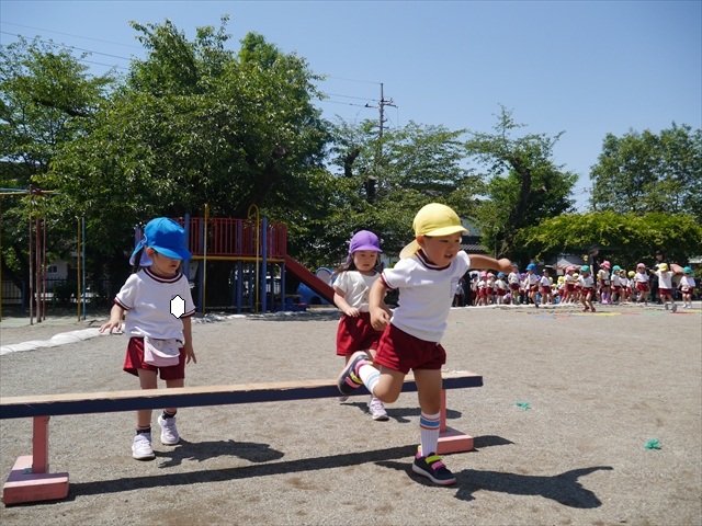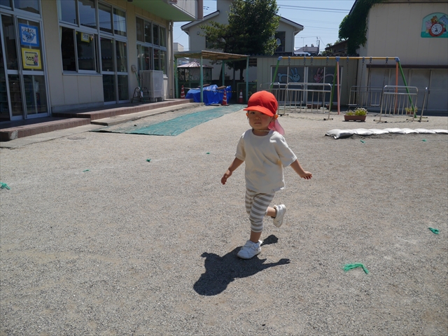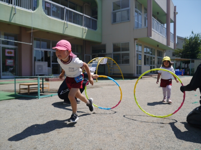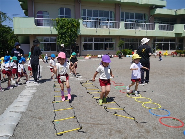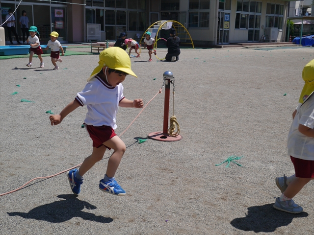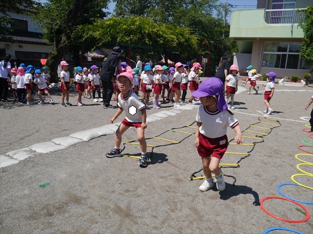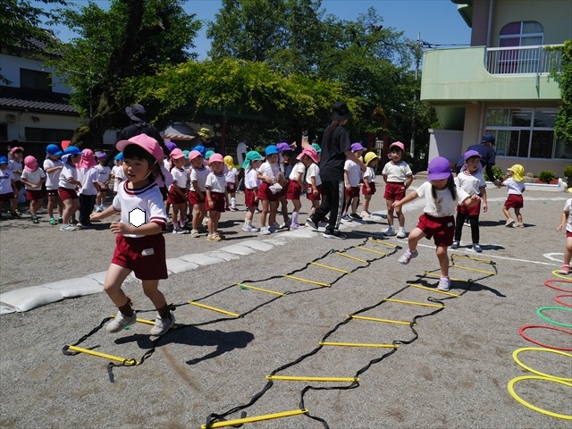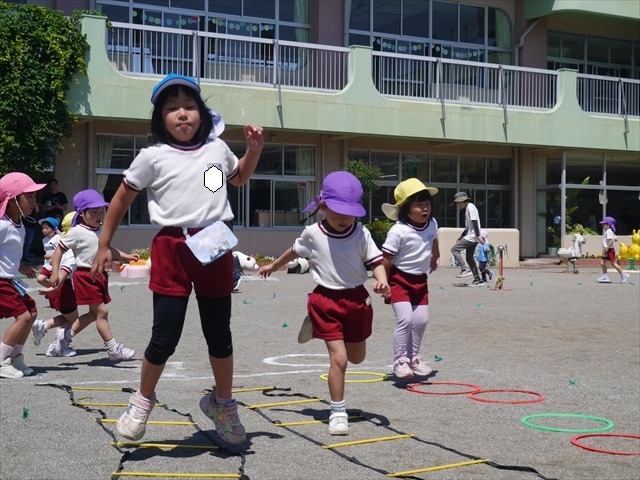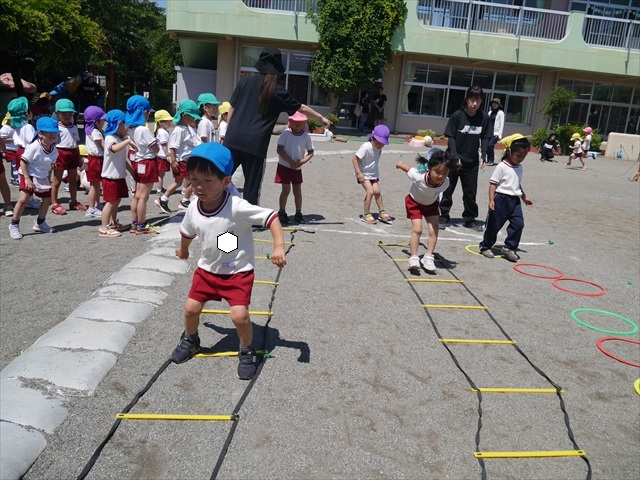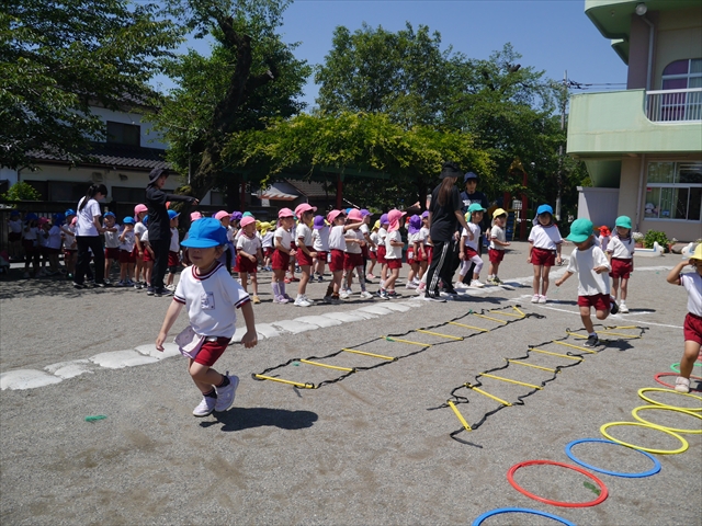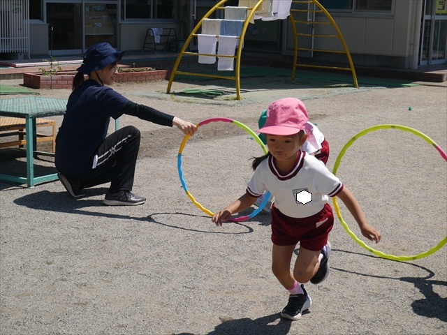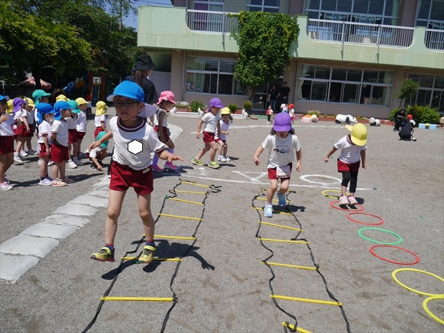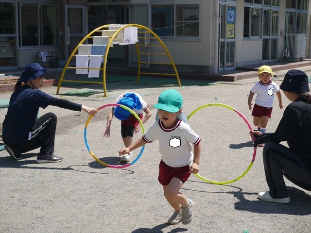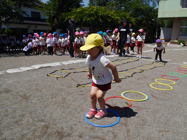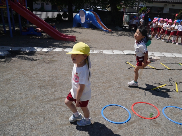 今日は、朝から夏全開のような暑さの天気でした。元気に朝の園庭遊びをした後、今日の朝の活動は「サーキットトレーニング1」でした。子どもたちは、暑さに負けず元気いっぱい頑張りました!えらい!\(^_^)/ ヘ(^o^)/