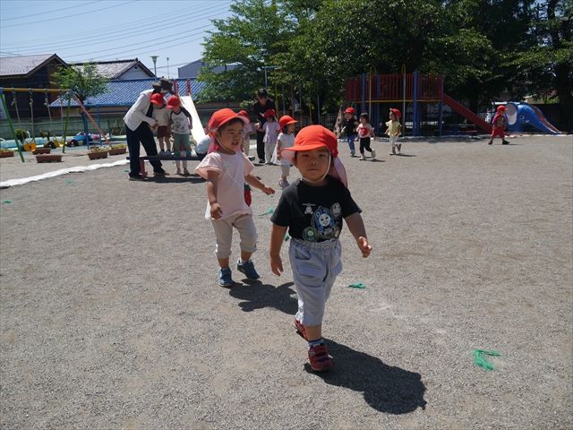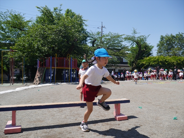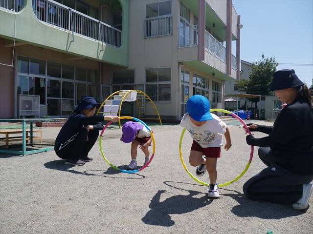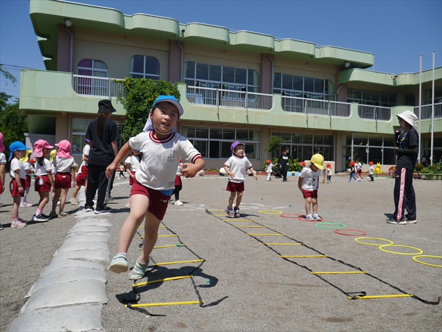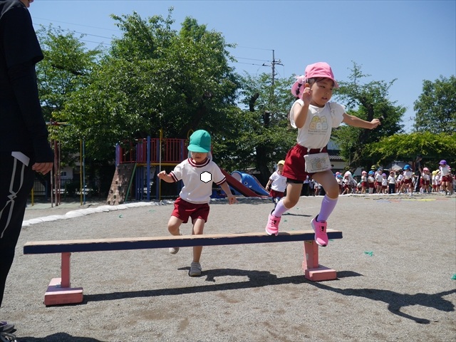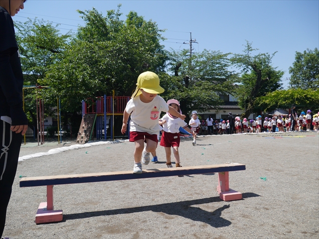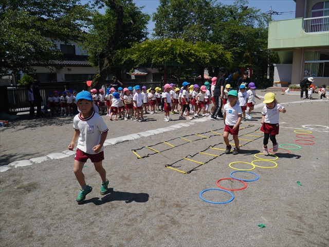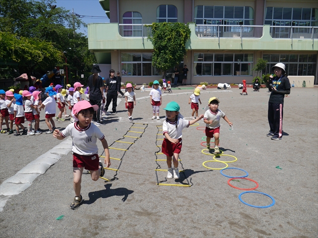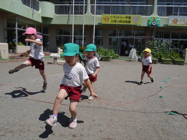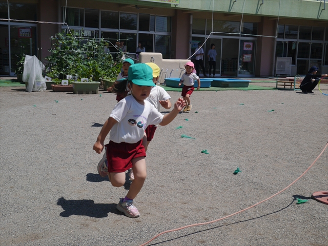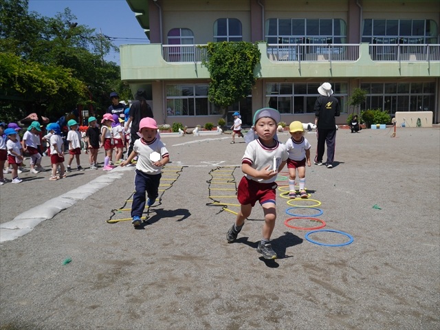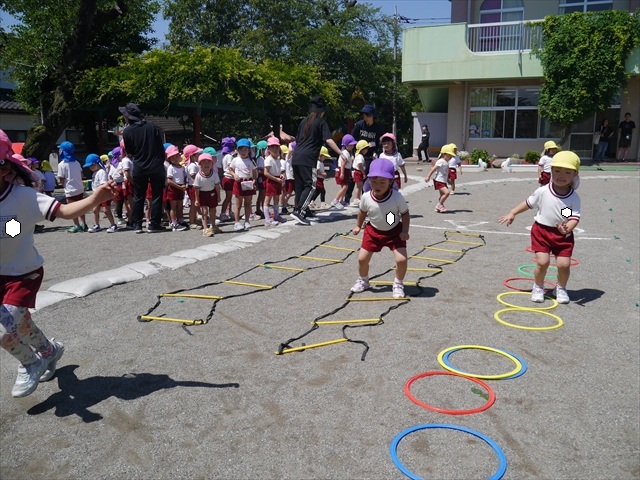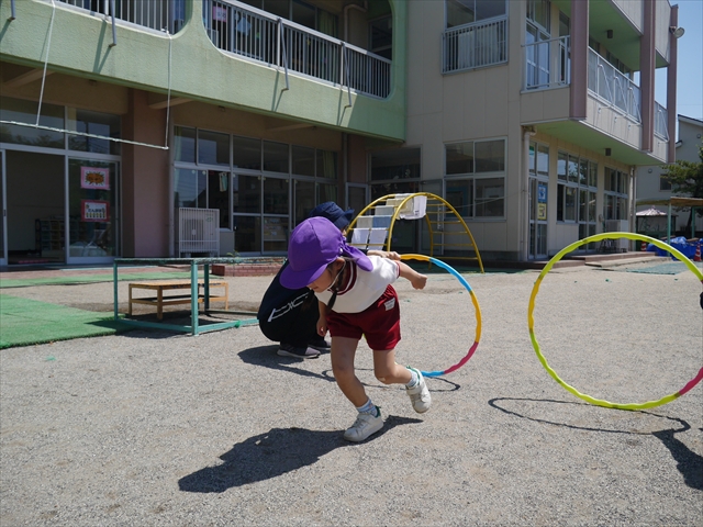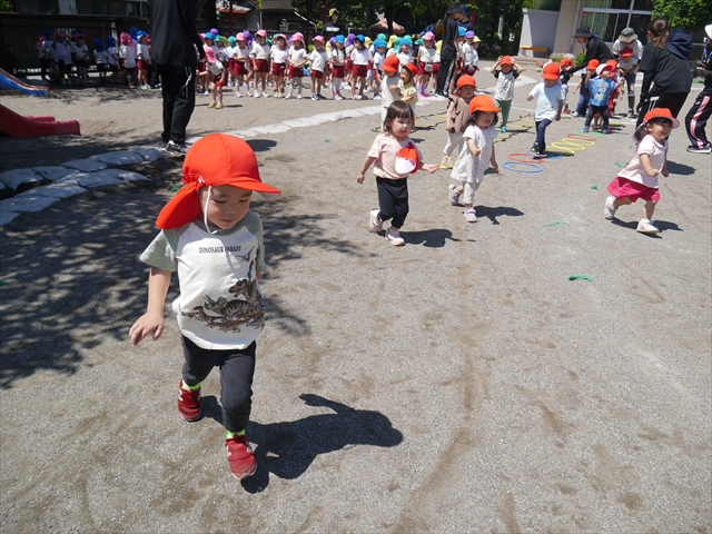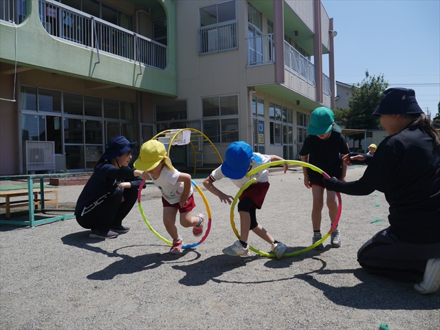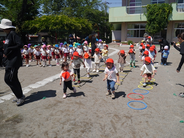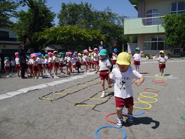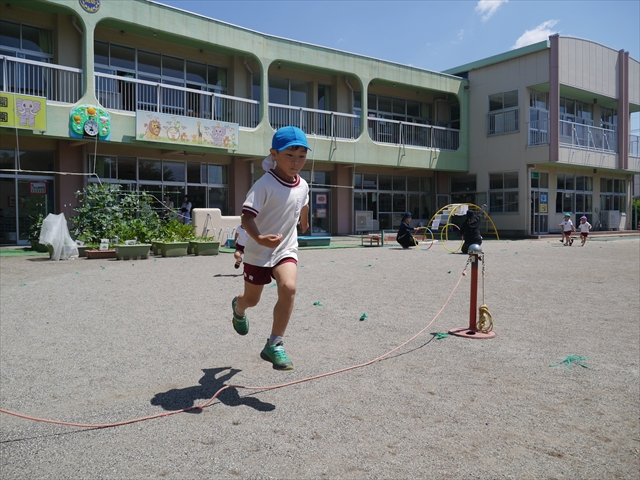 今日は、朝から夏全開のような暑さの天気でした。元気に朝の園庭遊びをした後、今日の朝の活動は「サーキットトレーニング1」でした。子どもたちは、暑さに負けず元気いっぱい頑張りました!えらい!\(^_^)/ ヘ(^o^)/