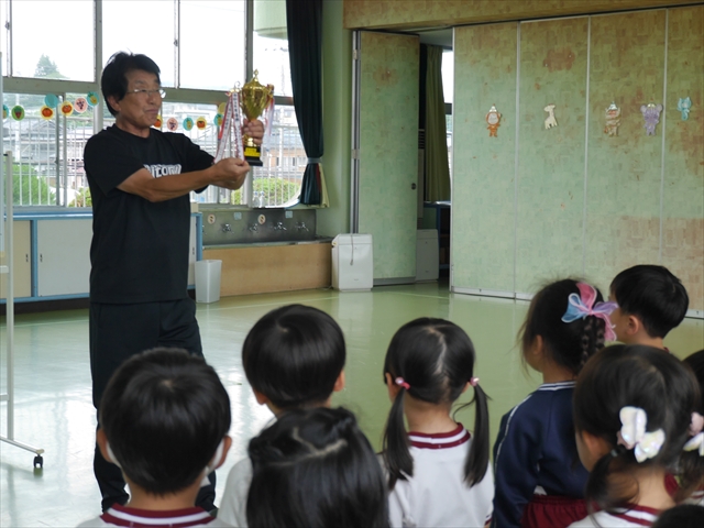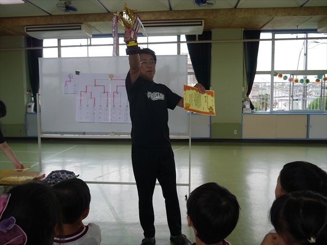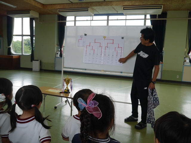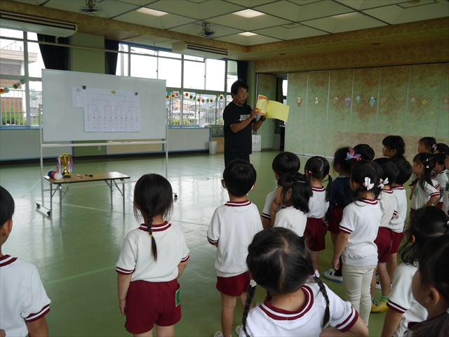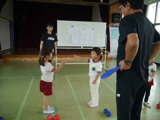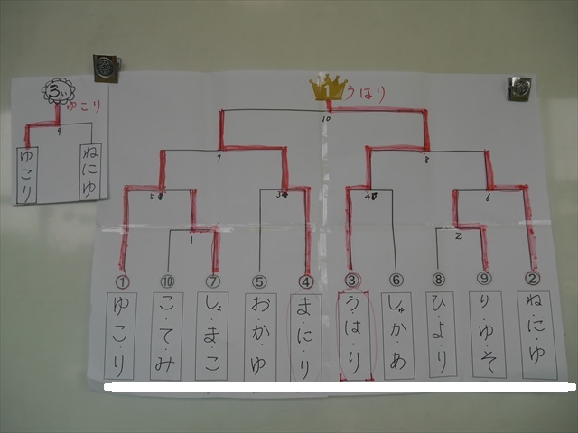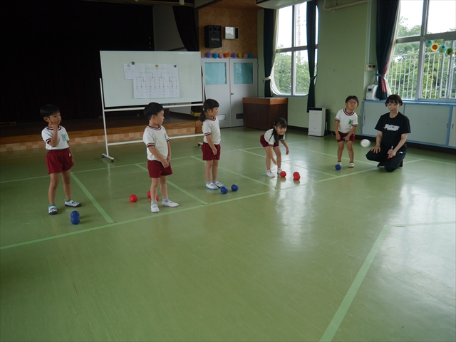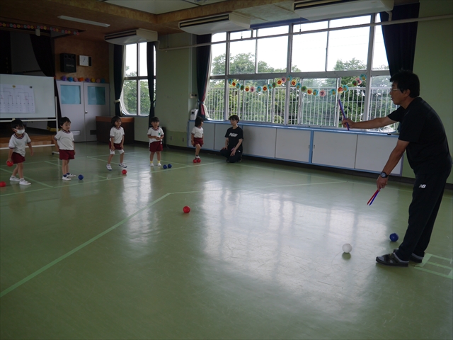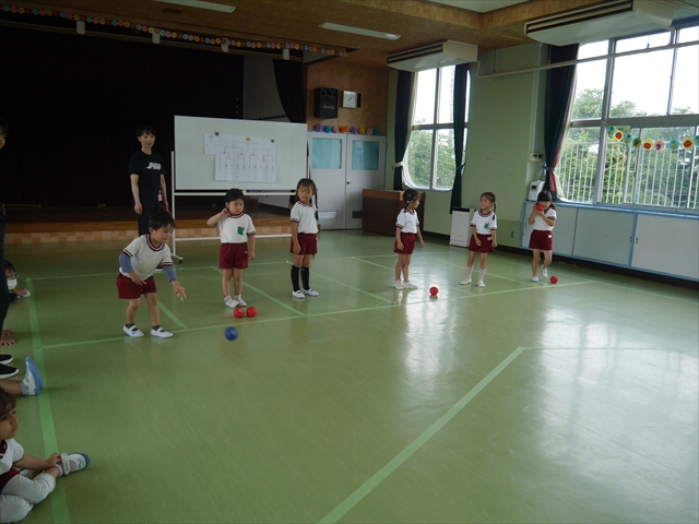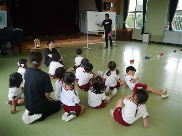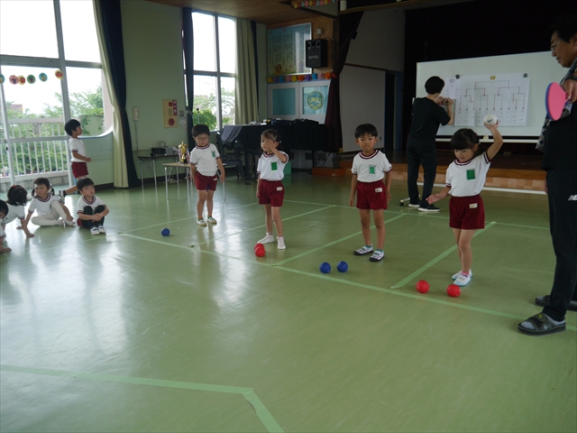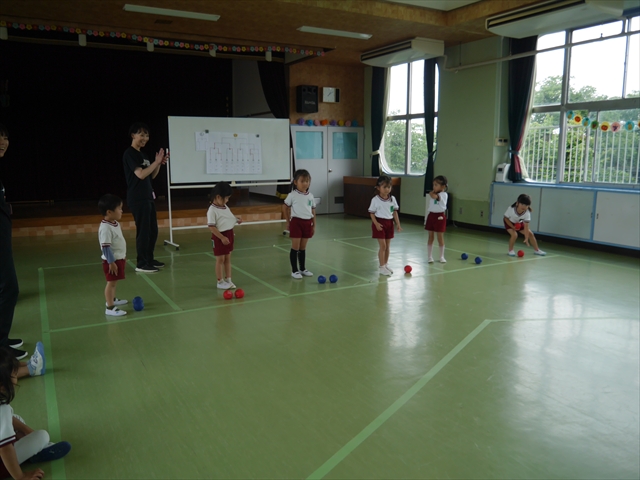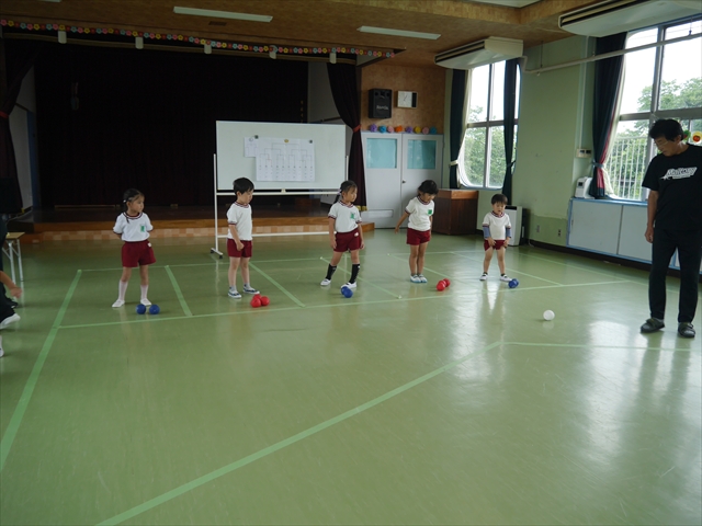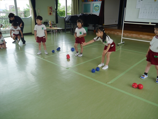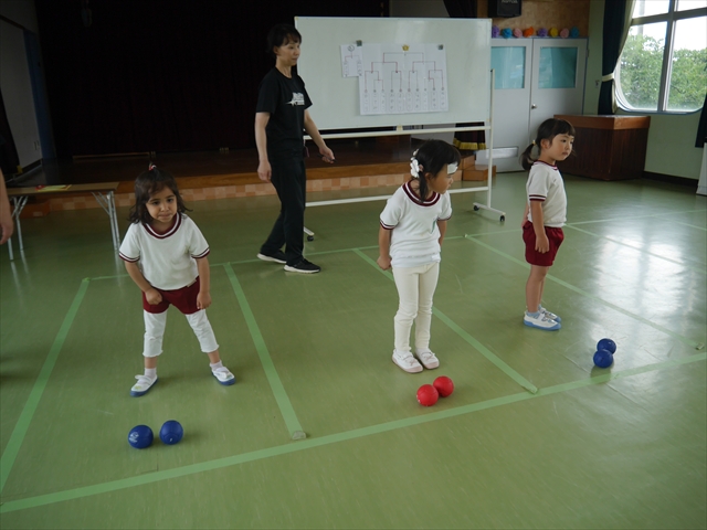 今日の午後のカリキュラムで、年中さんは第3回「マイトリー杯争奪ボッチャ大会」を開催しました。この大会も3年目を迎えました。団体戦(1チーム2~3名)の10チームによるトーナメント方式で実施しました。1回戦から逆転の連続の白熱した試合が展開されましたが、「ま・に・り」チームと「う・は・り」チームが決勝に進出しました。決勝前の3位決定戦では、「ゆ・こ・り」チームと「ね・に・ゆ」チームが対戦し、「ゆ・こ・り」チームが勝利し第3位に輝きました。そして決勝では、劇的な逆転勝ちで「う・は・り」チームが栄冠に輝きました。\(^_^)/ おめでとう~!\(^_^)/ みんなボッチャを楽しみ、熱戦を味わい、盛り上がって頑張りました。負けたチーは、その悔しさを来年の年長大会で発揮してほしいと思います。がんばれ~!ヘ(^o^)/ 大会後は成績発表のみ行い、表彰式は28日(火)の朝礼で行います。優勝した「う・は・り(うた・はり・りひ)」チームには、優勝杯(持ち回りにしますので、差し上げられませんが!(^_^;) )と賞状が授与されます。ヘ(^o^)/ また、惜しくも決勝で敗れた「ま・に・り(まな・にこ・りく)」チームには準優勝の賞状が、3位決定戦で勝利した「ゆ・こ・り(ゆか・こう・りお)」チームには第3位の賞状がそれぞれ授与されます。入賞おめでとう!\(^_^)/