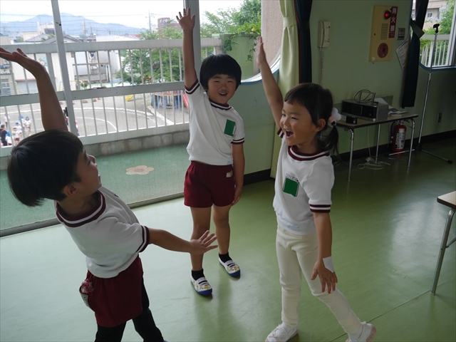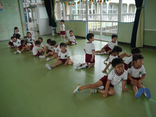 朝の活動「ラララ!トロピカーニバル体操」「サーキットトレーニング2」、みんな元気に頑張りました!ヘ(^o^)/ \(^_^)/