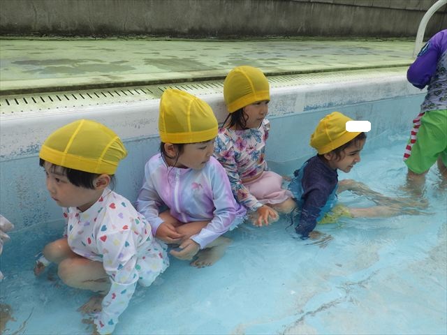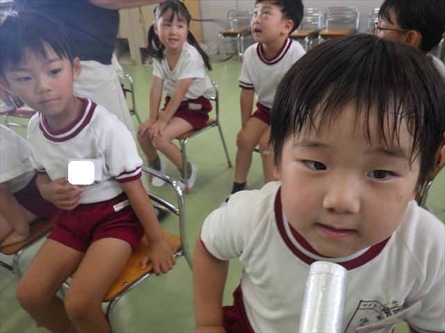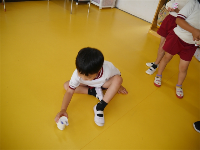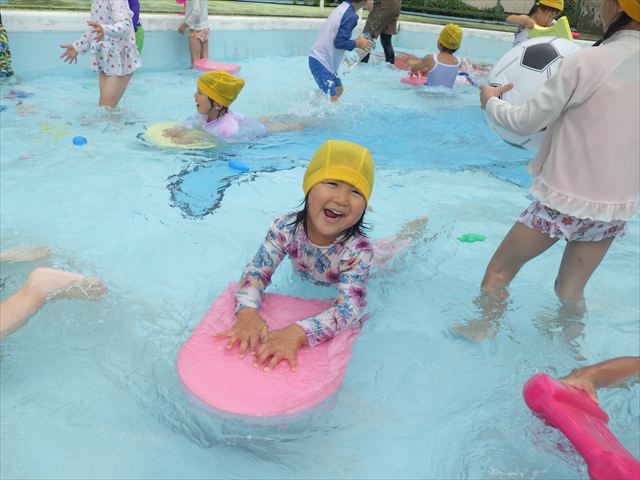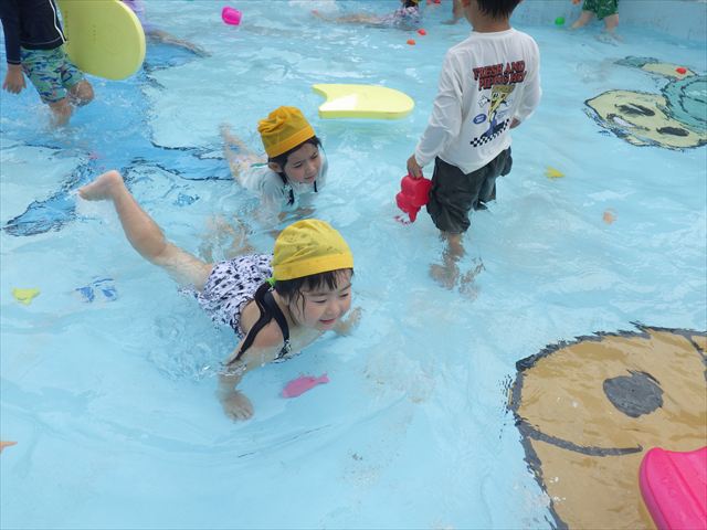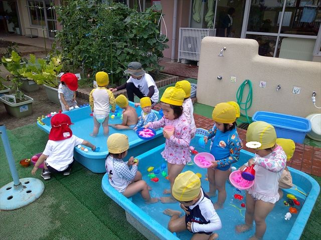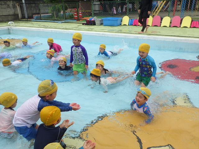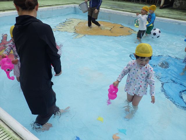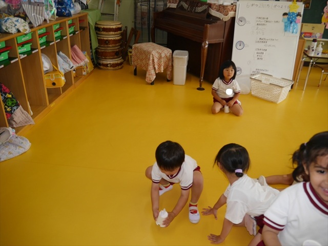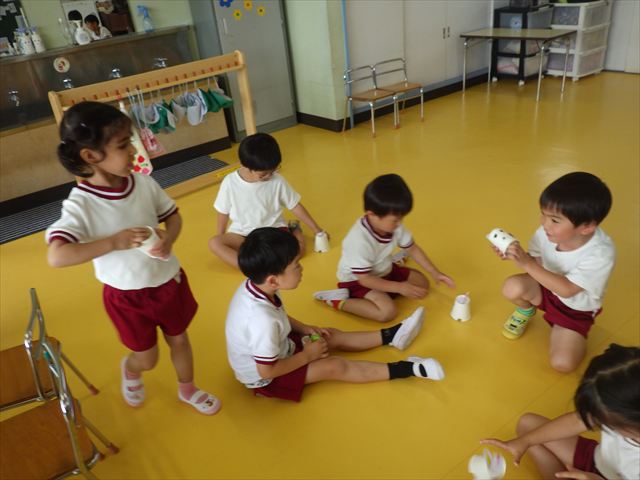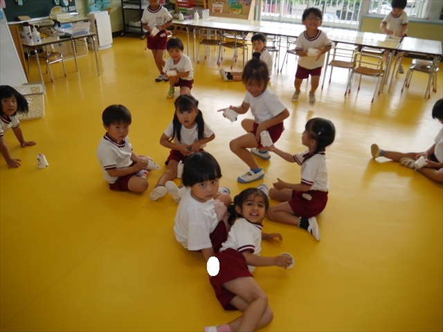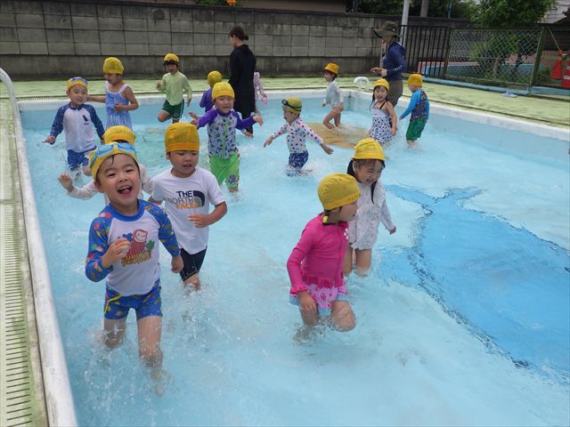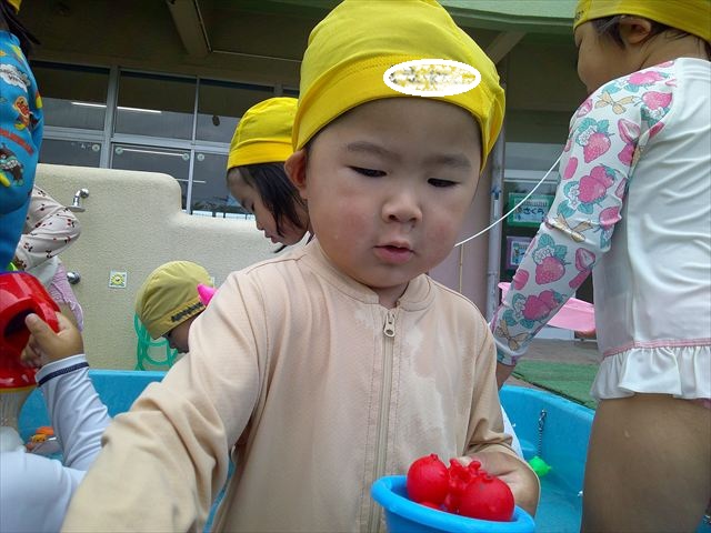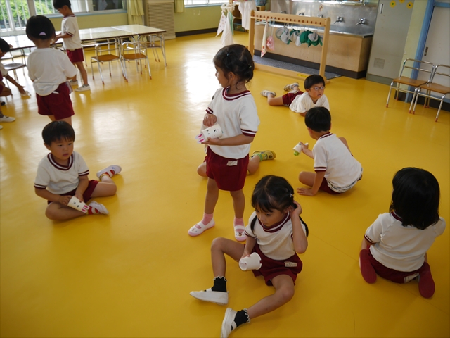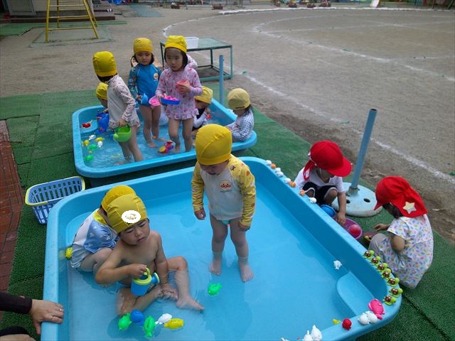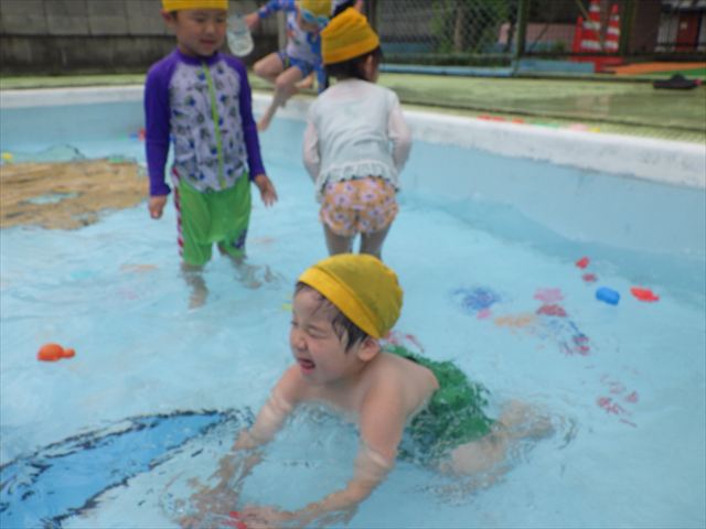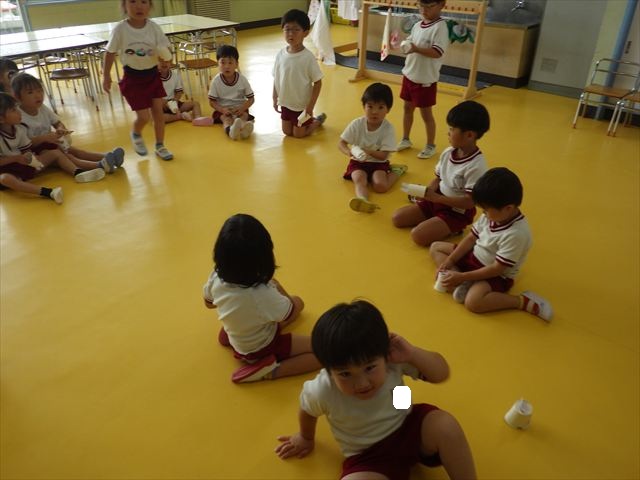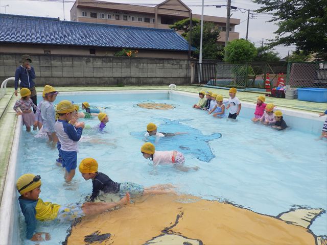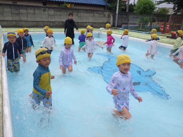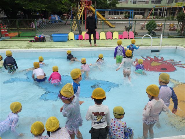 今日はプール遊びをしました。大きいプールにも慣れ楽しむ姿が見られました。水に顔をつけられるお友だちも数名いました\(^o^)/プール遊びの後は算数の時間として1〜5の数のお勉強をしました。1〜5の数字とメロンパンとお友だちを比べっこしました(^^)みんな真剣に取り組んでいました。午後はともえ先生のリトミック教室に参加しました。歩くスピードを音符で教えてもらいました。きれいなスカーフを貸していただき、ボートを漕いだり、海の生き物になったりサメが来たら隠れたり音楽に合わせて楽しむことができました。ともえ先生ありがとうございました(^^)