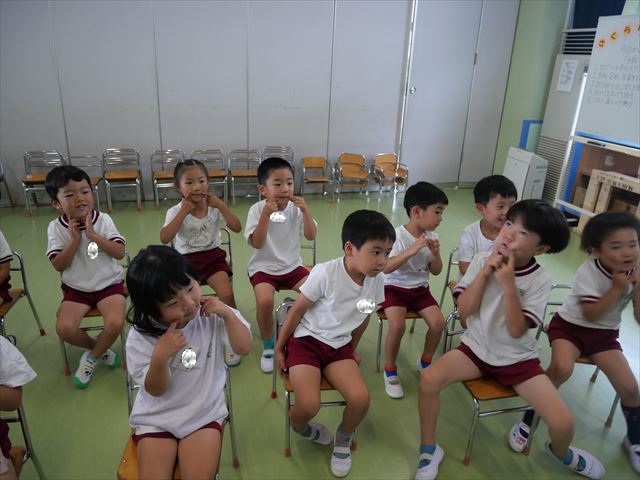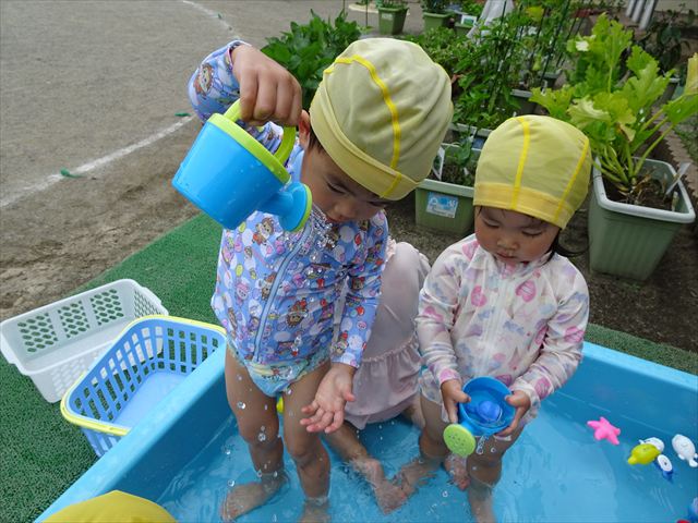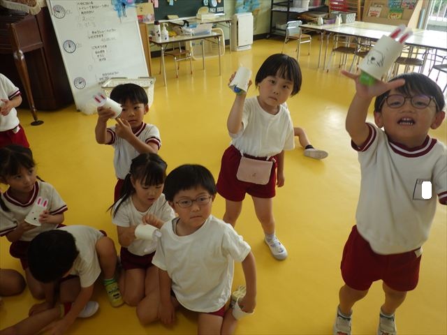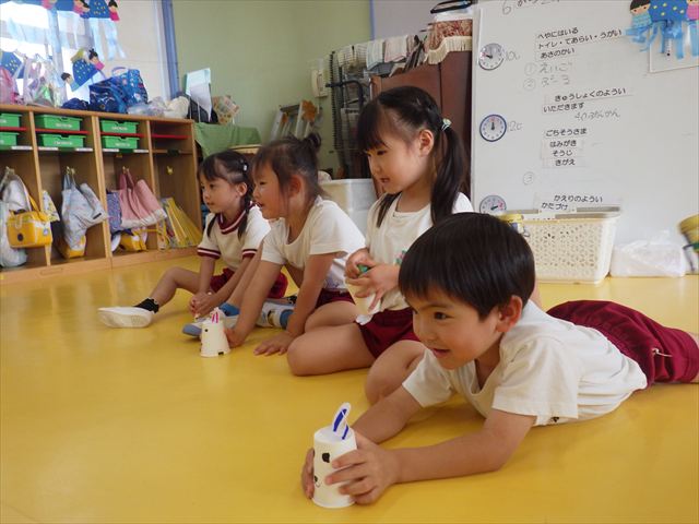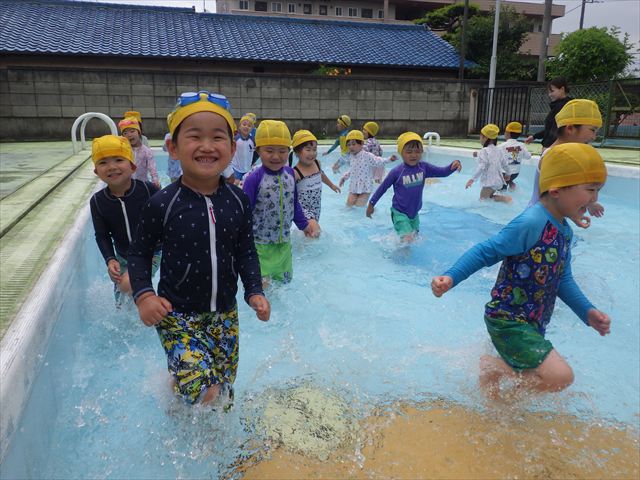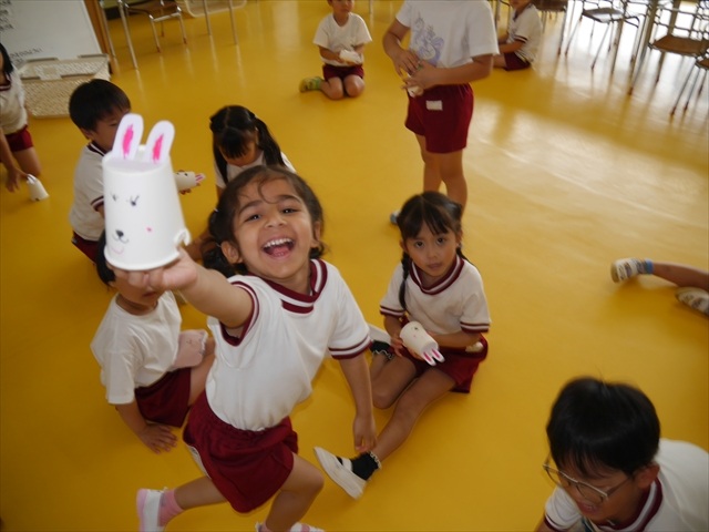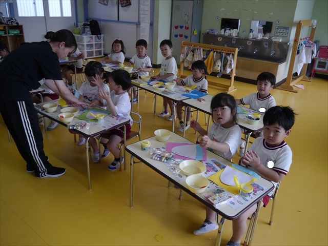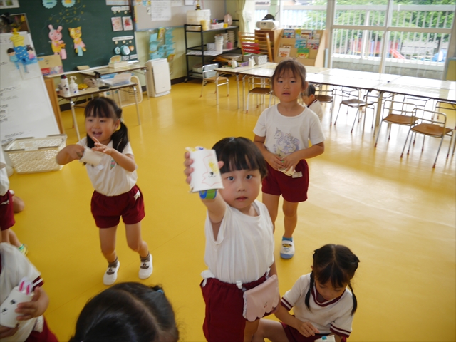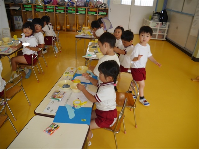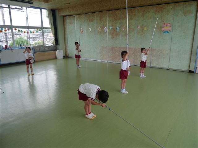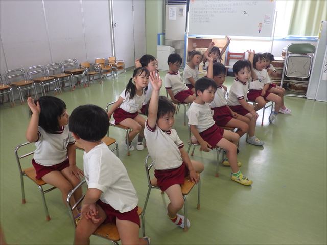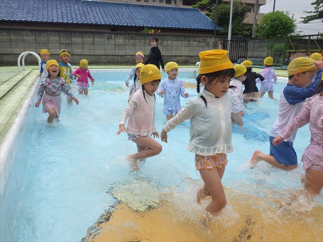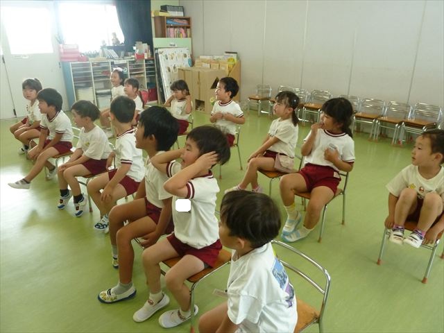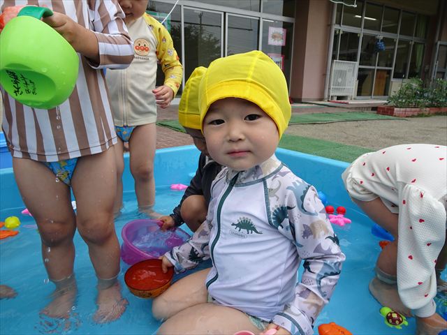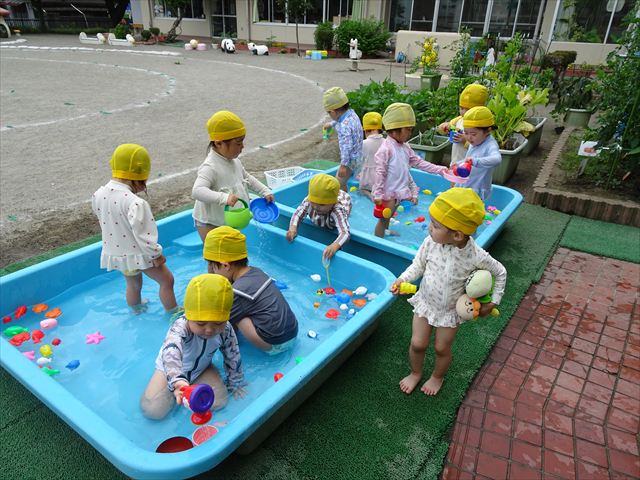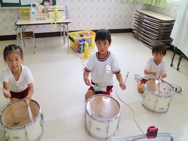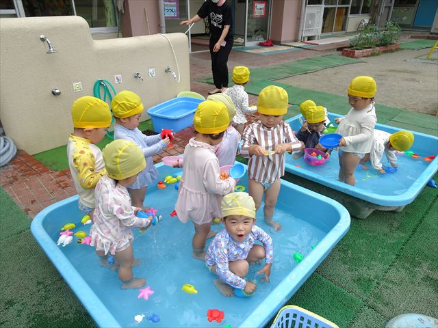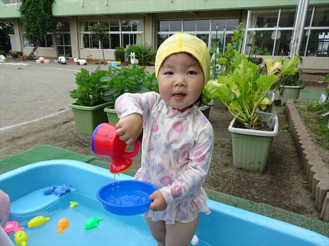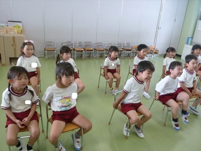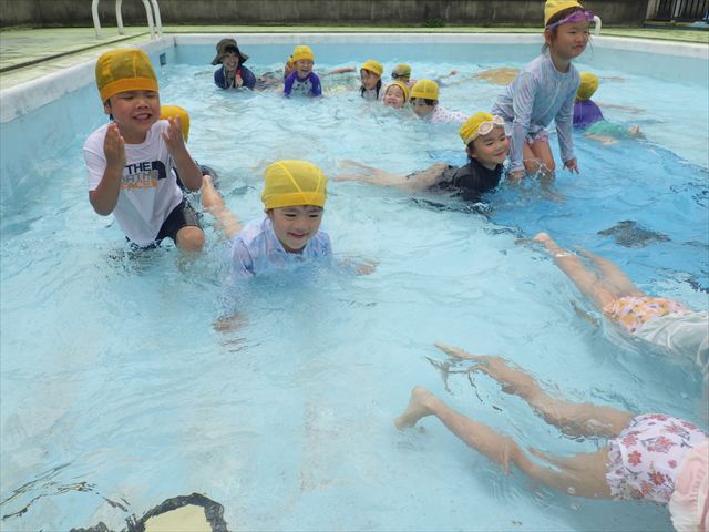 今日はプール遊びをしました。大きいプールにも慣れ楽しむ姿が見られました。水に顔をつけられるお友だちも数名いました\(^o^)/プール遊びの後は算数の時間として1〜5の数のお勉強をしました。1〜5の数字とメロンパンとお友だちを比べっこしました(^^)みんな真剣に取り組んでいました。午後はともえ先生のリトミック教室に参加しました。歩くスピードを音符で教えてもらいました。きれいなスカーフを貸していただき、ボートを漕いだり、海の生き物になったりサメが来たら隠れたり音楽に合わせて楽しむことができました。ともえ先生ありがとうございました(^^)