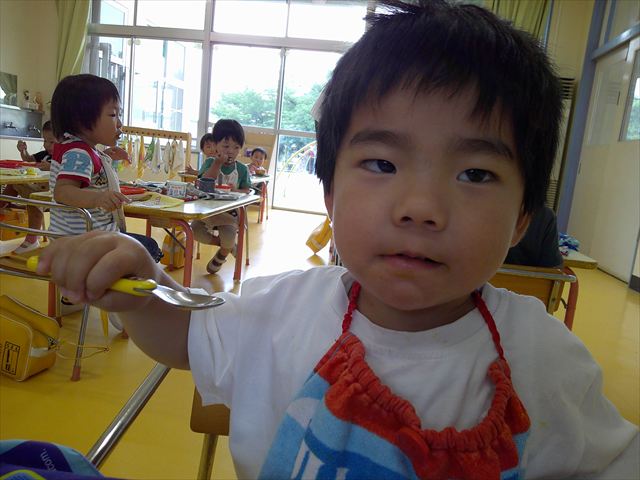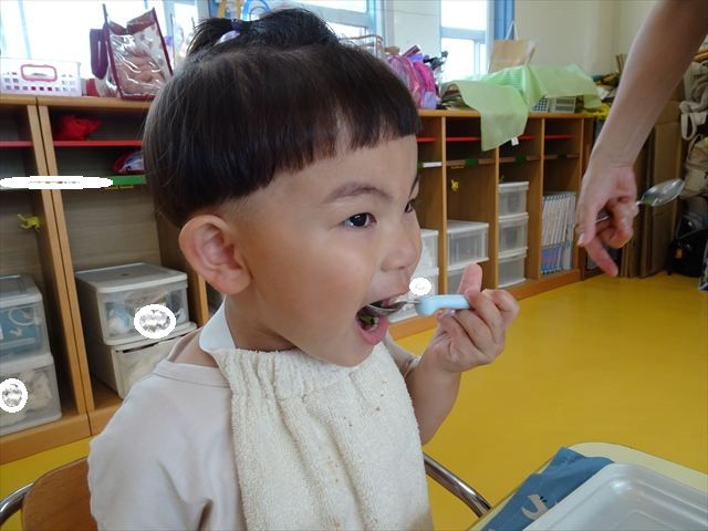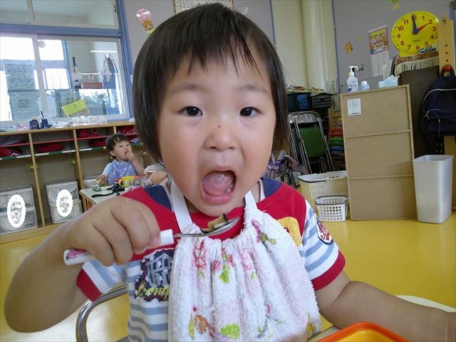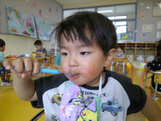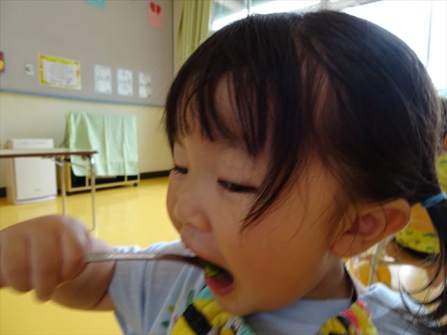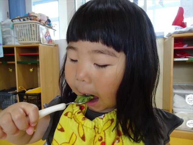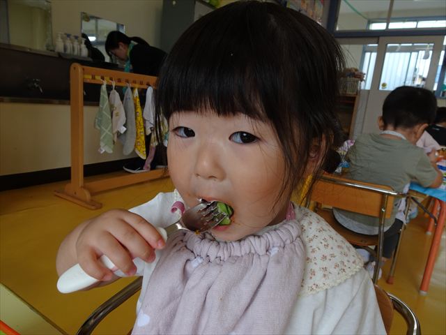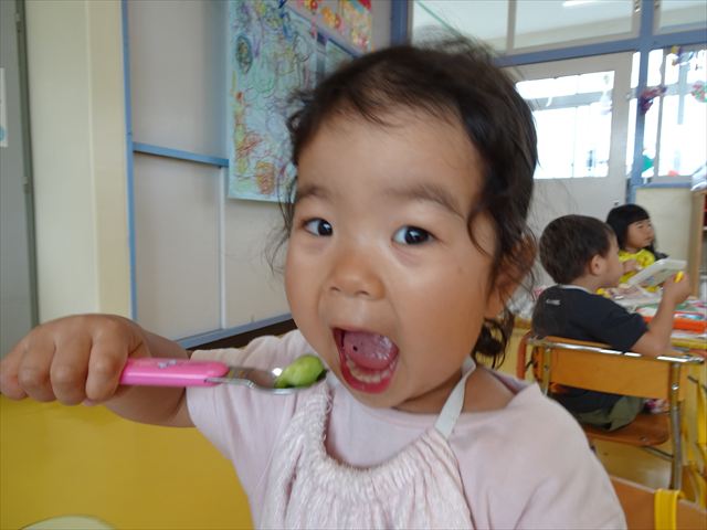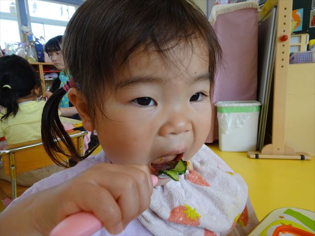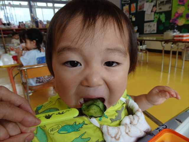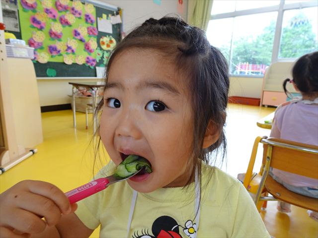 今日は、きゅうり・ズッキーニ・ナスを食べました!ズッキーニはきゅうりと見た目が似ていて「おんなじ?」と混乱するお友だちもいたので、「ズッキーニのお友だちだよ!」と伝えました。どのお野菜もパクパク美味しそうに食べていました(^^)/