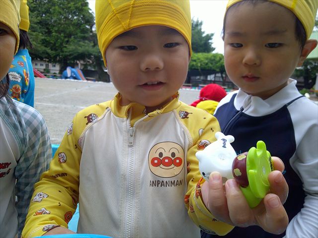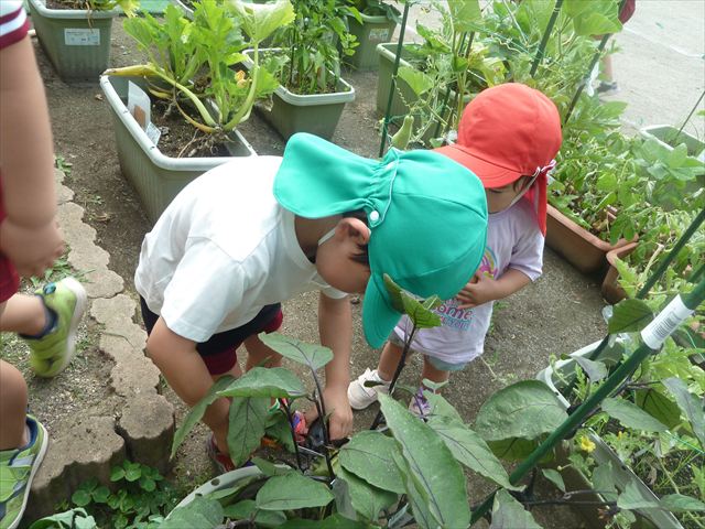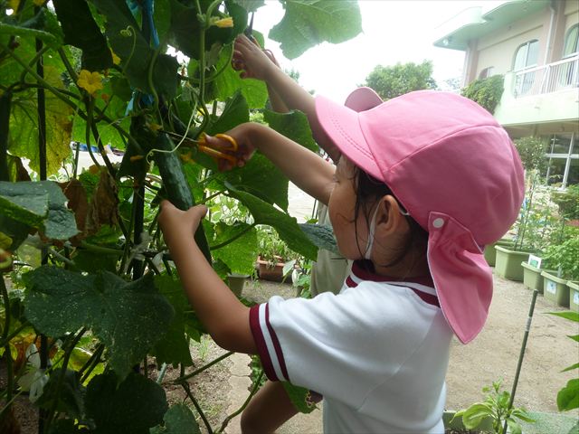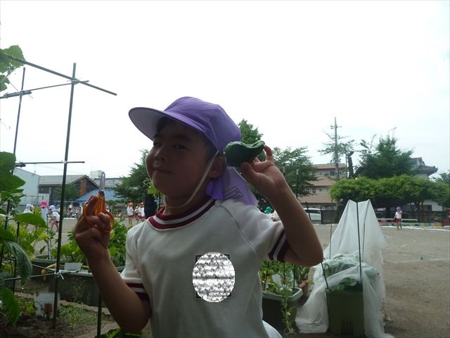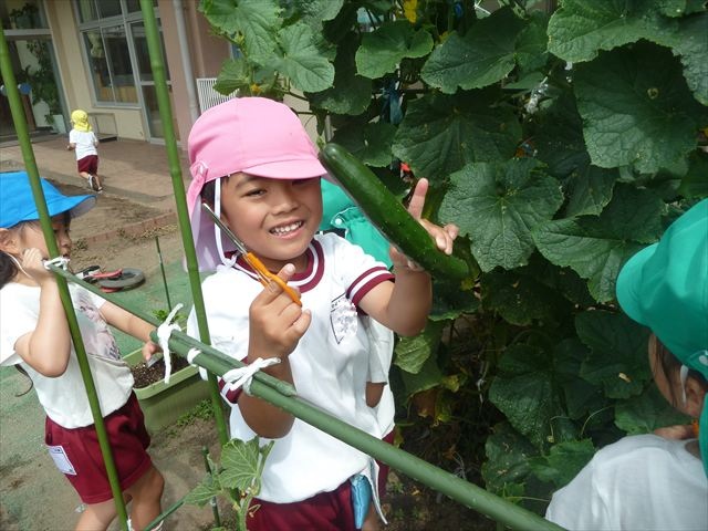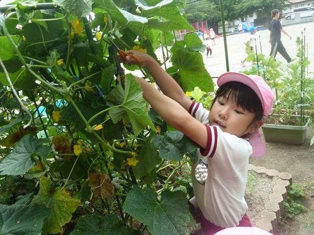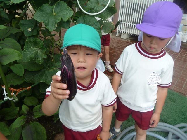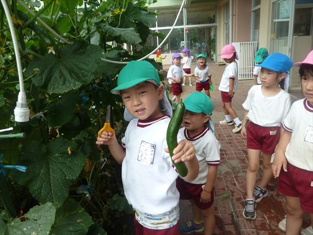 園庭の畑やプランターで育てている「きゅうり」や「なす」、「ピーマン」、「トマト」がまたたくさん実りました。今日は、年長さんや年中さんがたくさん食べましたが余りましたので、園庭の野菜プレゼント第11弾といくことで、保護者の皆さんにまたお裾分けします。(^_^)v 今日は、順番で余ったきゅうり4本を4クラス(うさぎ、たんぽぽA、たんぽぽB、うみ組)に分け、各クラスでくじ引きし(今まで当たったお子さんは除きます。)、大当たりのお子さんそれぞれ1名ずつにプレゼントしました。当たったご家庭は、マイトリーの新鮮無農薬野菜の「きゅうり」をお子さんと一緒に召し上がって下さい。 (^^;) (^_^)v