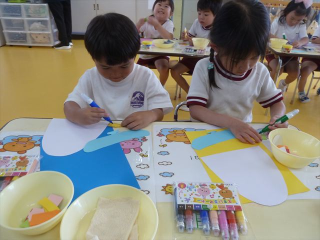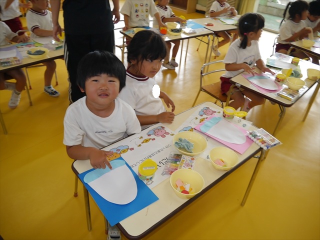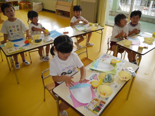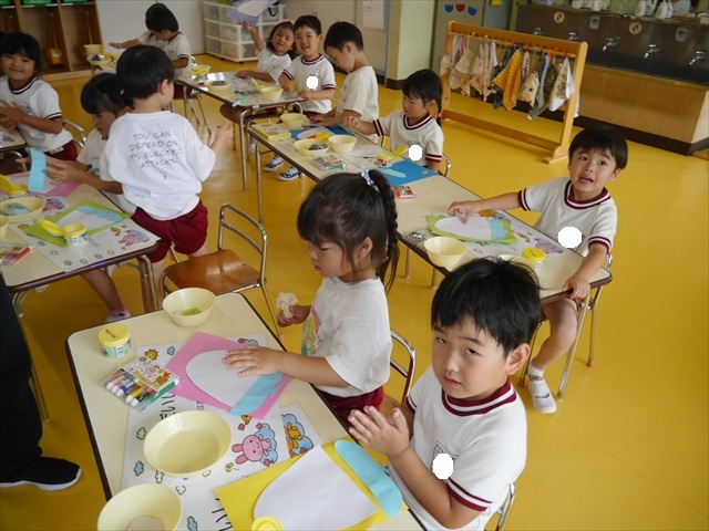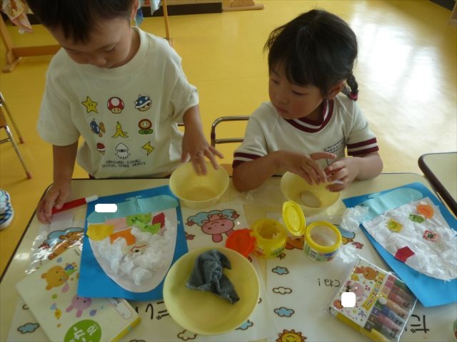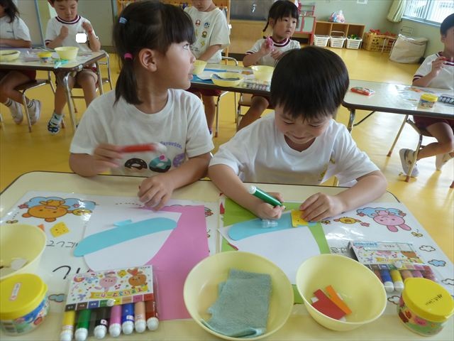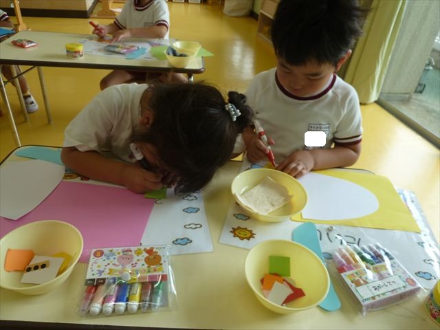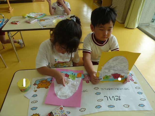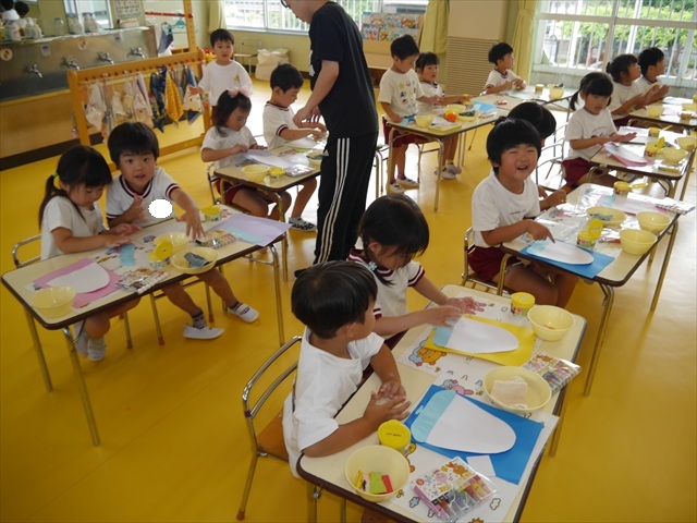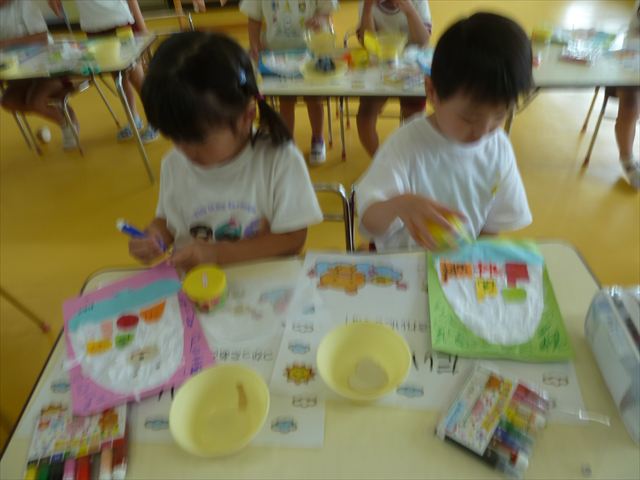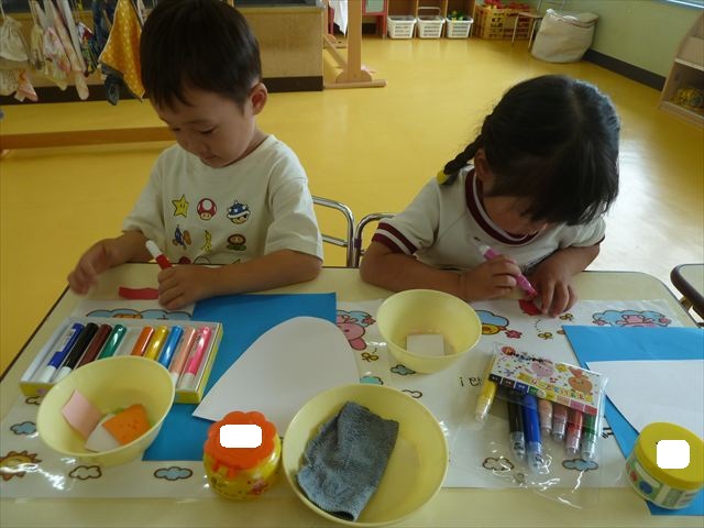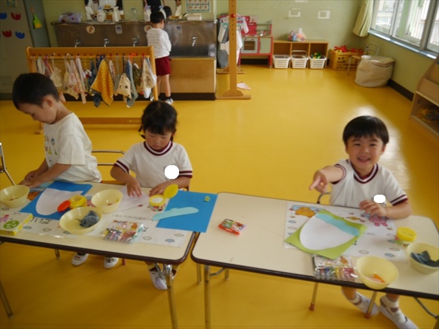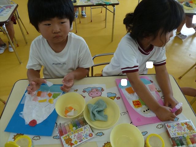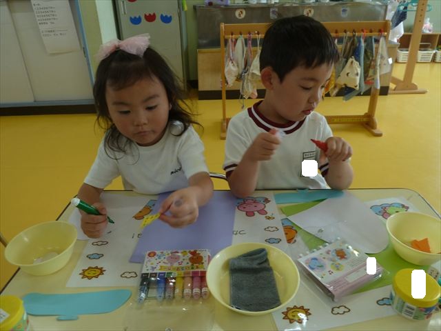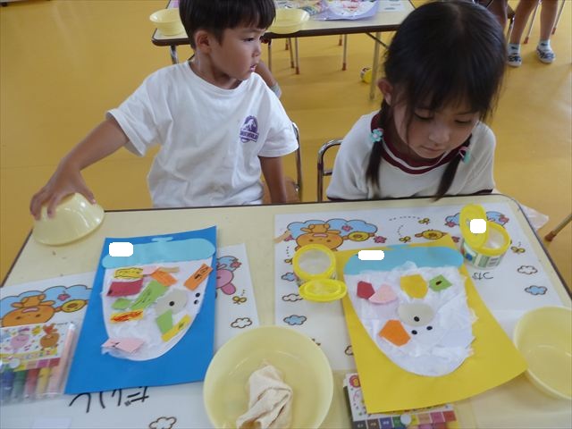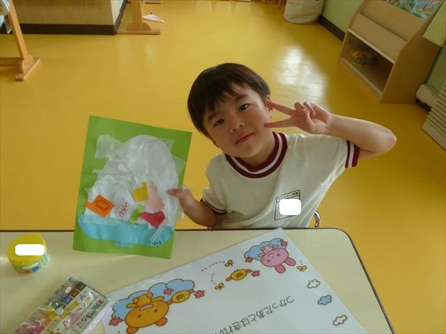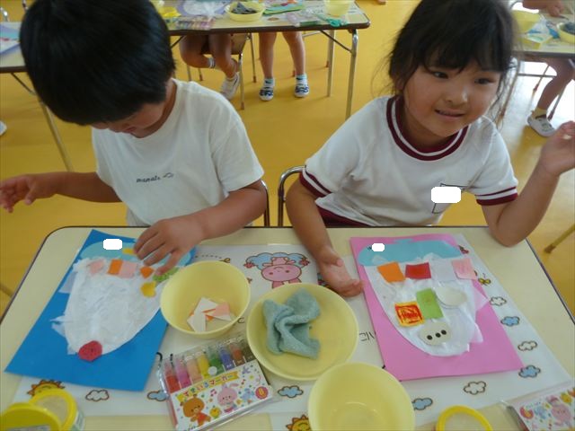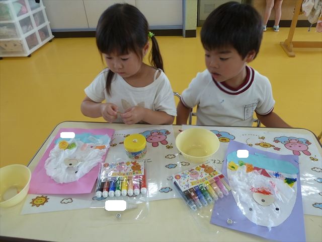 白い土台にお花紙を破って貼るとかき氷の氷のようになり、乗っフルーツは子だもたちがフルーツをイメージして切ったり描いたりしました!世界に一つだけの素敵なかき氷ができました!後日持ち帰りたいと思います。