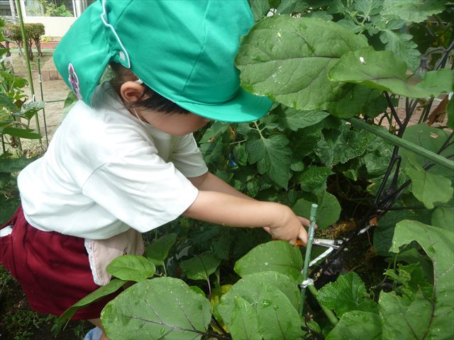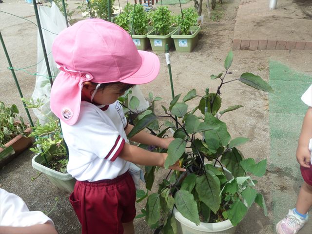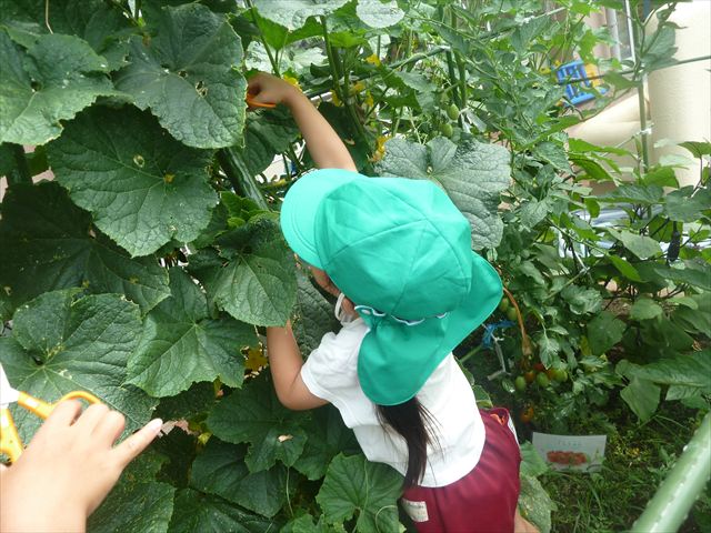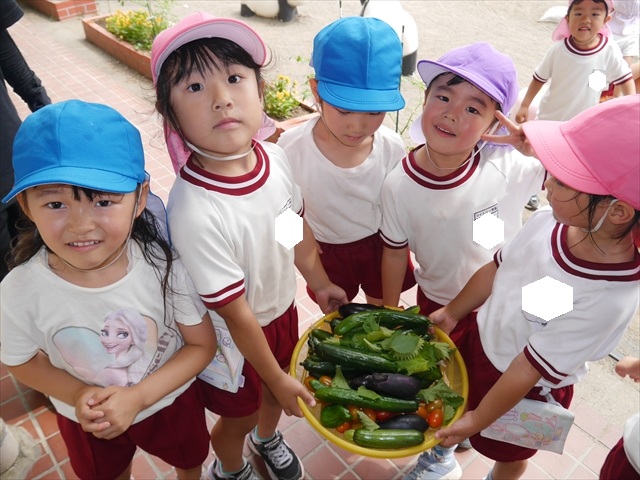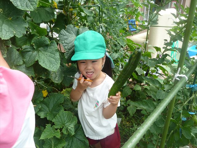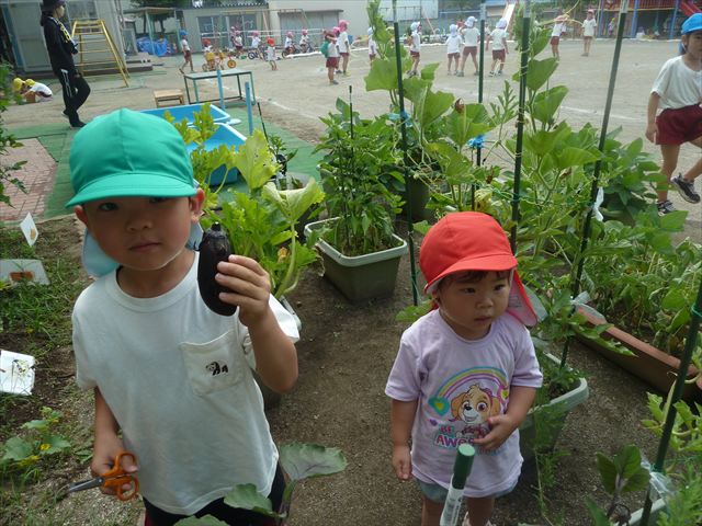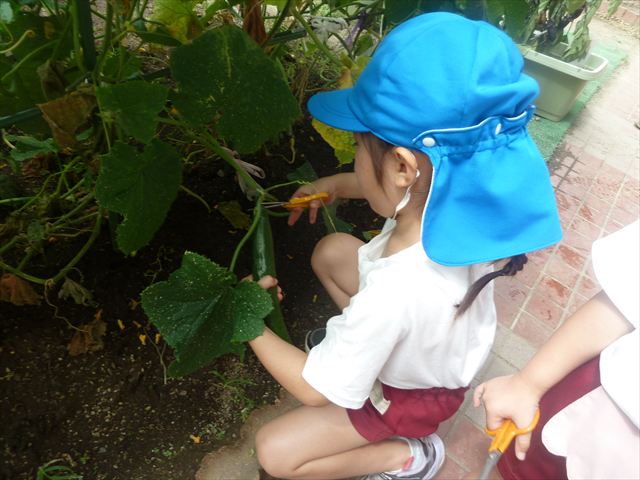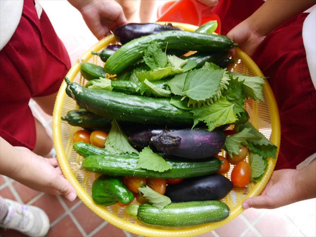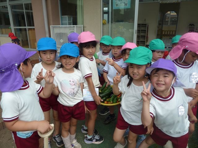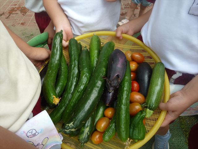 今日は年長さん・年中さんでたくさんの野菜を収穫しました。きゅうりの塩もみとミニトマトを食べましたが、今日も蒸し暑い日だったのでみんな喜んで食べていました☆苦手な子も一口チャレンジ頑張りました!