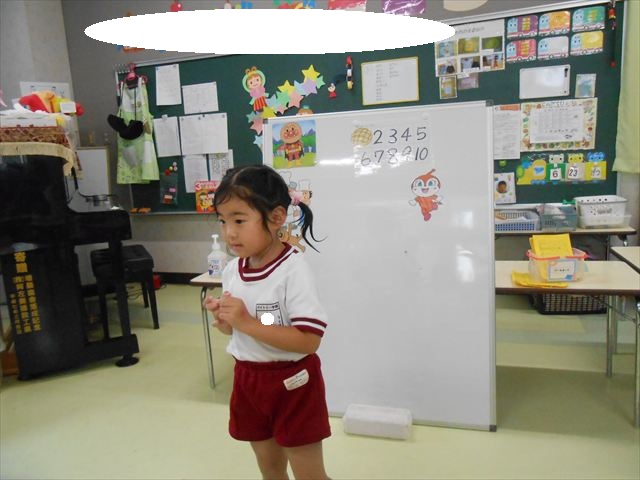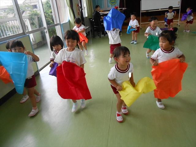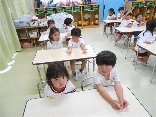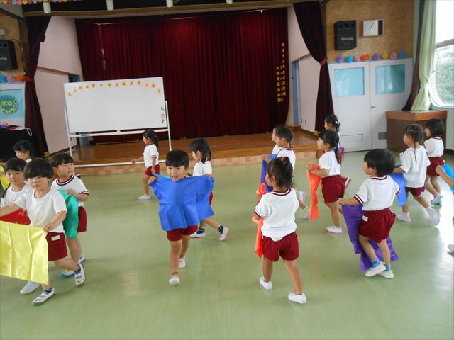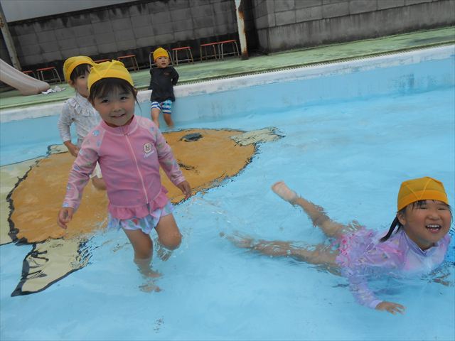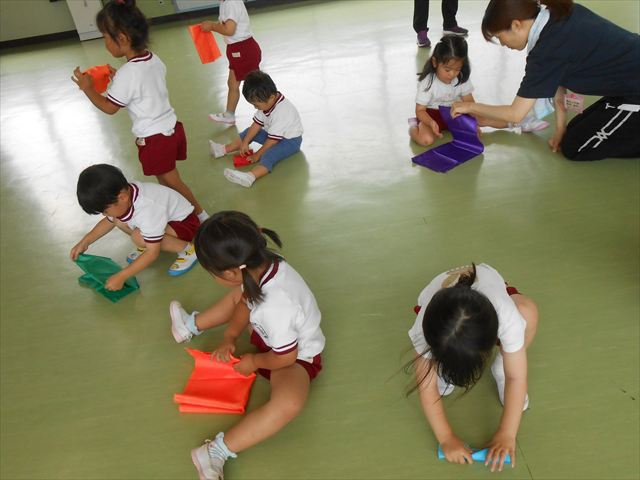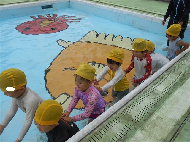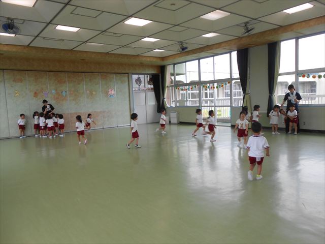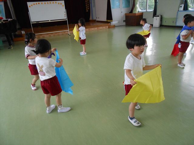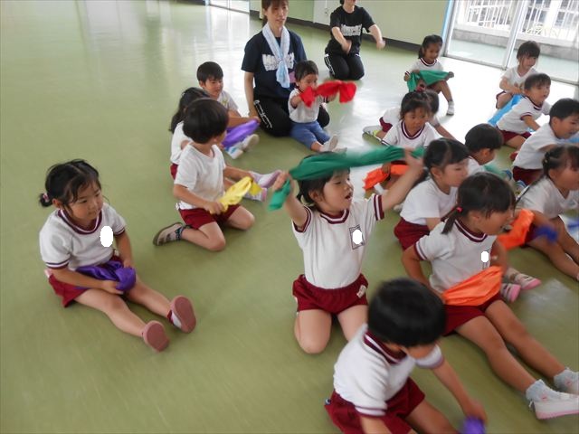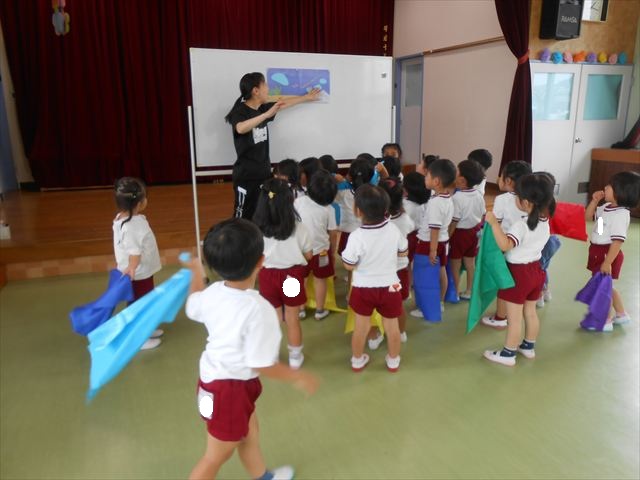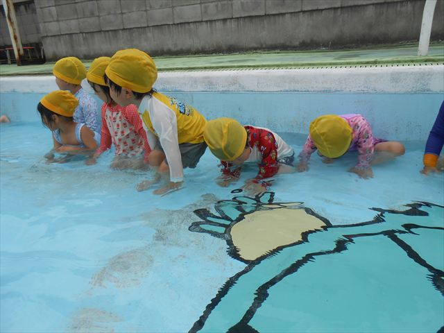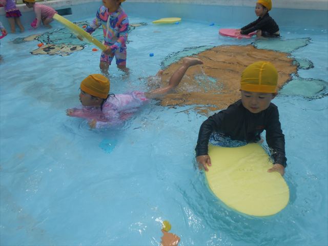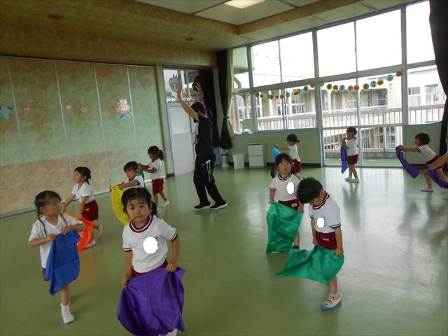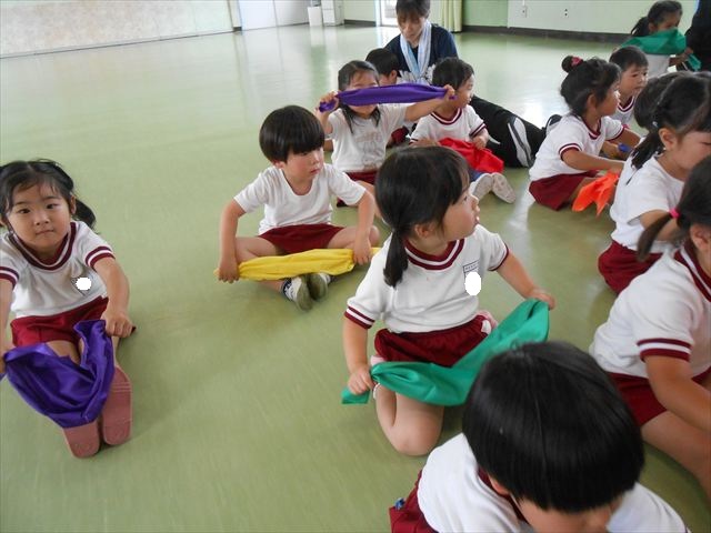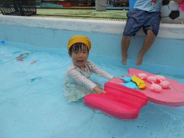 今日はプール遊びをしました。大きいプールにも慣れ楽しむ姿が見られました。水に顔をつけられるお友だちも数名いました\(^o^)/プール遊びの後は算数の時間として1〜5の数のお勉強をしました。1〜5の数字とメロンパンとお友だちを比べっこしました(^^)みんな真剣に取り組んでいました。午後はともえ先生のリトミック教室に参加しました。歩くスピードを音符で教えてもらいました。きれいなスカーフを貸していただき、ボートを漕いだり、海の生き物になったりサメが来たら隠れたり音楽に合わせて楽しむことができました。ともえ先生ありがとうございました(^^)