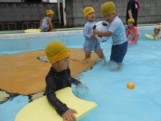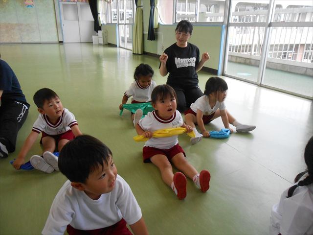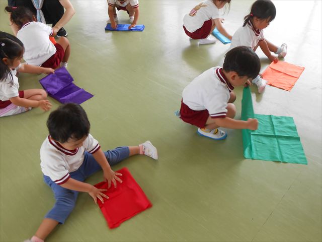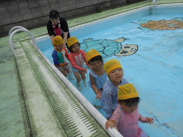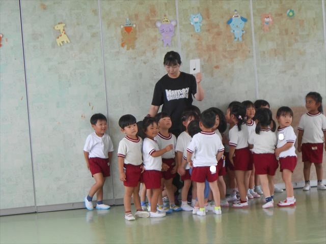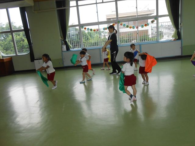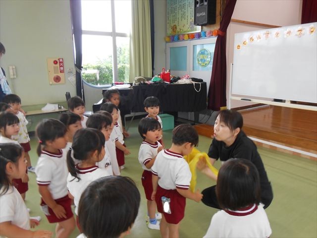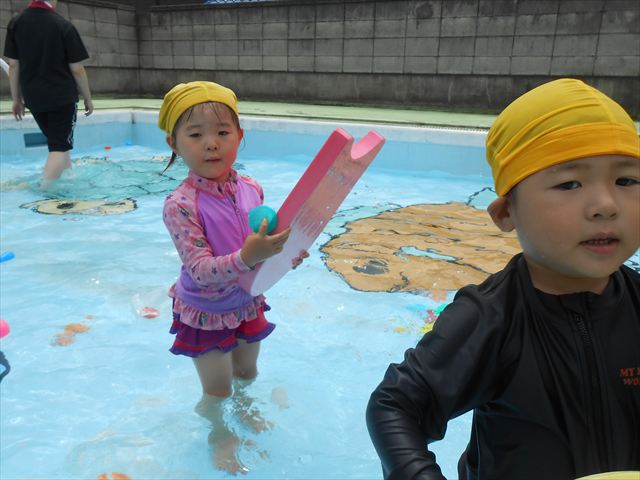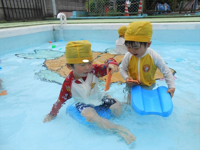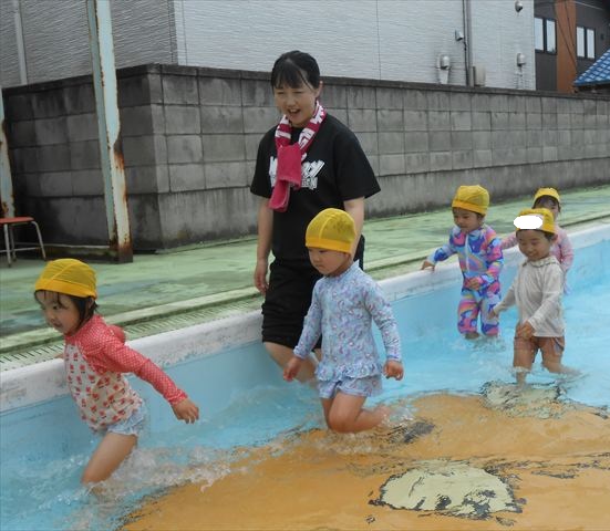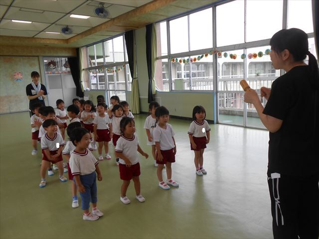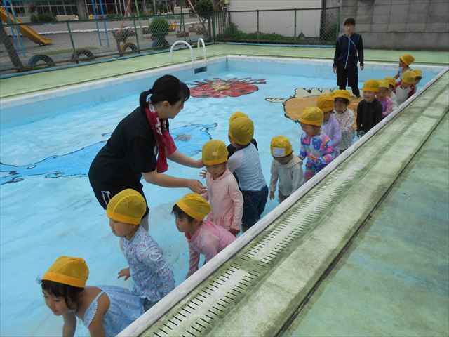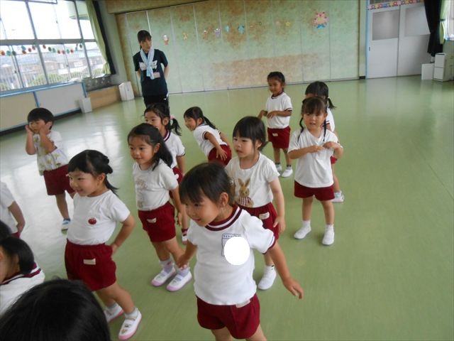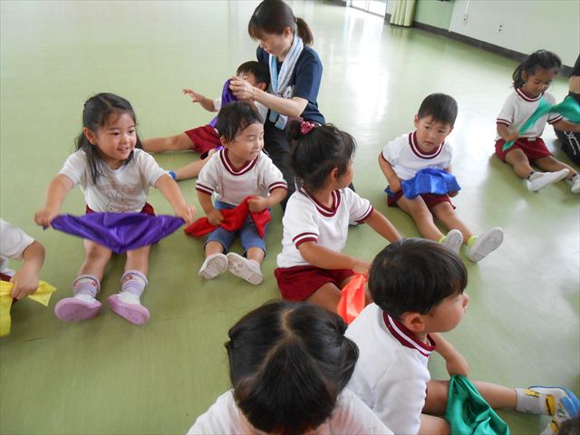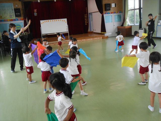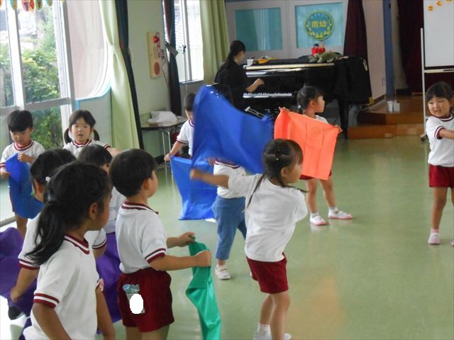 今日はプール遊びをしました。大きいプールにも慣れ楽しむ姿が見られました。水に顔をつけられるお友だちも数名いました\(^o^)/プール遊びの後は算数の時間として1〜5の数のお勉強をしました。1〜5の数字とメロンパンとお友だちを比べっこしました(^^)みんな真剣に取り組んでいました。午後はともえ先生のリトミック教室に参加しました。歩くスピードを音符で教えてもらいました。きれいなスカーフを貸していただき、ボートを漕いだり、海の生き物になったりサメが来たら隠れたり音楽に合わせて楽しむことができました。ともえ先生ありがとうございました(^^)