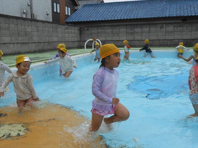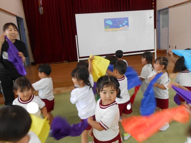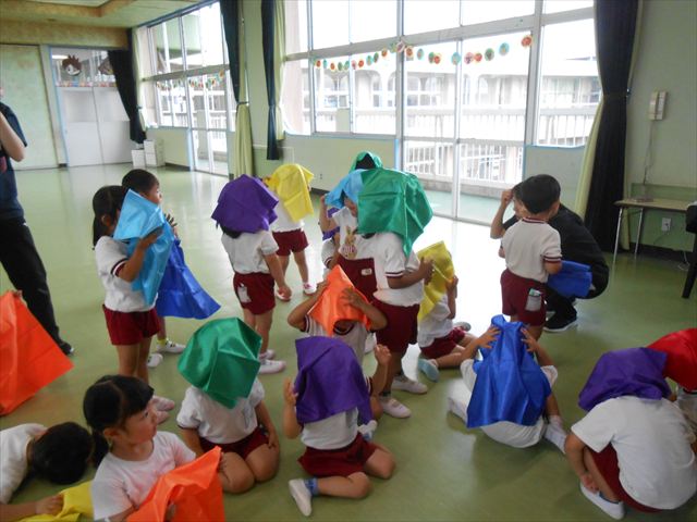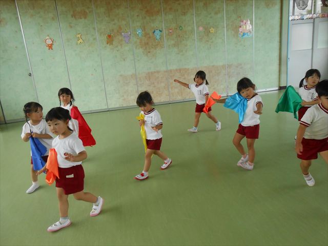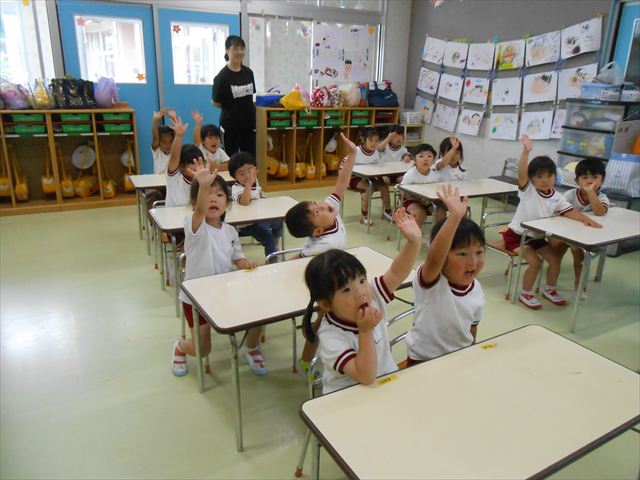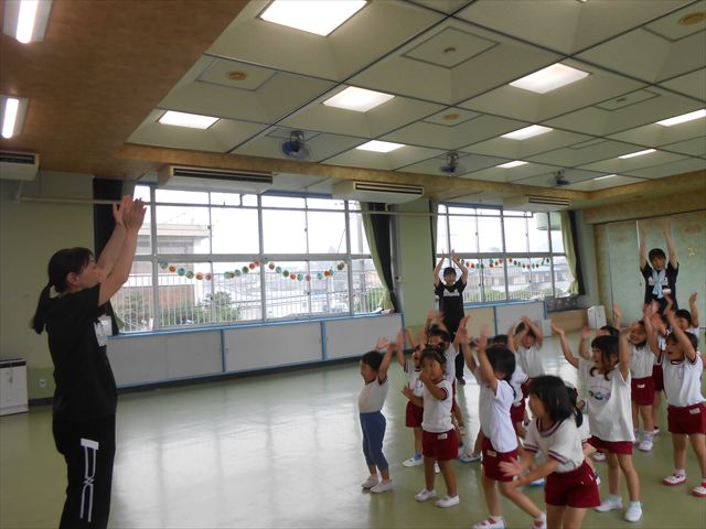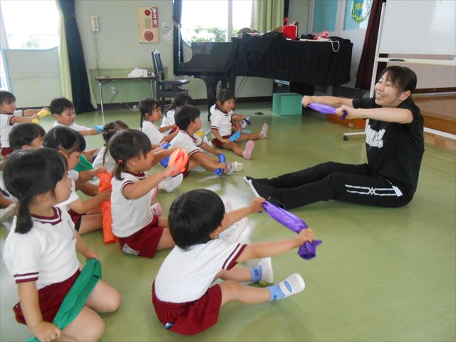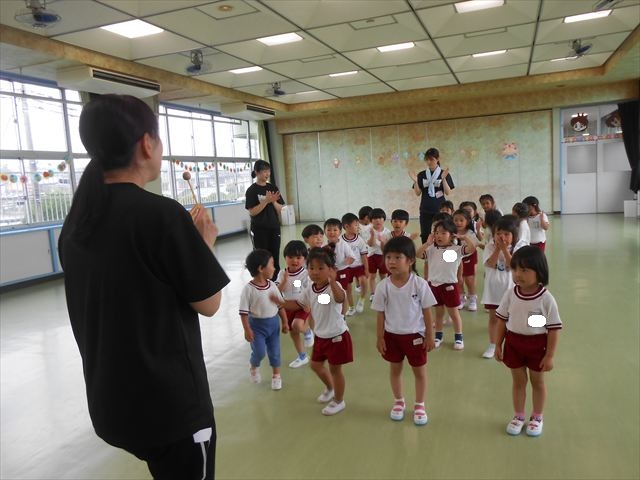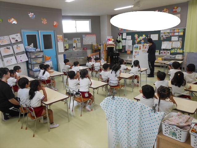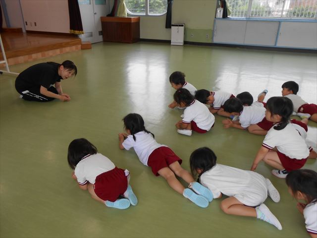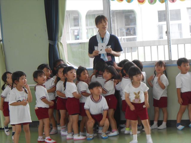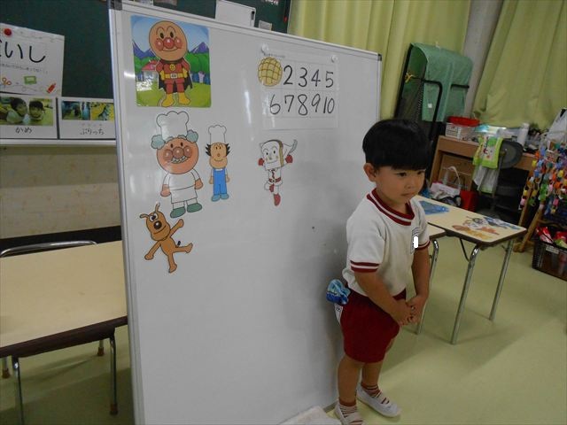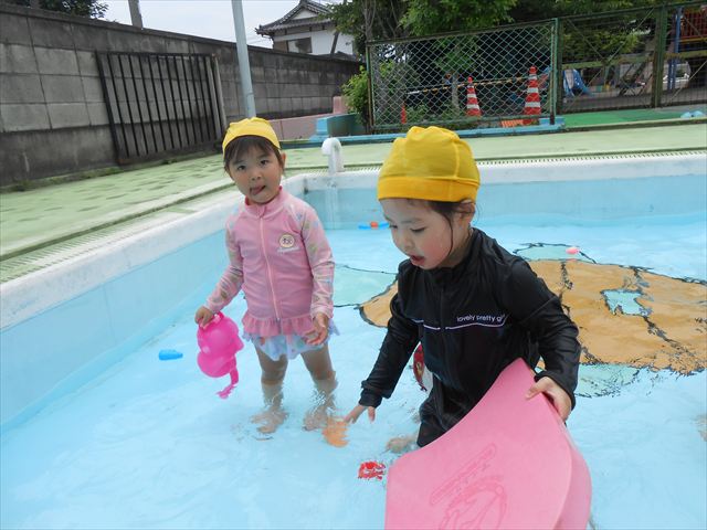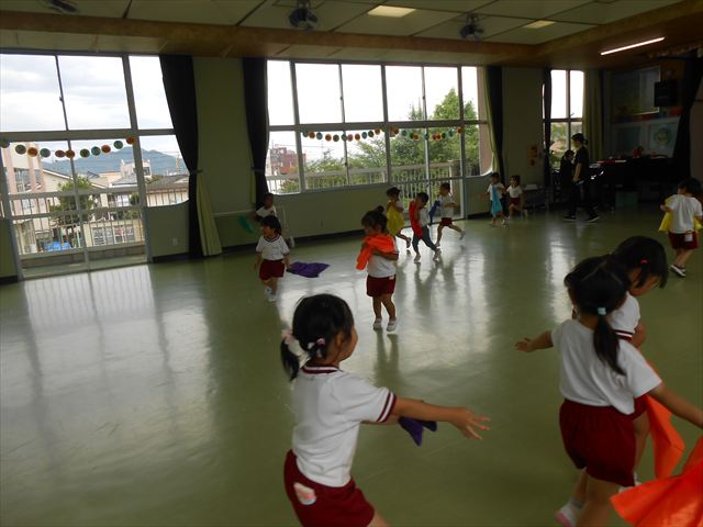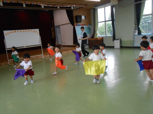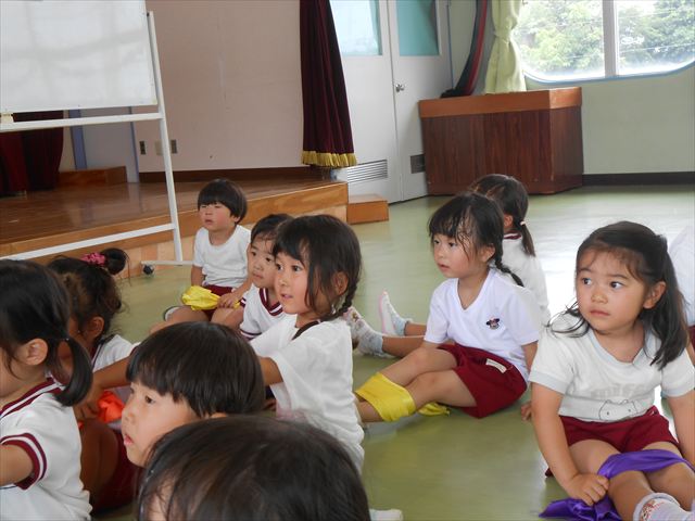 今日はプール遊びをしました。大きいプールにも慣れ楽しむ姿が見られました。水に顔をつけられるお友だちも数名いました\(^o^)/プール遊びの後は算数の時間として1〜5の数のお勉強をしました。1〜5の数字とメロンパンとお友だちを比べっこしました(^^)みんな真剣に取り組んでいました。午後はともえ先生のリトミック教室に参加しました。歩くスピードを音符で教えてもらいました。きれいなスカーフを貸していただき、ボートを漕いだり、海の生き物になったりサメが来たら隠れたり音楽に合わせて楽しむことができました。ともえ先生ありがとうございました(^^)