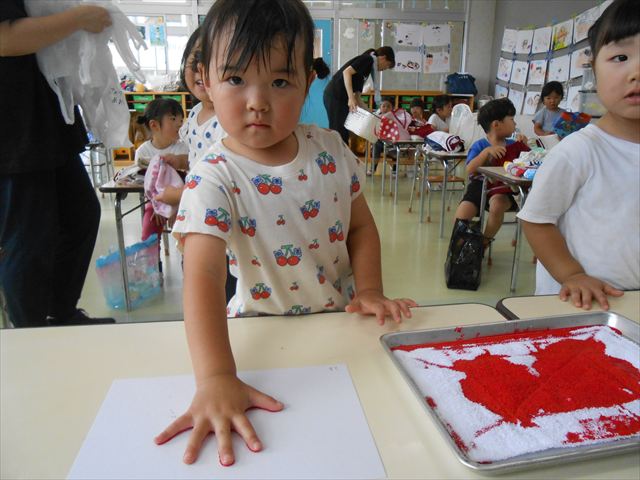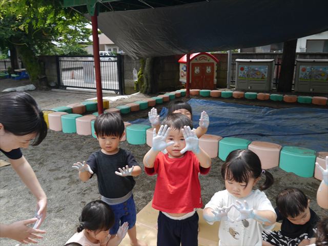 今日は天気も良く、絶好のペイント、泥遊び!まず、ペイント遊びとしてお部屋で手形、足形をスタンプしました(