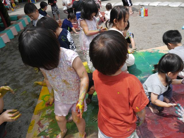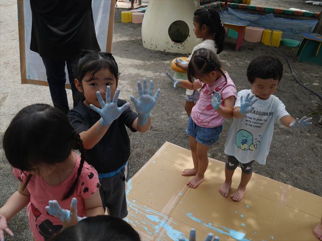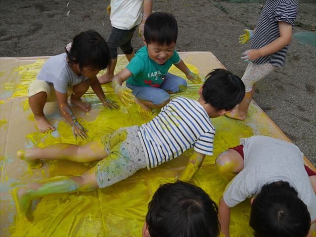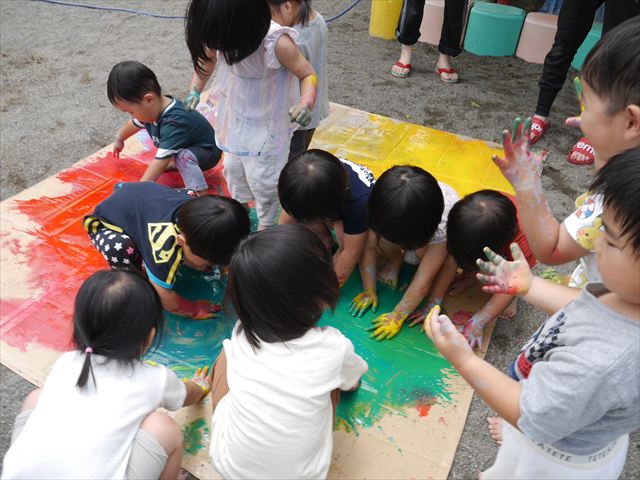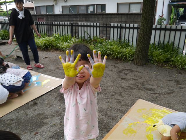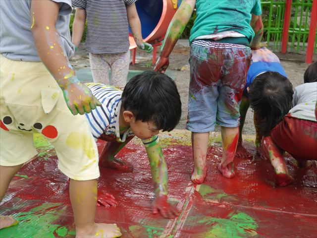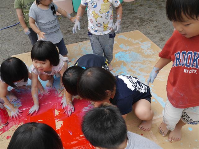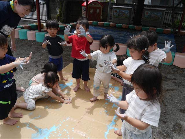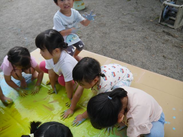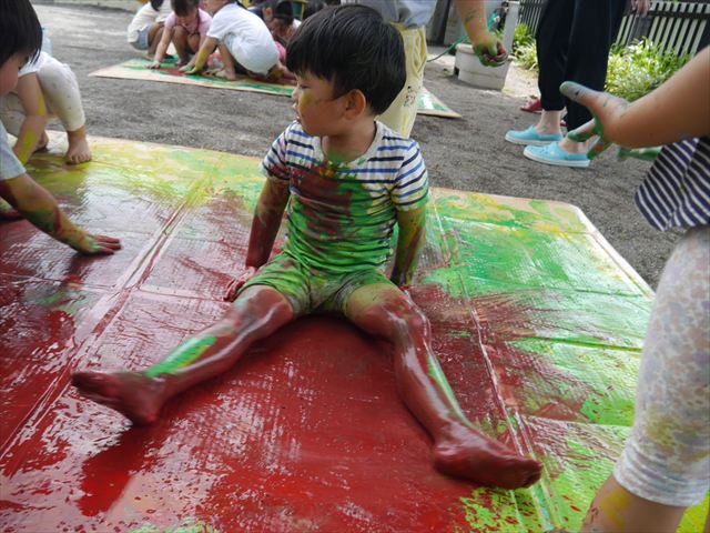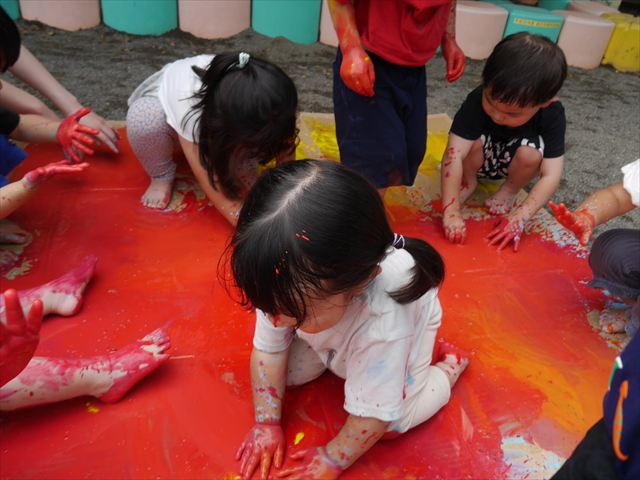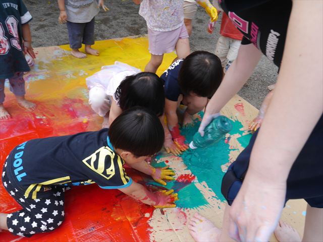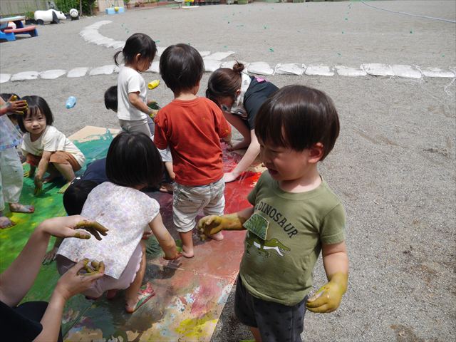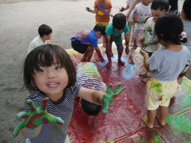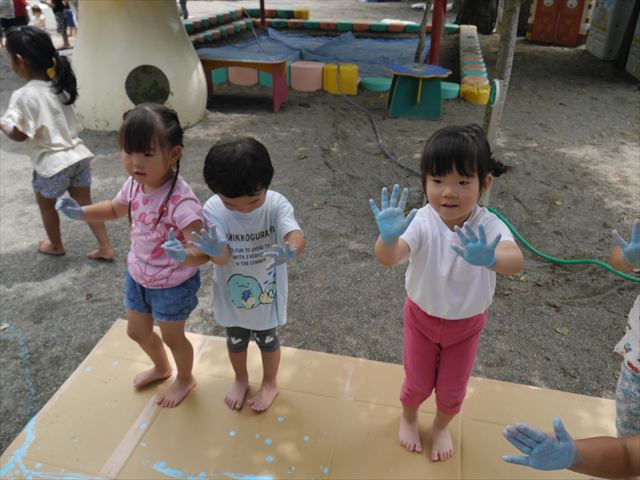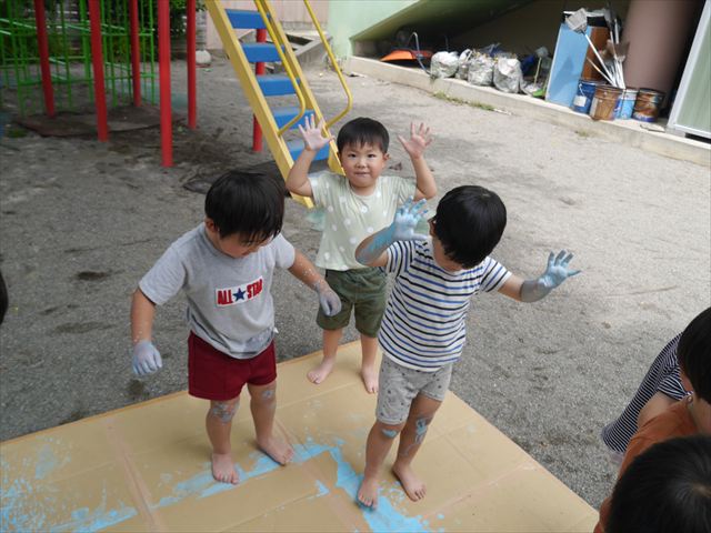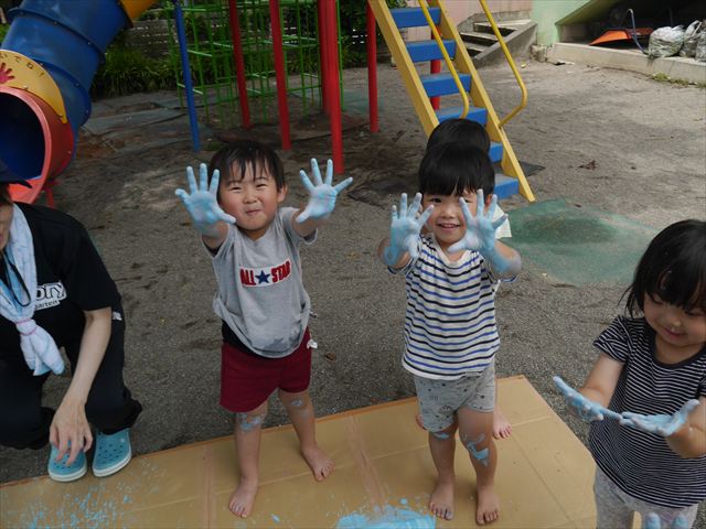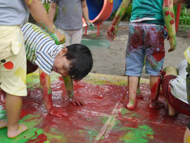 ^^)そのあと外に出て園長先生のお話を聞いたあとペイント遊びをしました。まずは白い模造紙に水色の絵の具とみんなの手で海を作りました。きゃー気持ちいい〜と興奮!そのあと、段ボールに黄色、みどり、赤の絵の具を使って手と足でペイント遊びを楽しみました(