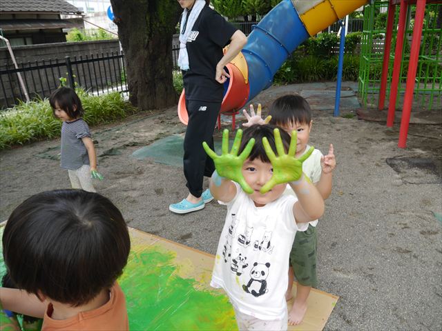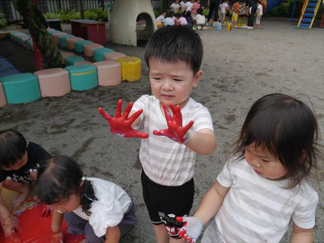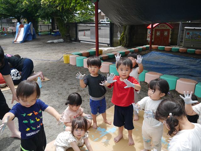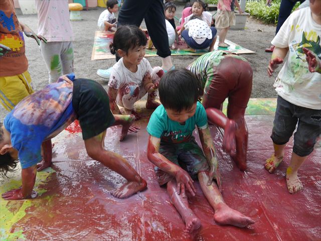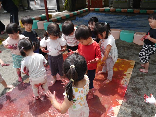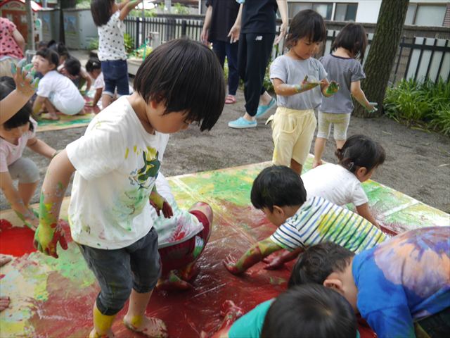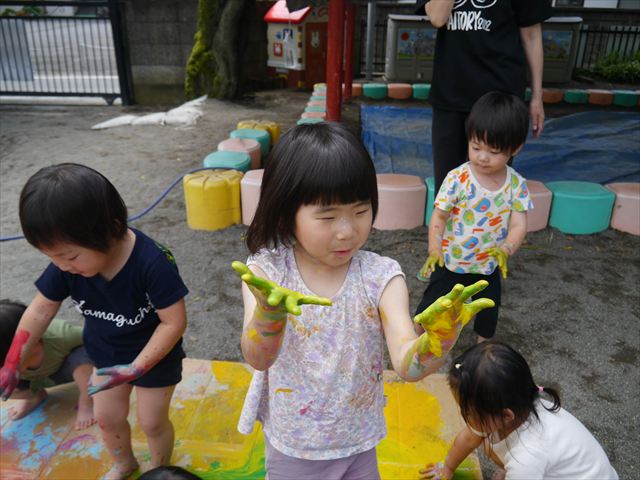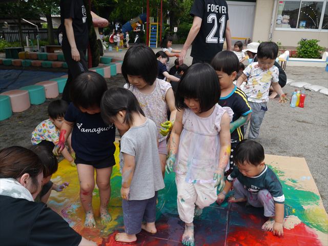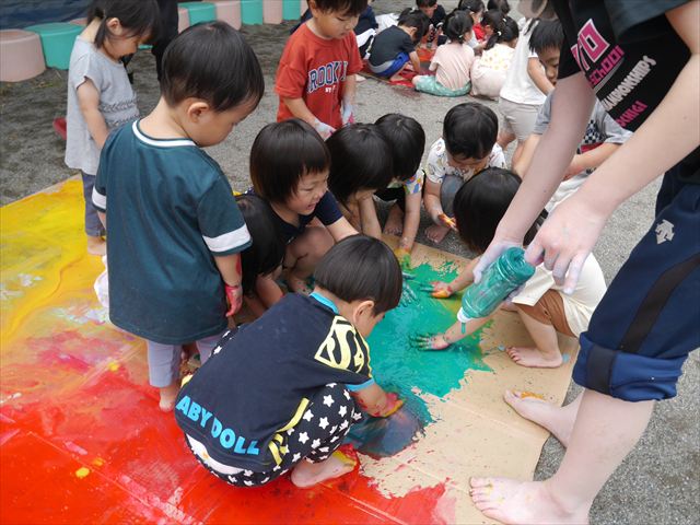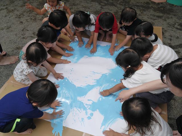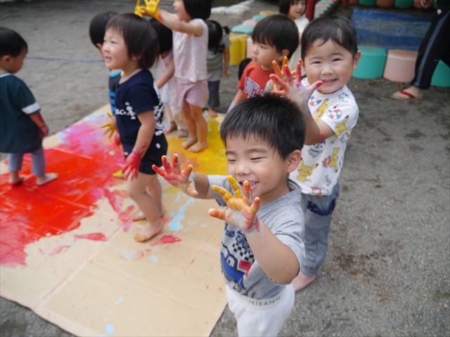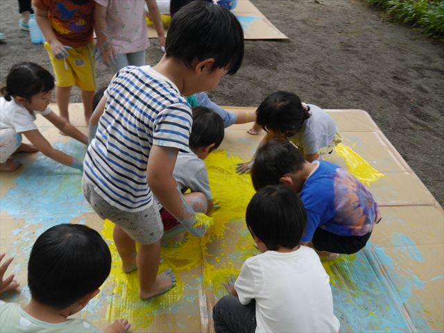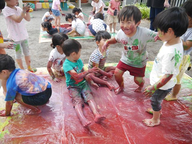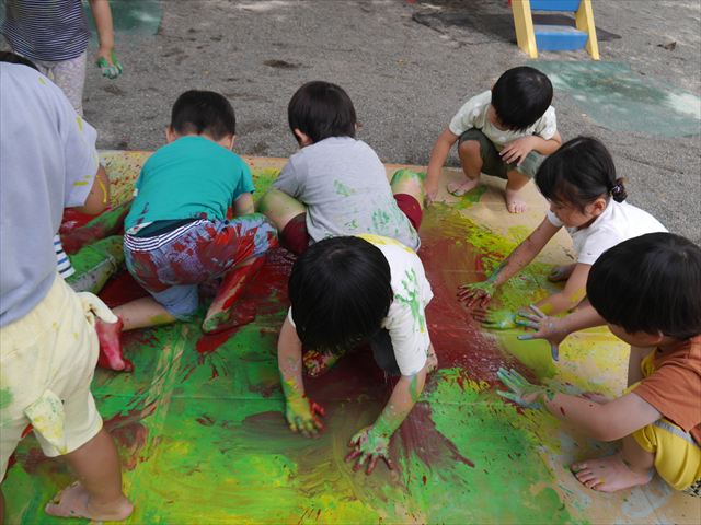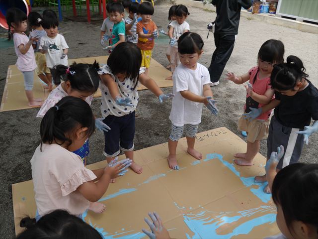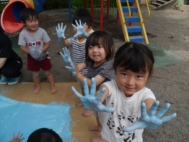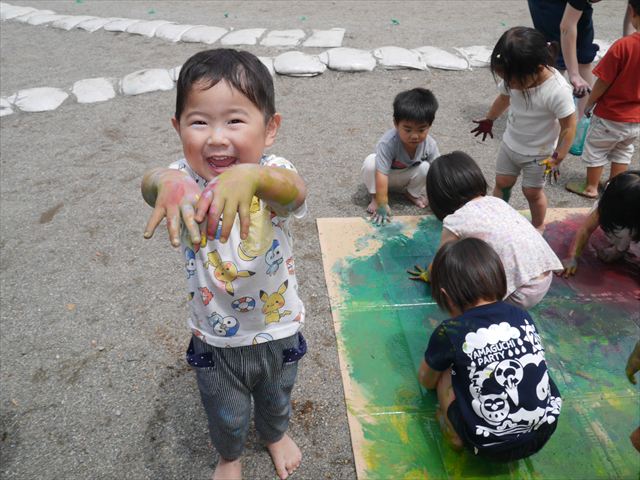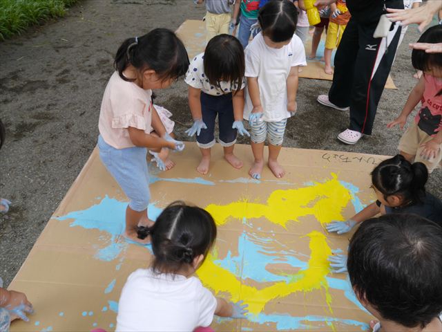 ^^)そのあと外に出て園長先生のお話を聞いたあとペイント遊びをしました。まずは白い模造紙に水色の絵の具とみんなの手で海を作りました。きゃー気持ちいい〜と興奮!そのあと、段ボールに黄色、みどり、赤の絵の具を使って手と足でペイント遊びを楽しみました(