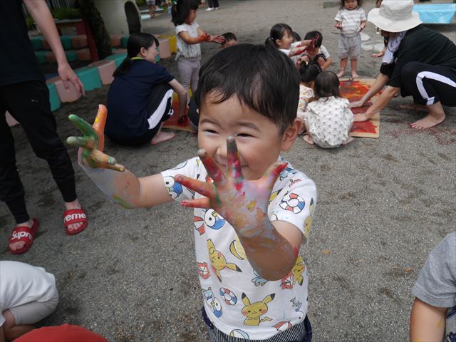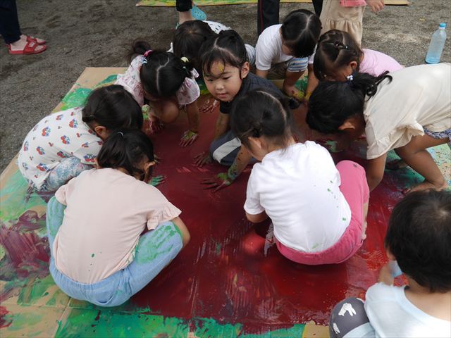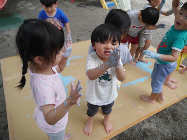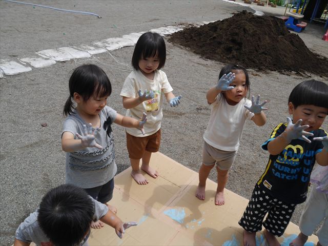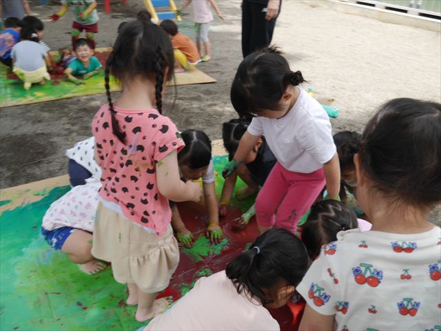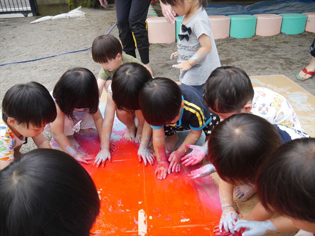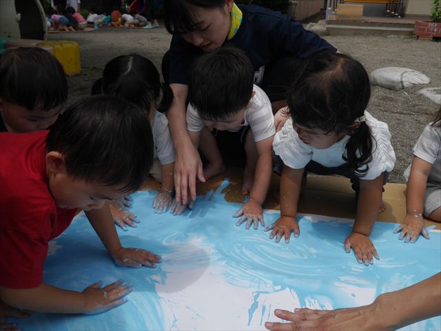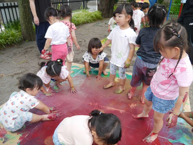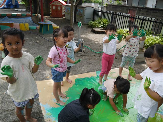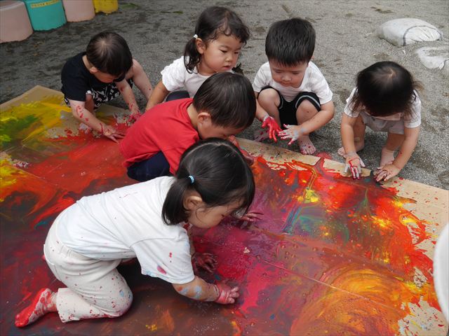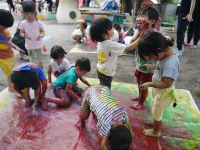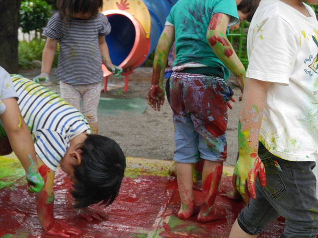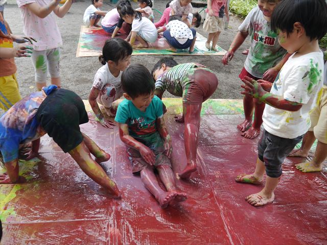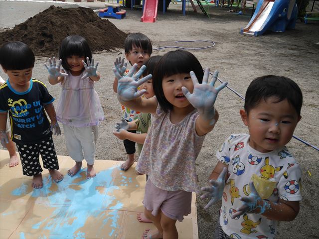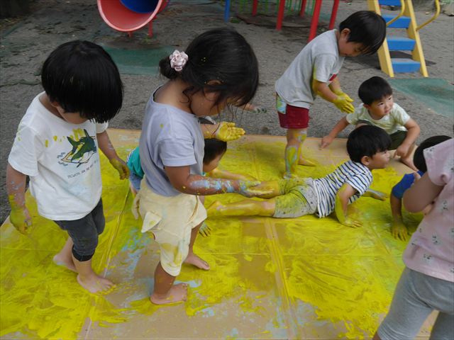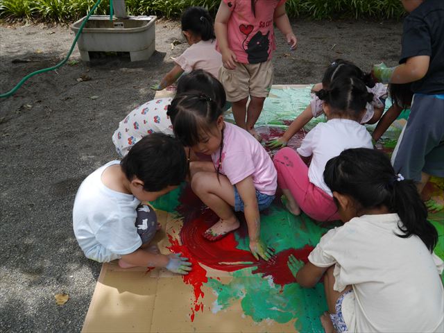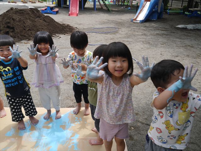 ^^)そのあと外に出て園長先生のお話を聞いたあとペイント遊びをしました。まずは白い模造紙に水色の絵の具とみんなの手で海を作りました。きゃー気持ちいい〜と興奮!そのあと、段ボールに黄色、みどり、赤の絵の具を使って手と足でペイント遊びを楽しみました(