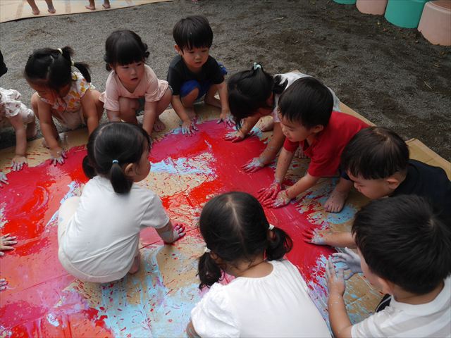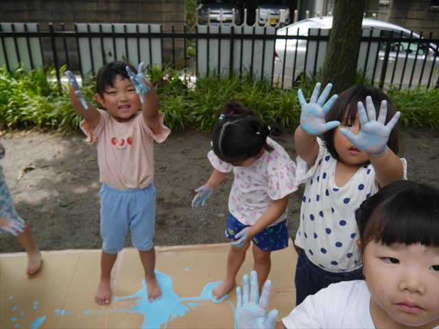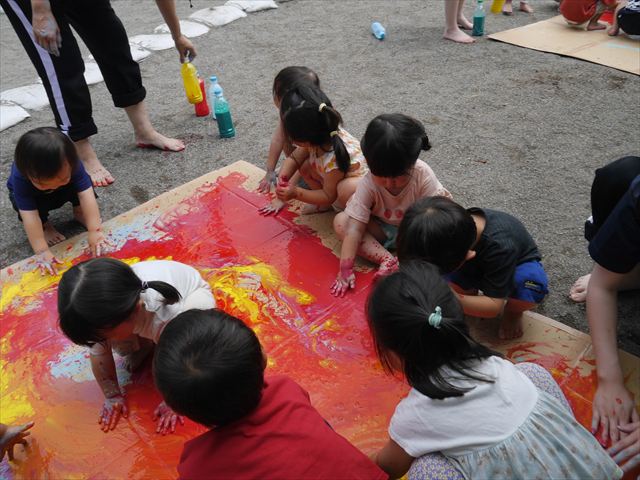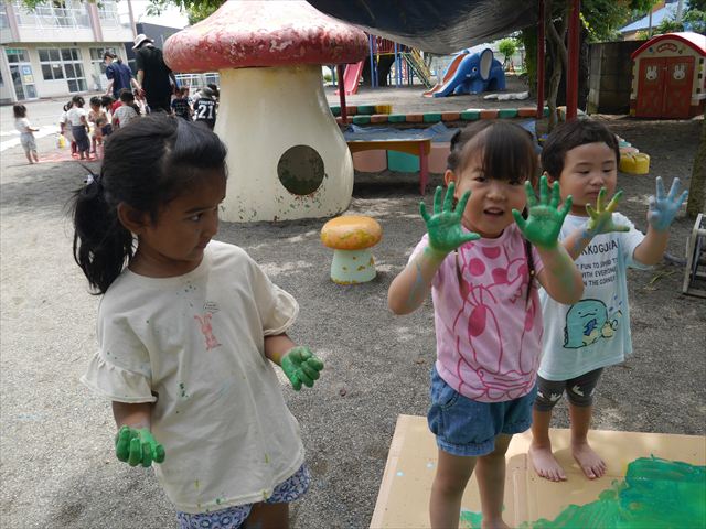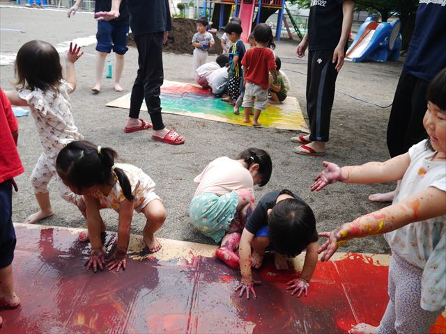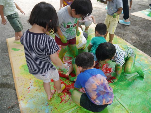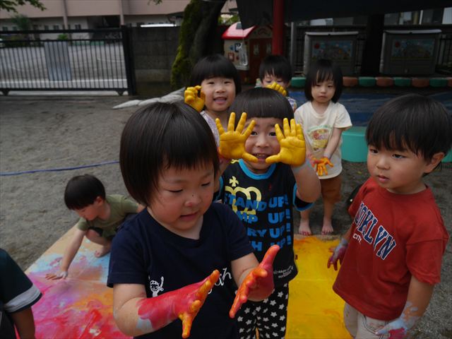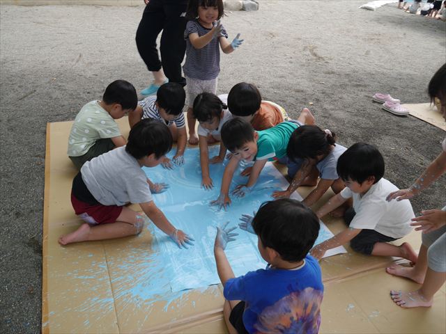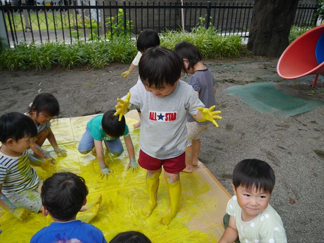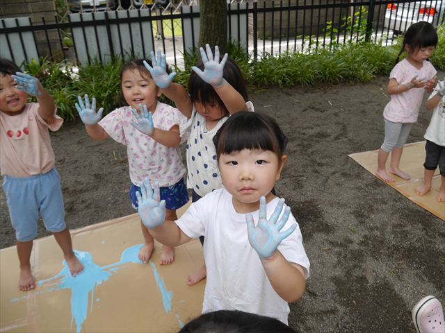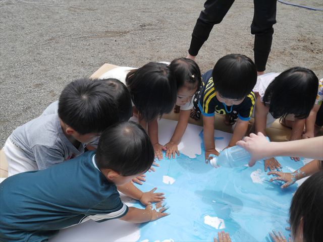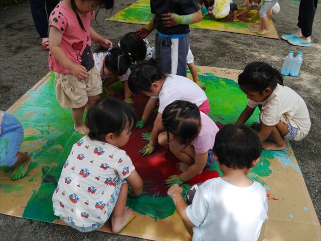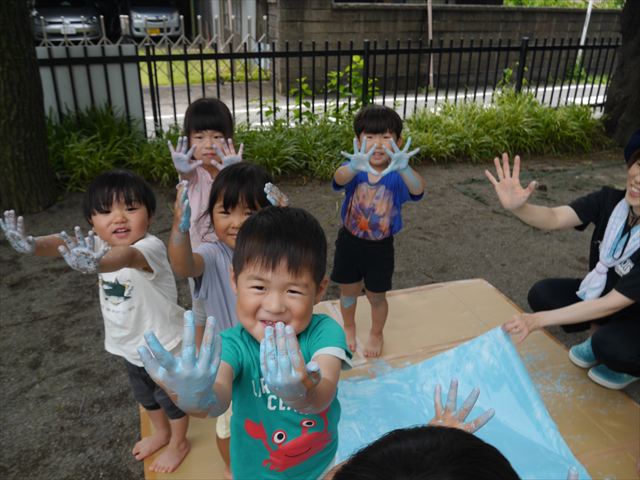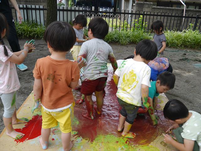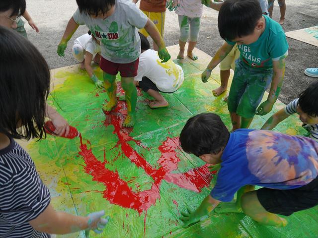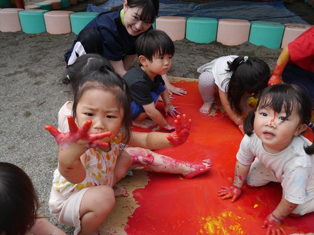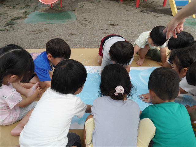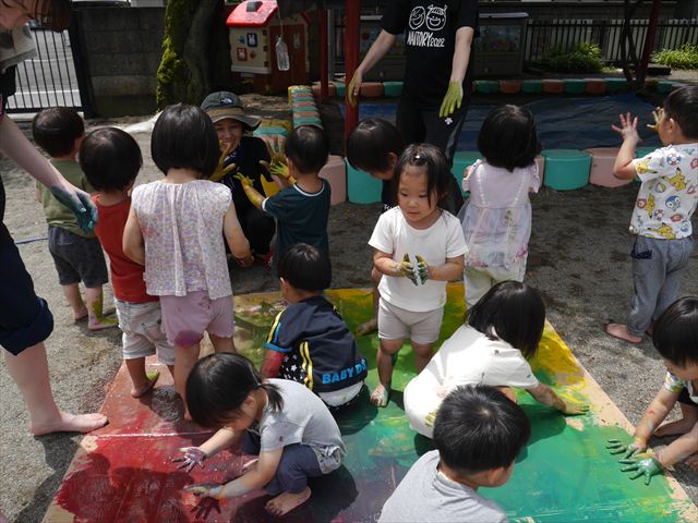 ^^)そのあと外に出て園長先生のお話を聞いたあとペイント遊びをしました。まずは白い模造紙に水色の絵の具とみんなの手で海を作りました。きゃー気持ちいい〜と興奮!そのあと、段ボールに黄色、みどり、赤の絵の具を使って手と足でペイント遊びを楽しみました(