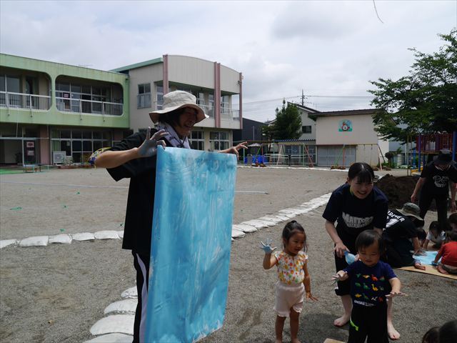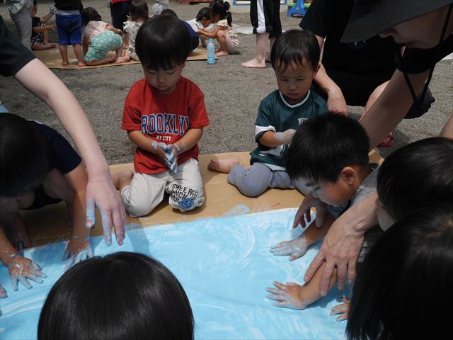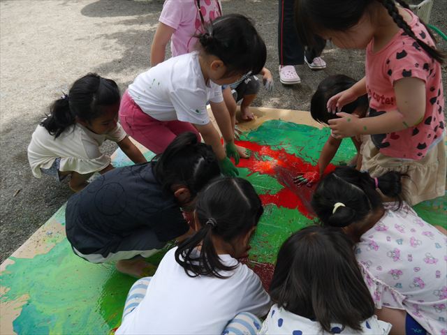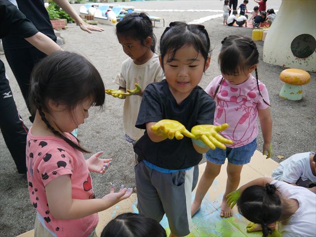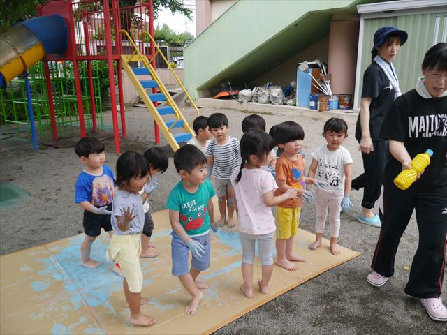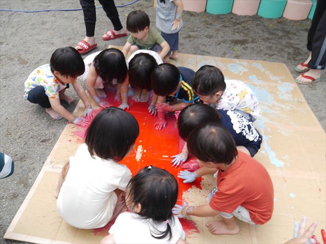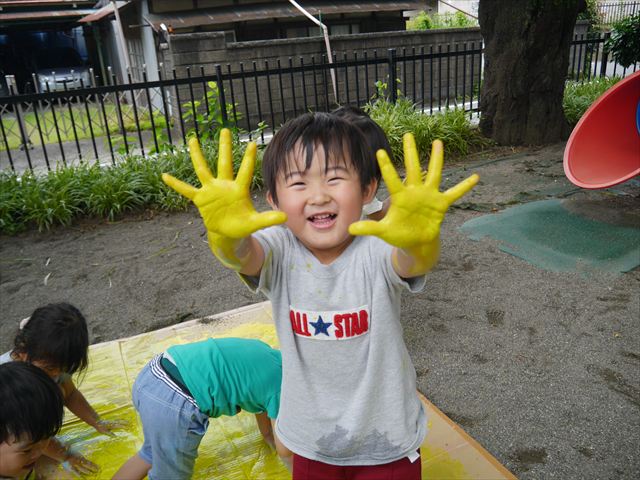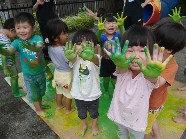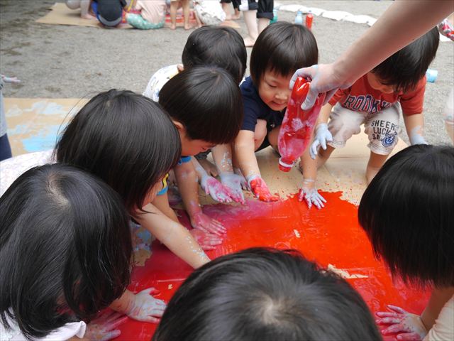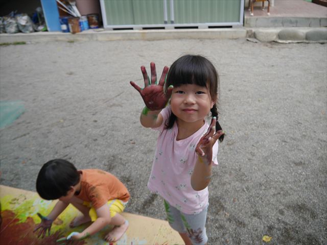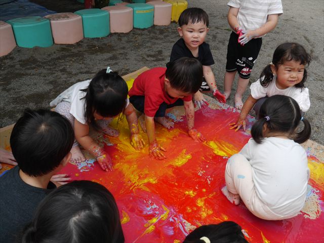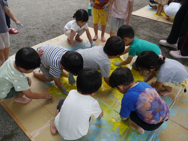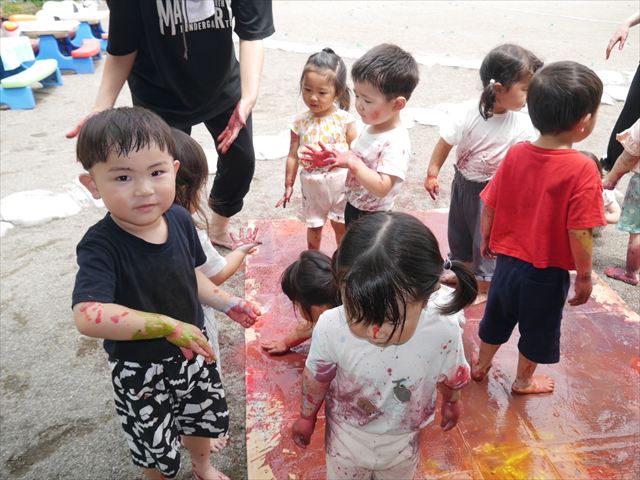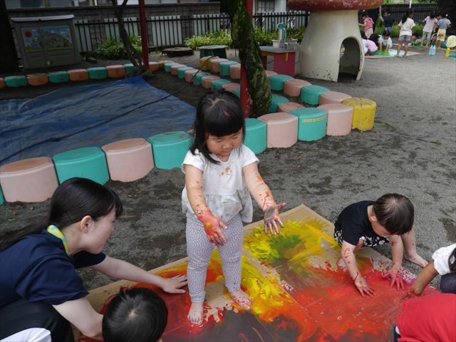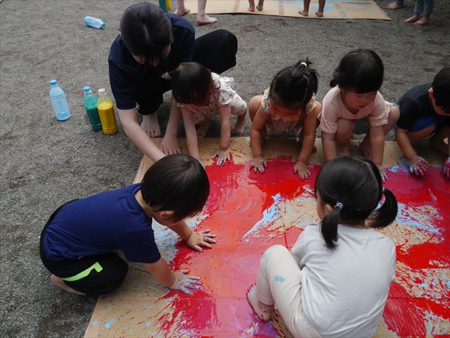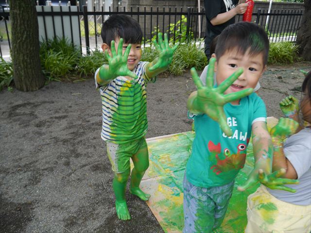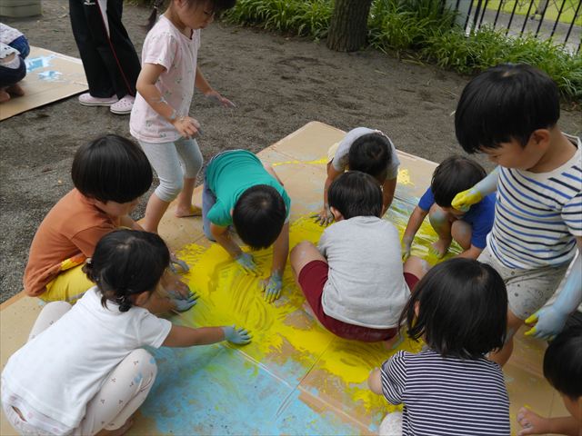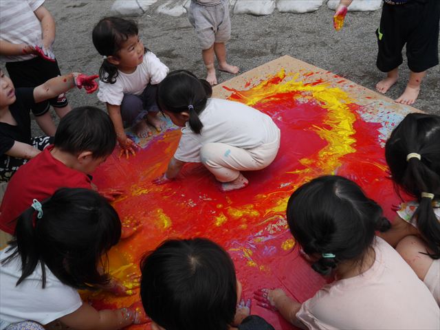 ^^)そのあと外に出て園長先生のお話を聞いたあとペイント遊びをしました。まずは白い模造紙に水色の絵の具とみんなの手で海を作りました。きゃー気持ちいい〜と興奮!そのあと、段ボールに黄色、みどり、赤の絵の具を使って手と足でペイント遊びを楽しみました(