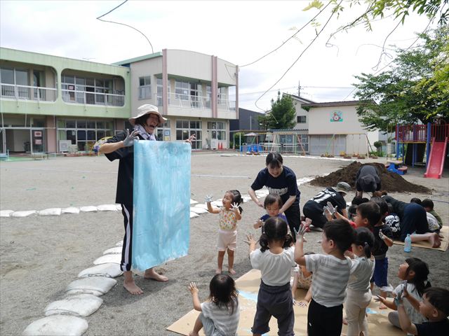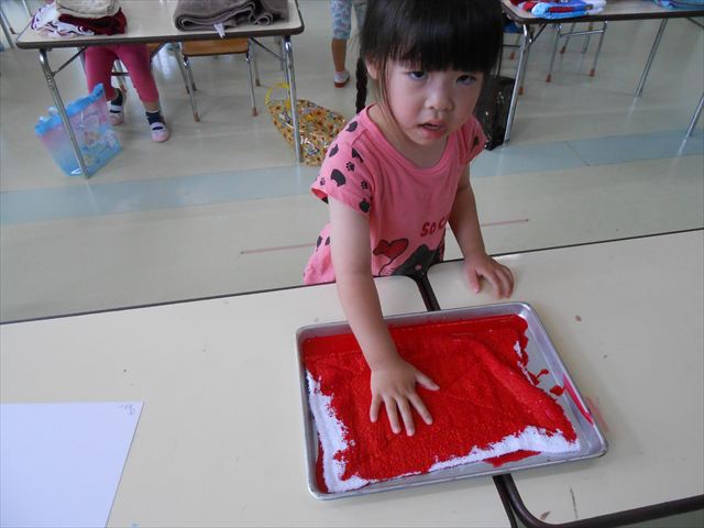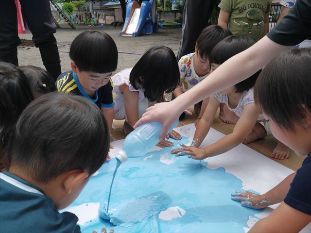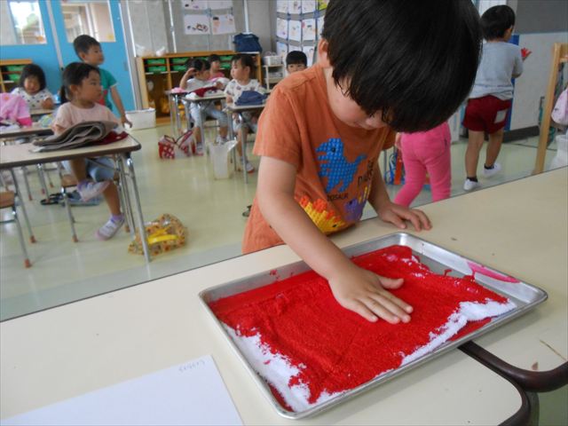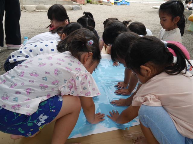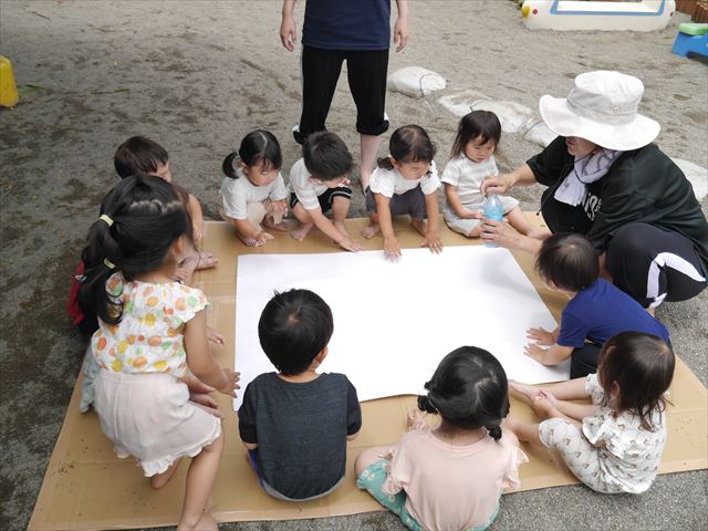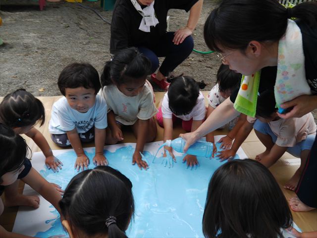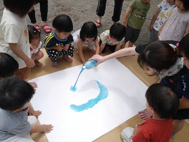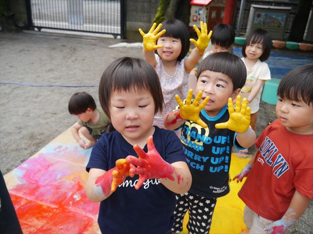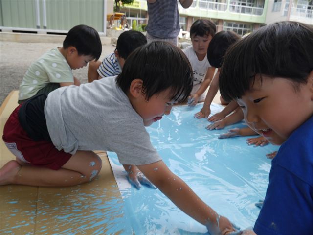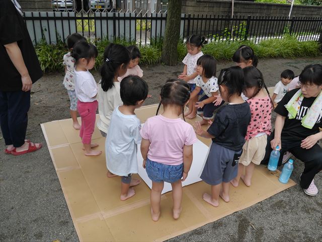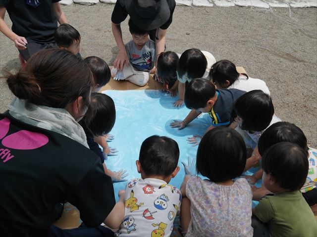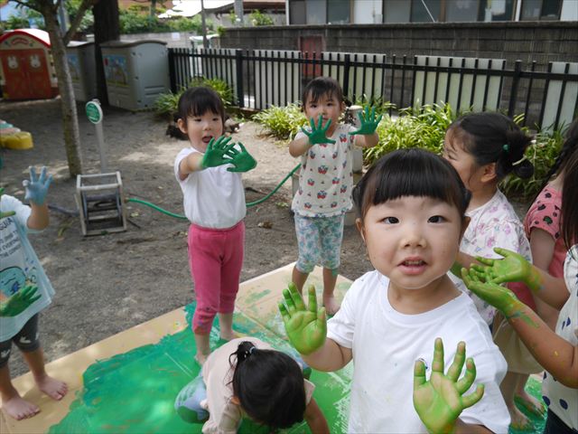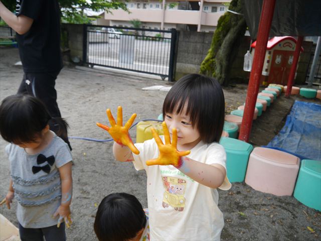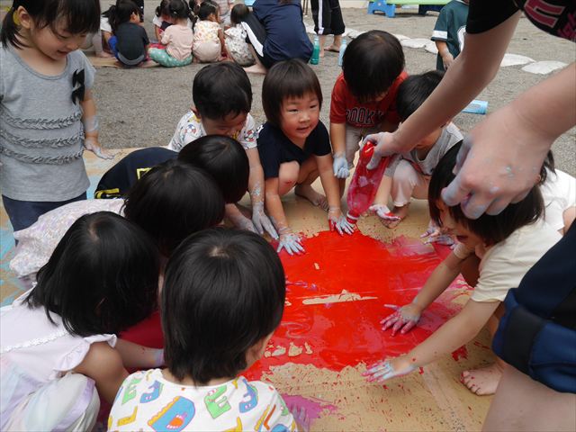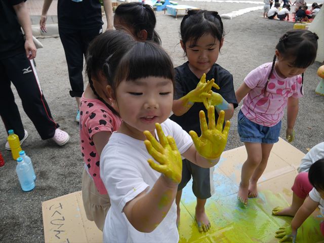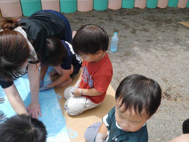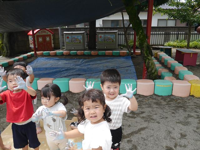 ^^)そのあと外に出て園長先生のお話を聞いたあとペイント遊びをしました。まずは白い模造紙に水色の絵の具とみんなの手で海を作りました。きゃー気持ちいい〜と興奮!そのあと、段ボールに黄色、みどり、赤の絵の具を使って手と足でペイント遊びを楽しみました(