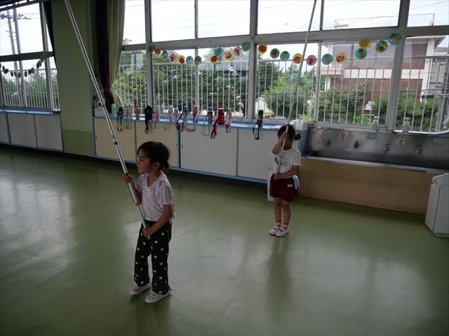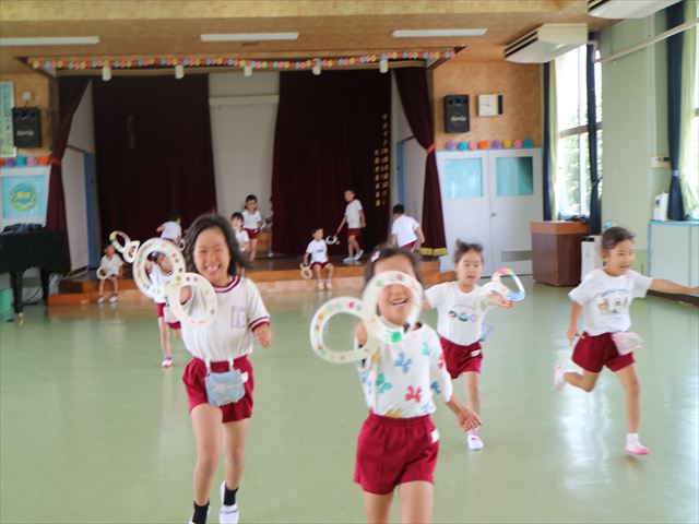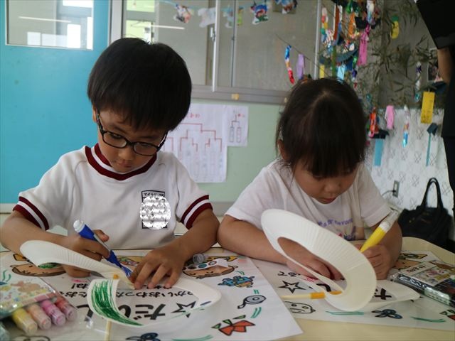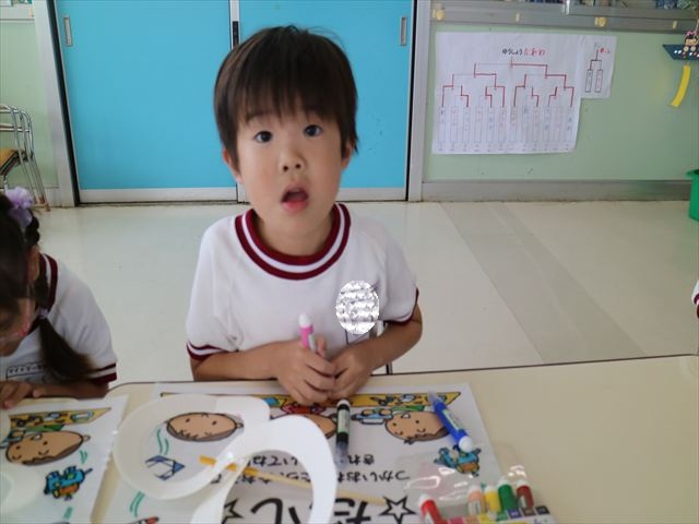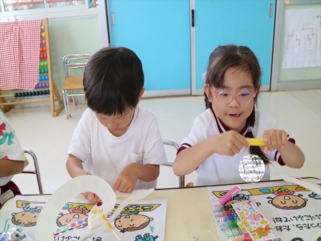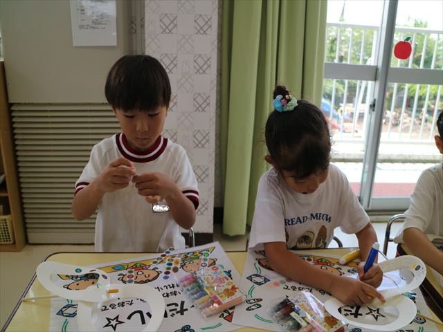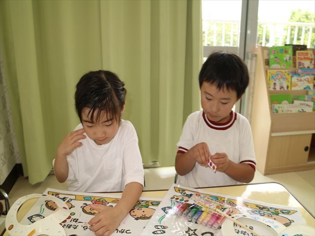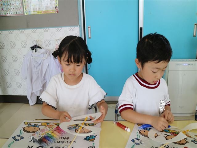 6月の「自由保育の時間」を行いました。うみ組は「紙皿風車」を作りました。真ん中をくりぬいた紙皿を2枚組み合わせて8の字の形にし、木の棒を真ん中に固定したものに、一人一人がペンで模様を描いたり、シールを貼ってオリジナルの風車を作りました!その後は遊戯室に移動して、風車を回すのを楽しみました。上手に回る子にコツを聞きながら、みんなで楽しく遊ぶ事が出来ました!本日持ち帰りましたので、おうちでも遊んでみてください☆