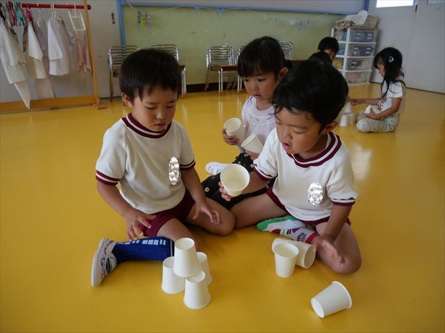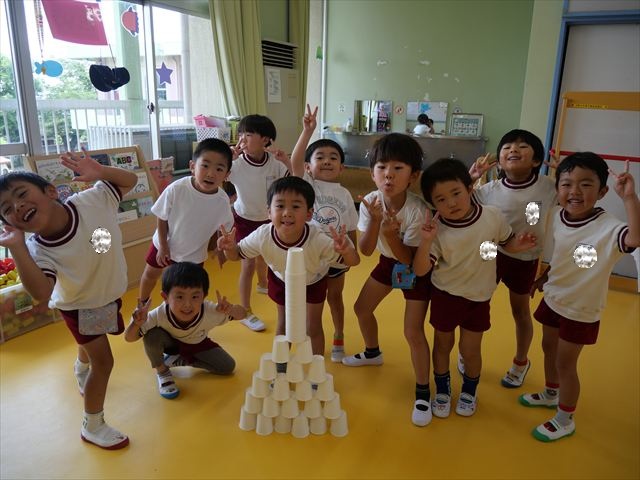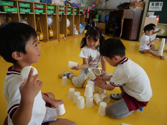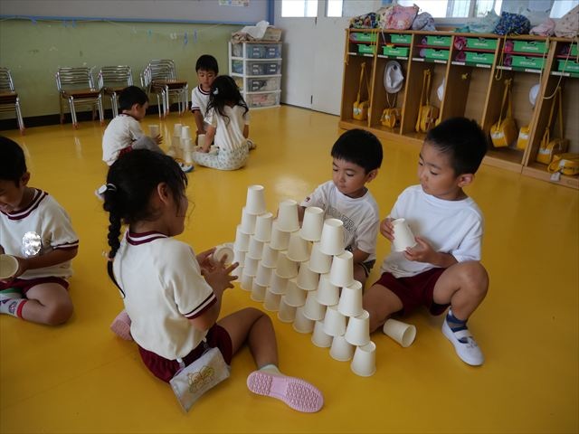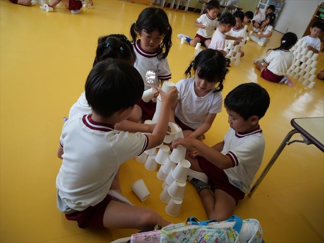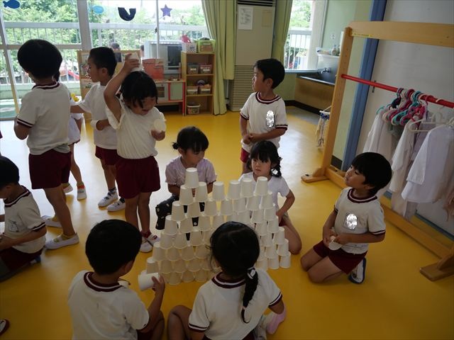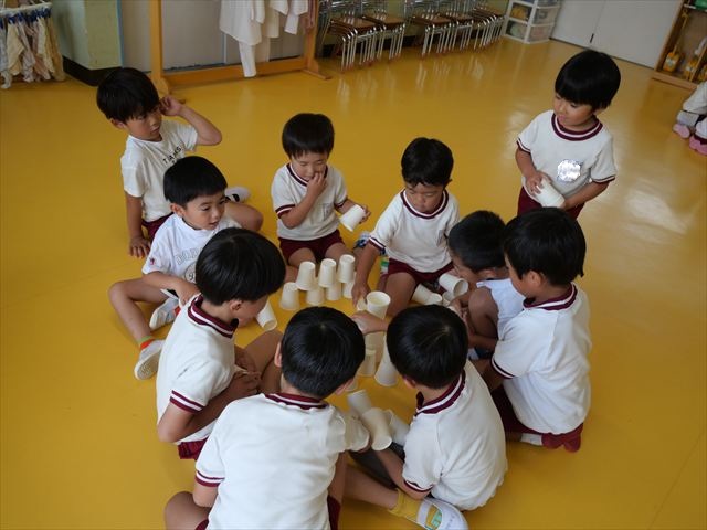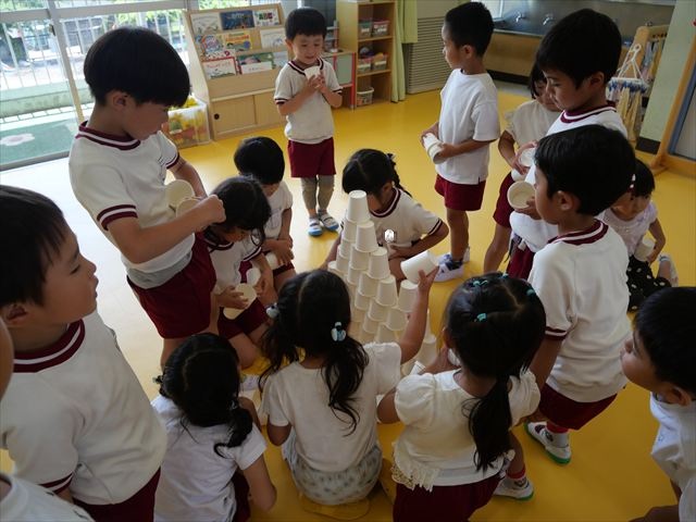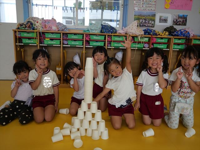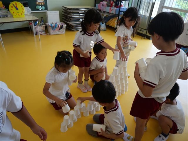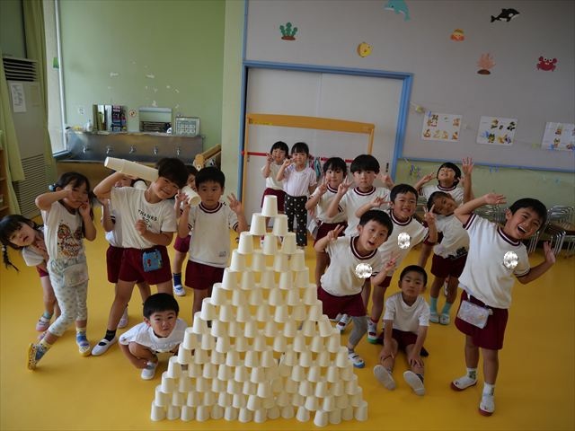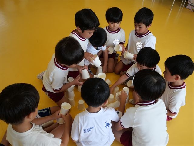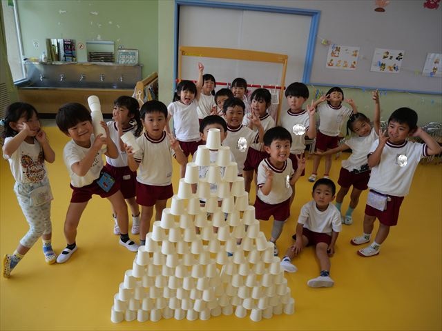 たいよう組は、「紙コップ遊び」をしました。40個の紙コップを使って、どのグループが一番高く紙コップを積み上げられるか5つのグループ対抗で勝負しました!グループ対抗の後は男女に分かれて100個の紙コップを使って勝負しました!結果は女の子チーム76センチ、男の子チーム74センチで見事女の子チームの勝利でした!わずか2センチの差でいい勝負でした(^▽^)最後に全員で200個の紙コップを使ってどれだけ高く積み上げられるかチャレンジしました!「頑張るぞー!」「みんなで協力しよう!」とやる気満々な子どもたちでした。結果は…112センチ!大きなタワーを作ることが出来ました!