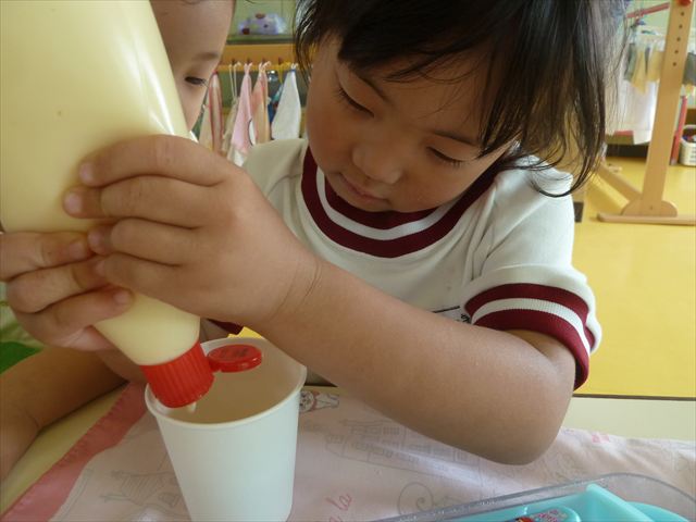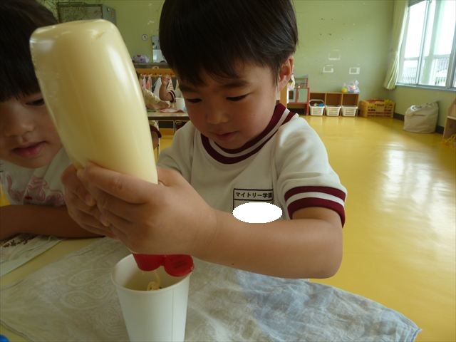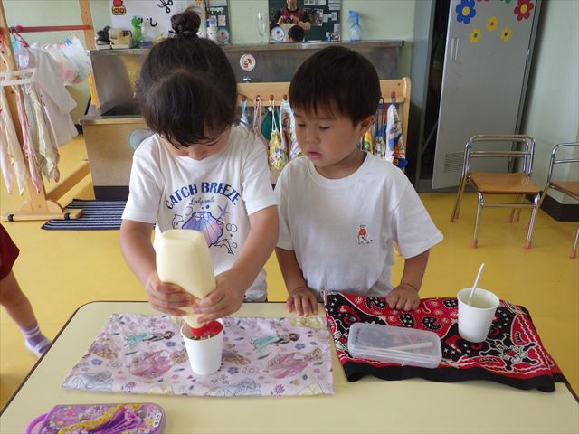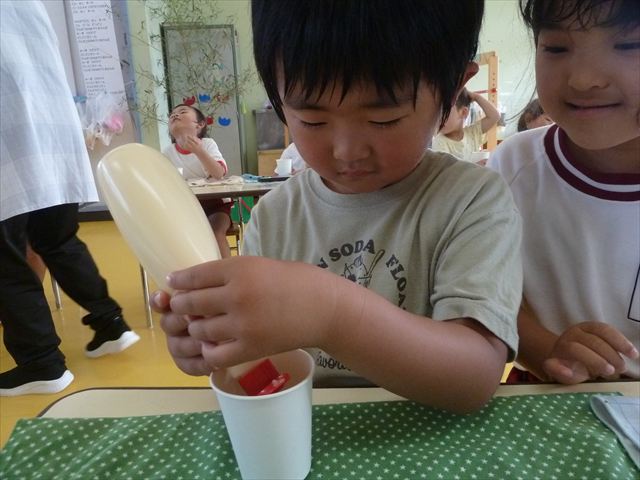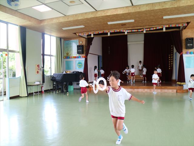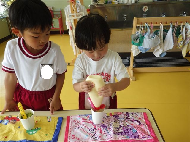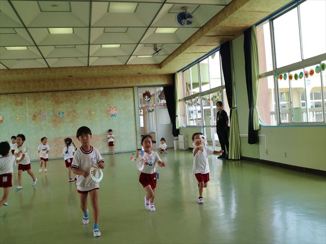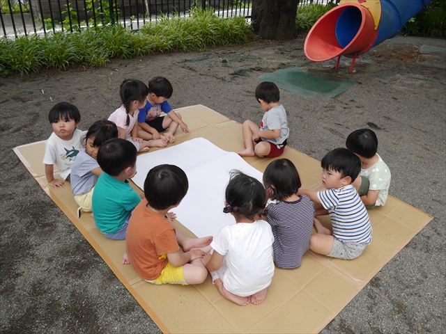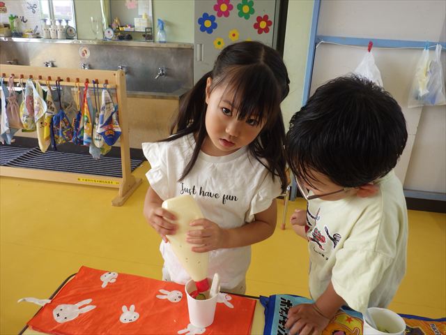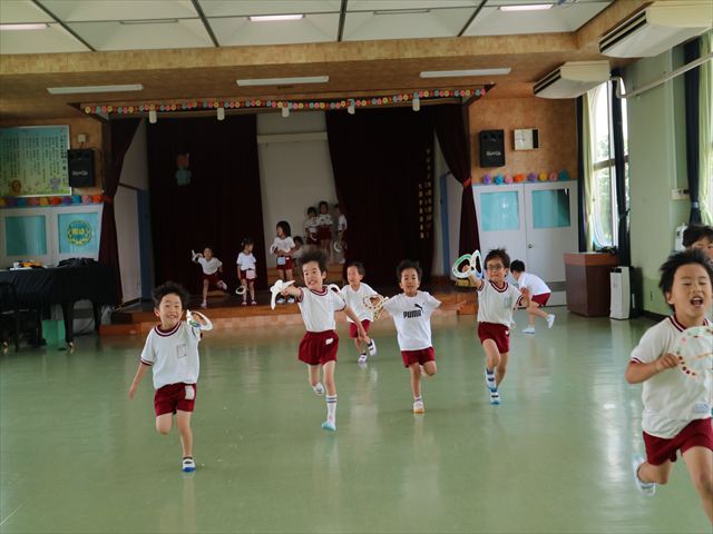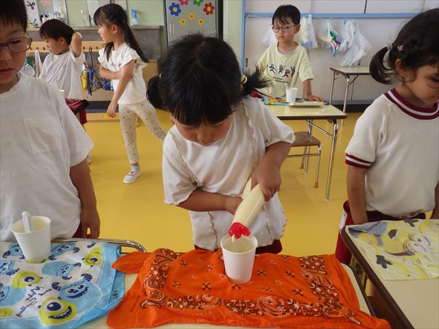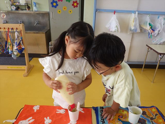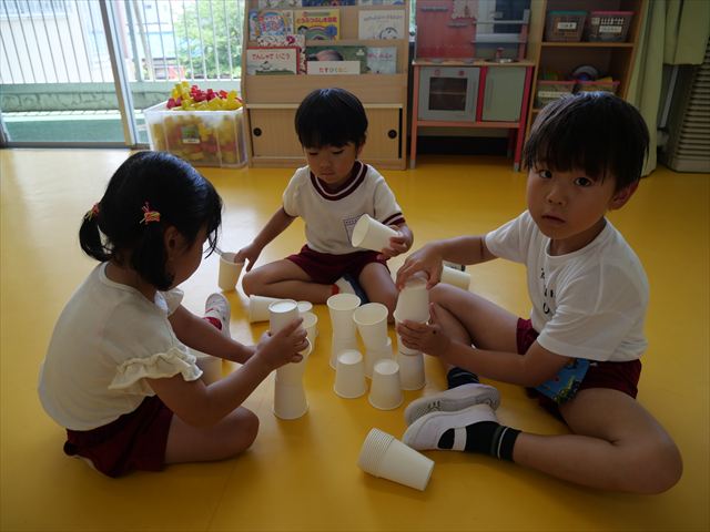 たいよう組は、「紙コップ遊び」をしました。40個の紙コップを使って、どのグループが一番高く紙コップを積み上げられるか5つのグループ対抗で勝負しました!グループ対抗の後は男女に分かれて100個の紙コップを使って勝負しました!結果は女の子チーム76センチ、男の子チーム74センチで見事女の子チームの勝利でした!わずか2センチの差でいい勝負でした(^▽^)最後に全員で200個の紙コップを使ってどれだけ高く積み上げられるかチャレンジしました!「頑張るぞー!」「みんなで協力しよう!」とやる気満々な子どもたちでした。結果は…112センチ!大きなタワーを作ることが出来ました!