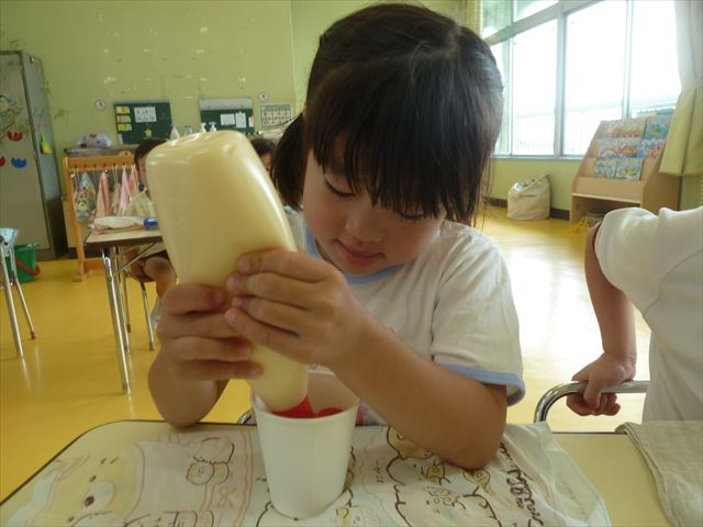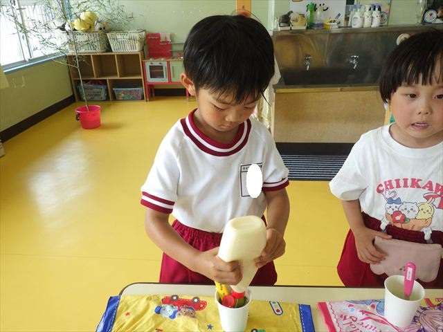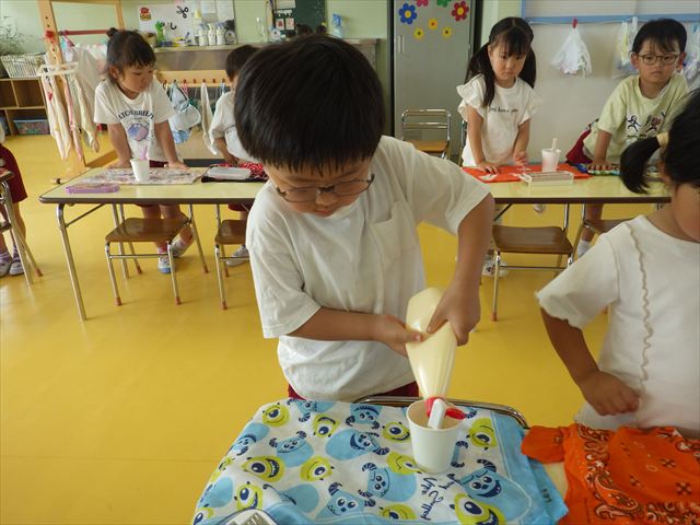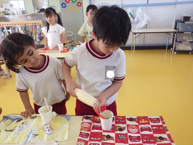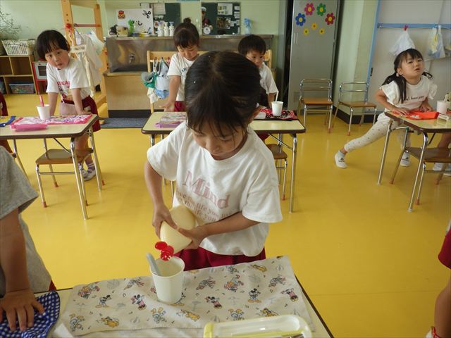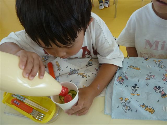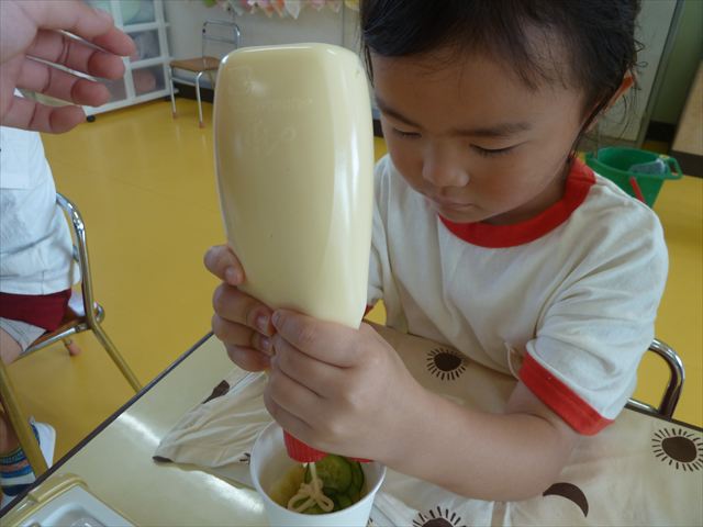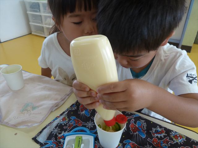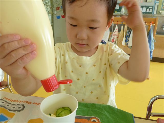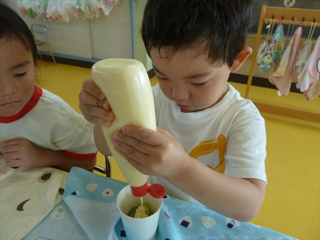 今日はじゃがいもの収穫祭の時のじゃがいもと、幼稚園の畑で実ったきゅうりを使ってポテトサラダを作りました。朝のうちにじゃがいもを茹でておき、それにきゅうりとマヨネーズを加えて混ぜました。じゃがいもの量、きゅうりの量、マヨネーズの量は自分好みにして楽しくクッキングしました。一度冷蔵庫に入れて冷やしました。その冷やしている間にプールに入り汗を流し楽しく水遊びをしました。プールから出ると「早くポテトサラダ食べたーい。」と叫んでいました^_^自分で作ったポテトサラダは、格別に美味しいようで、みんな笑顔でぱくぱく食べていました。なすの塩もみも一緒に頂きました。