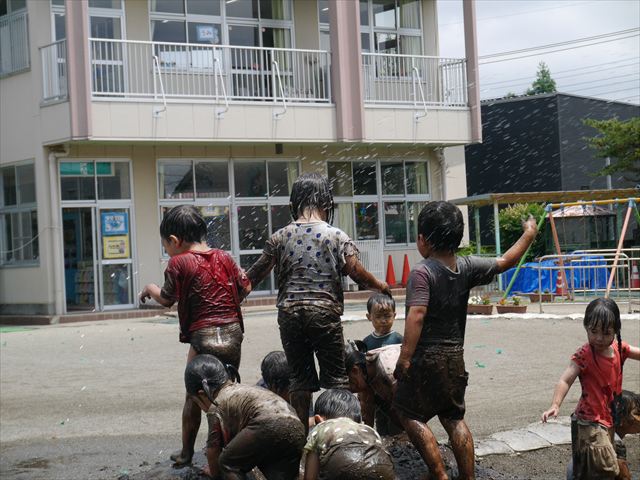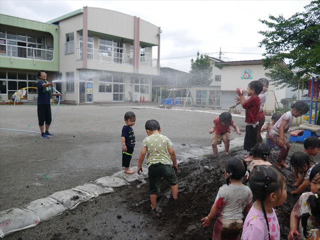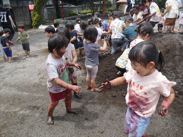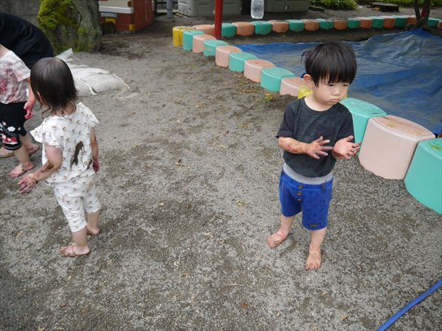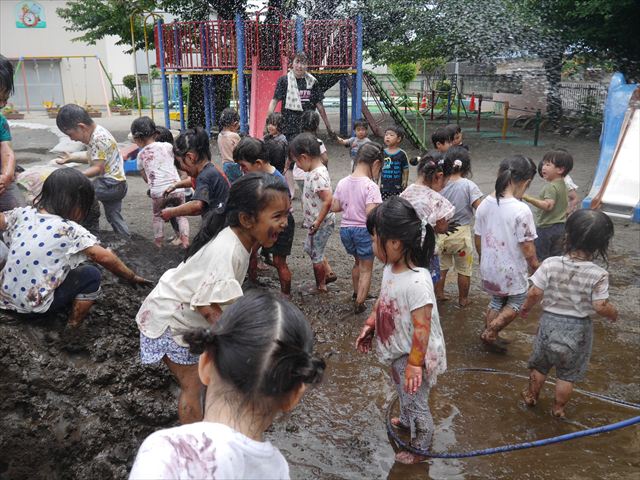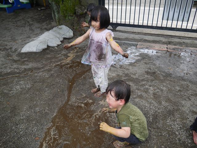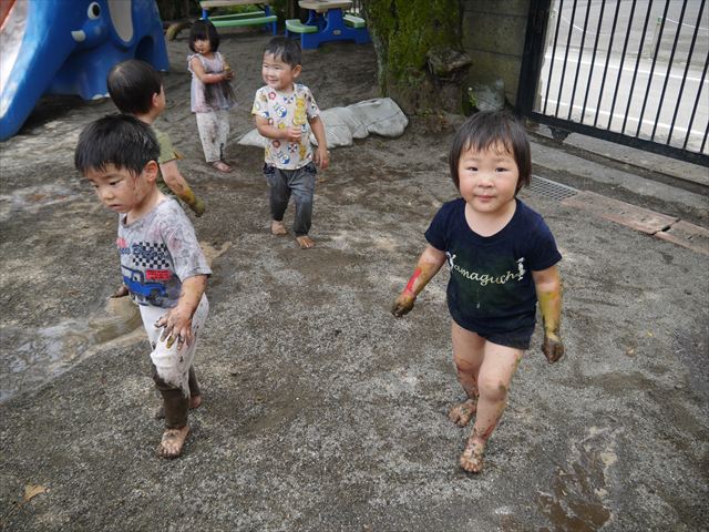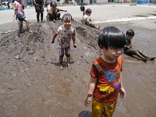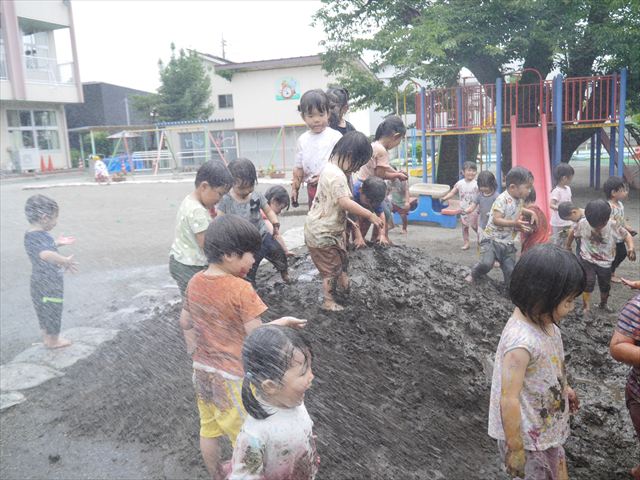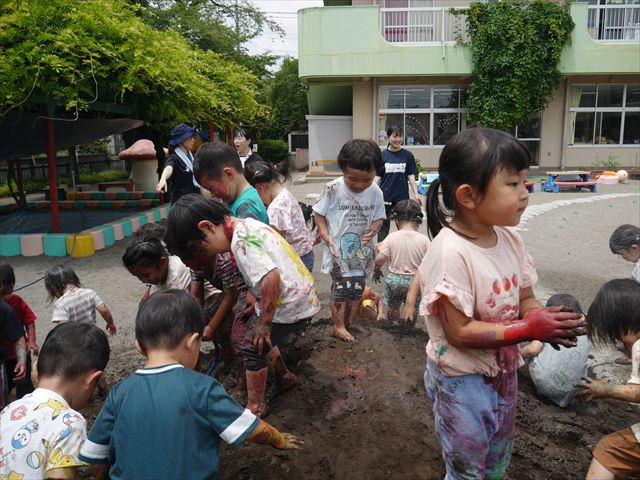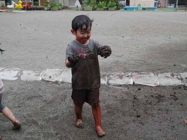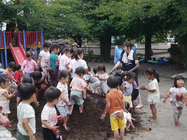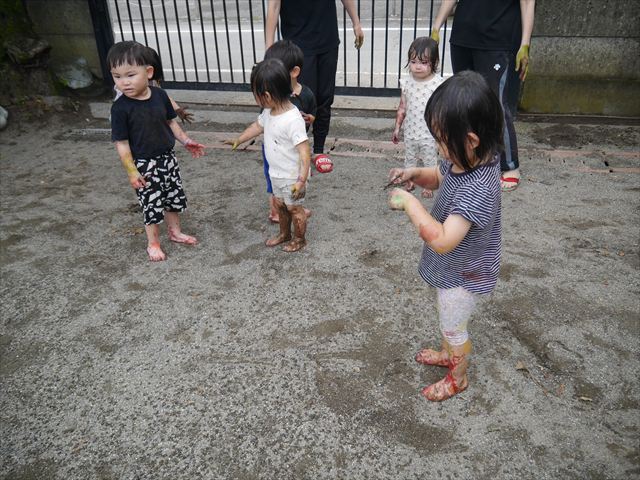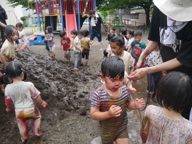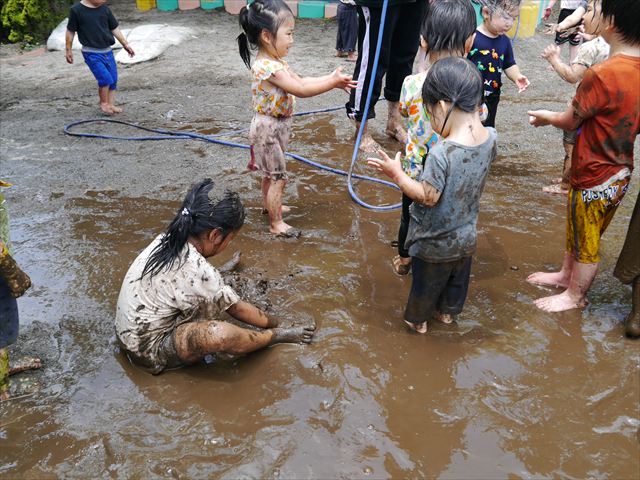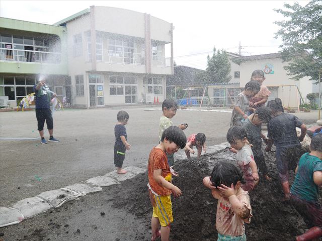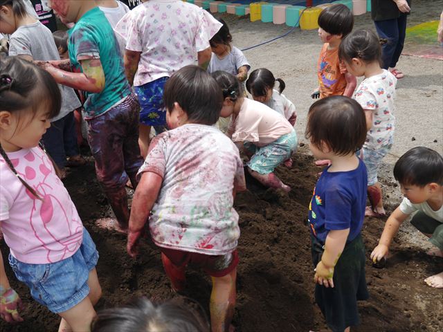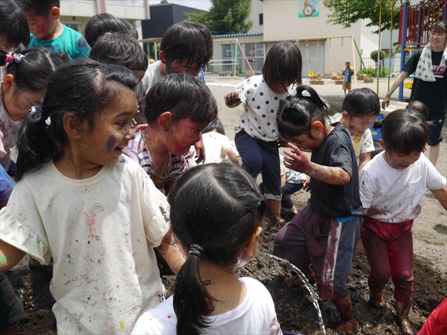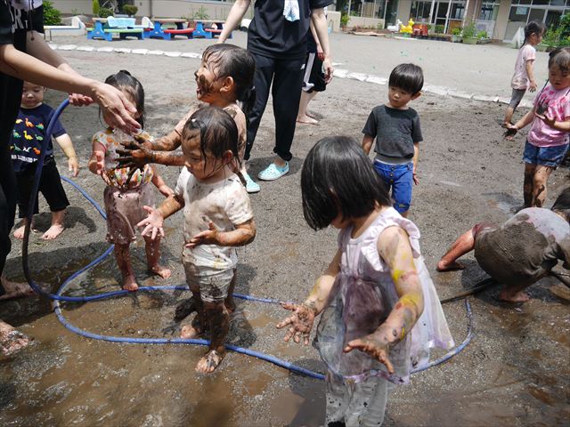 ペイント遊びをしたあとはお待ちかねの泥遊び!朝、届きたての泥で泥遊びを楽しみました。初めは控えめだった子も気付くと泥んこに!泥山の頂上に登ったりそこから泥の滑り台を滑ったりしました。園長先生がシャワーをかけてくれるとキャーキャーと盛り上がるお友だちでした\(^o^)/泥遊びが少し苦手な子も泥山から流れてくる泥や水を触って遊ぶ姿も見られました\(^o^)/かなりダイナミックに遊ぶ子が多く遊んだお洋服は泥で染まってしまっています。そのまま持ち帰らせていただいていますがご了承ください。また体、髪の毛、落としきれていない汚れがあると思いますが申し訳ありません。お風呂でペイント遊び、泥遊びの様子をお子さんと一緒にお話ししながらよく洗っていただけると助かります。よろしくお願いします。