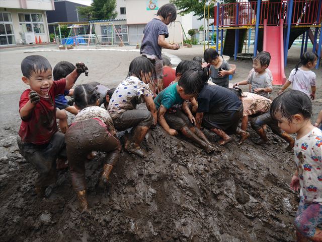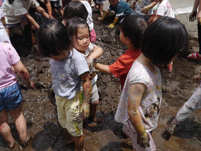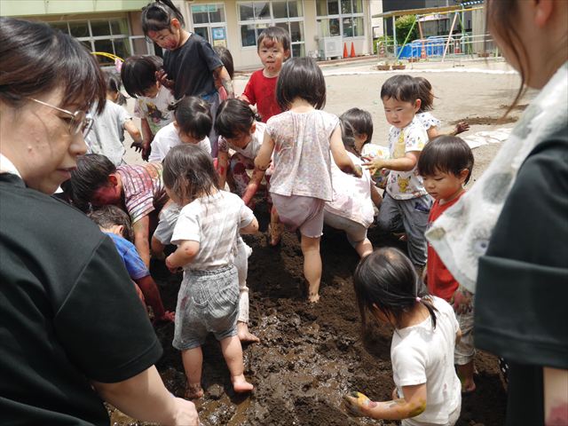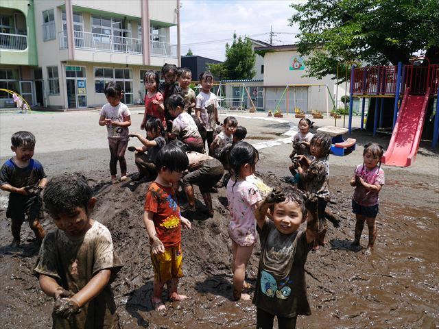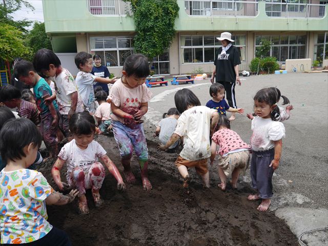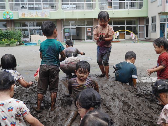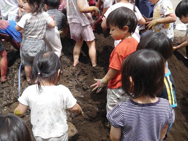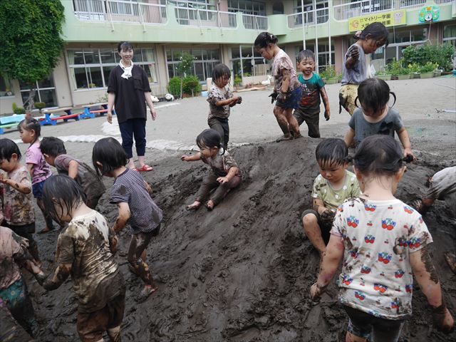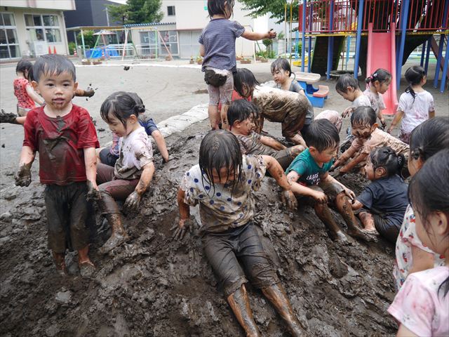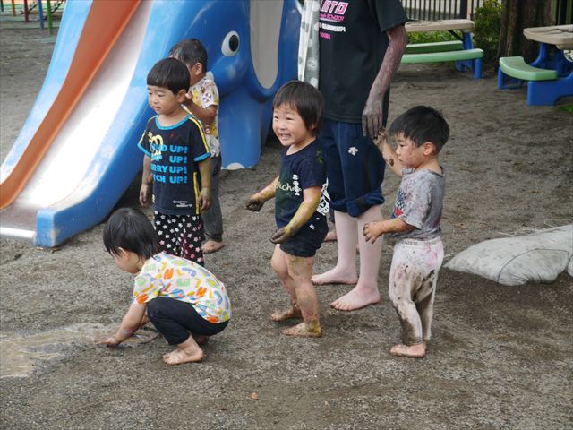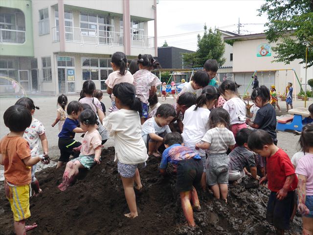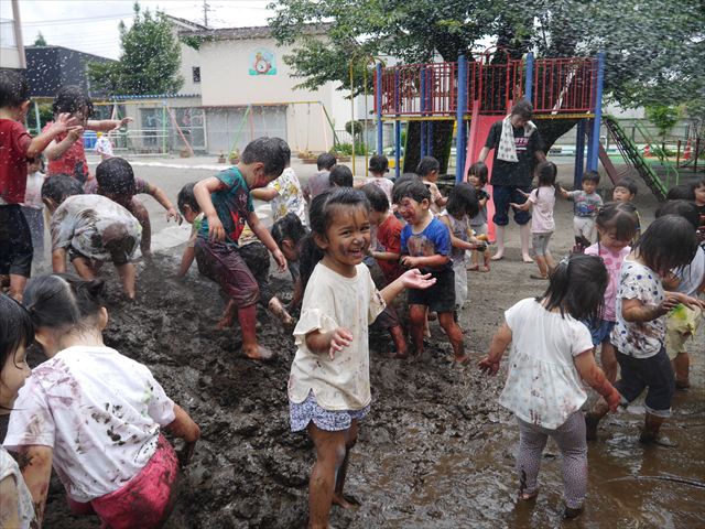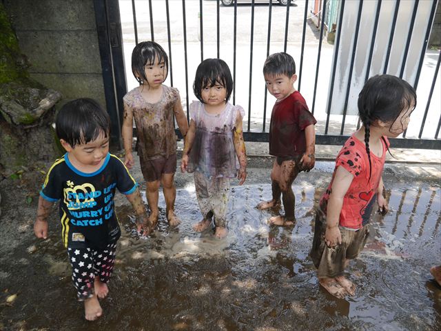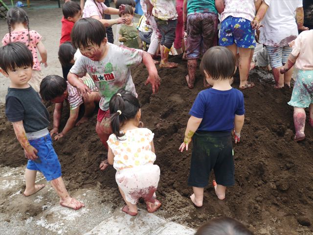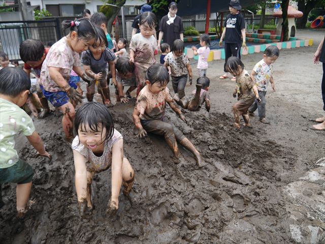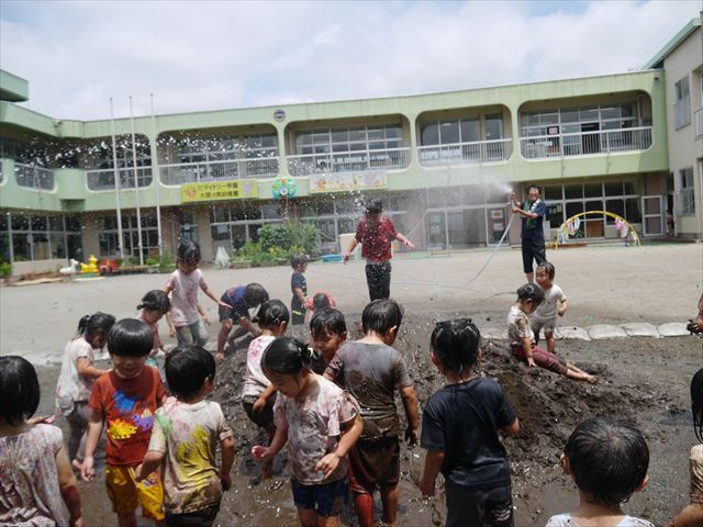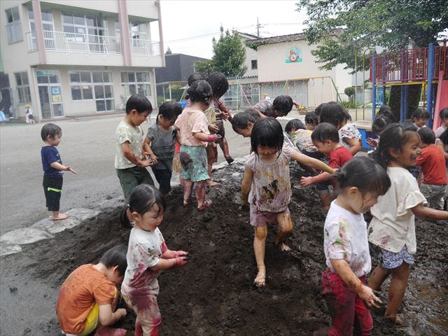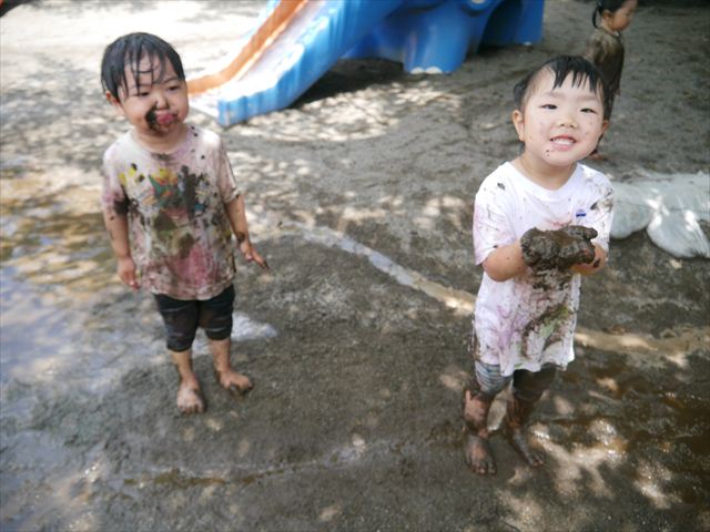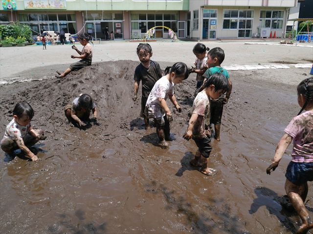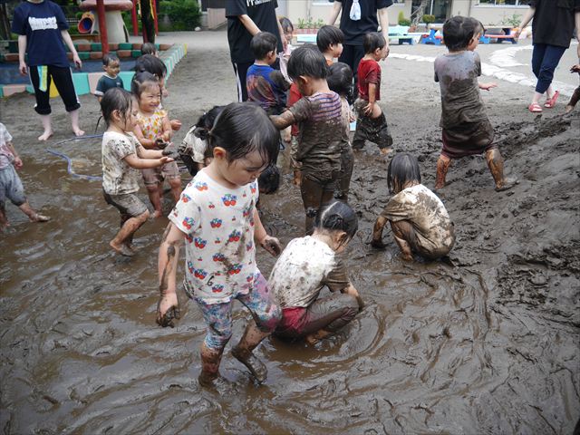 ペイント遊びをしたあとはお待ちかねの泥遊び!朝、届きたての泥で泥遊びを楽しみました。初めは控えめだった子も気付くと泥んこに!泥山の頂上に登ったりそこから泥の滑り台を滑ったりしました。園長先生がシャワーをかけてくれるとキャーキャーと盛り上がるお友だちでした\(^o^)/泥遊びが少し苦手な子も泥山から流れてくる泥や水を触って遊ぶ姿も見られました\(^o^)/かなりダイナミックに遊ぶ子が多く遊んだお洋服は泥で染まってしまっています。そのまま持ち帰らせていただいていますがご了承ください。また体、髪の毛、落としきれていない汚れがあると思いますが申し訳ありません。お風呂でペイント遊び、泥遊びの様子をお子さんと一緒にお話ししながらよく洗っていただけると助かります。よろしくお願いします。