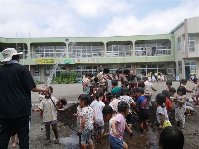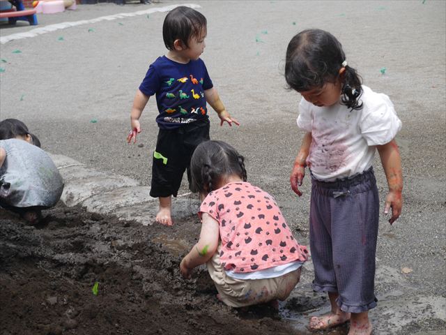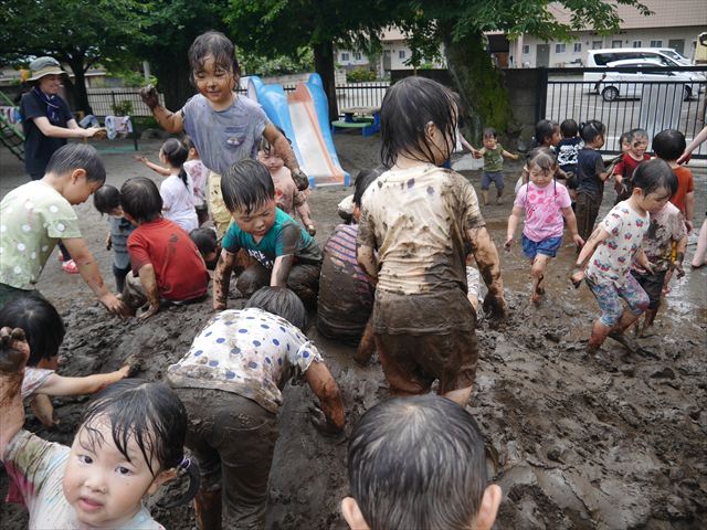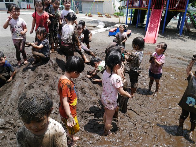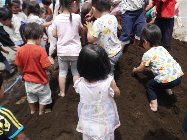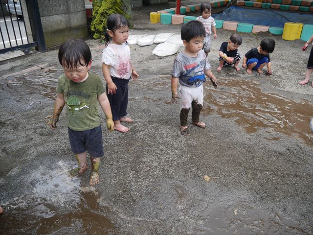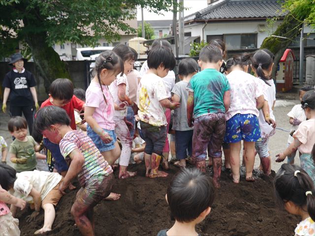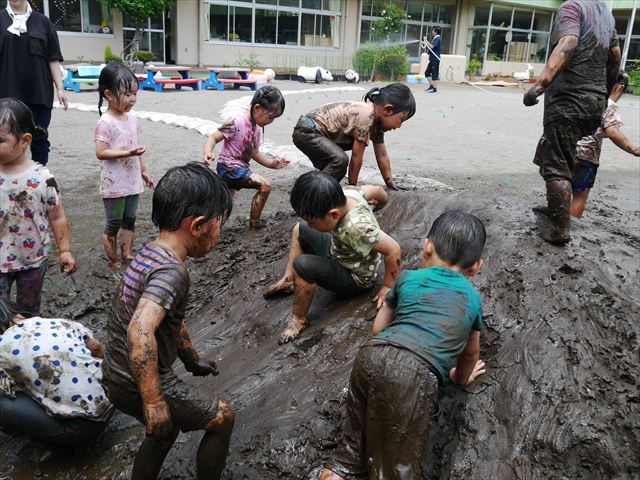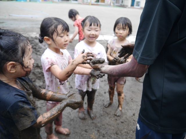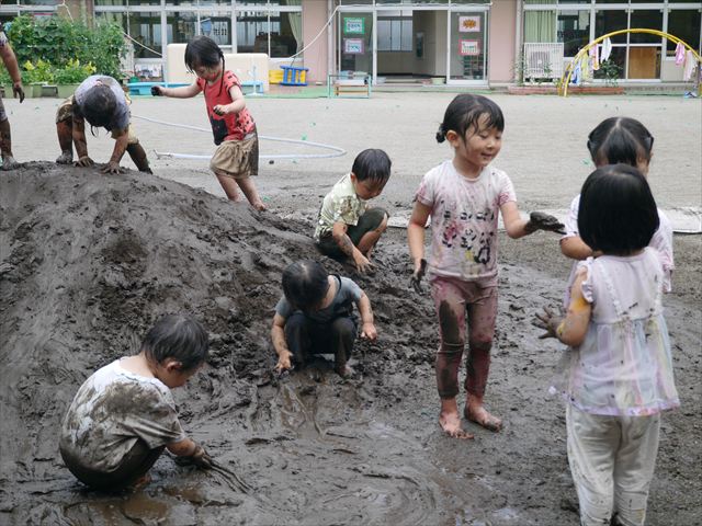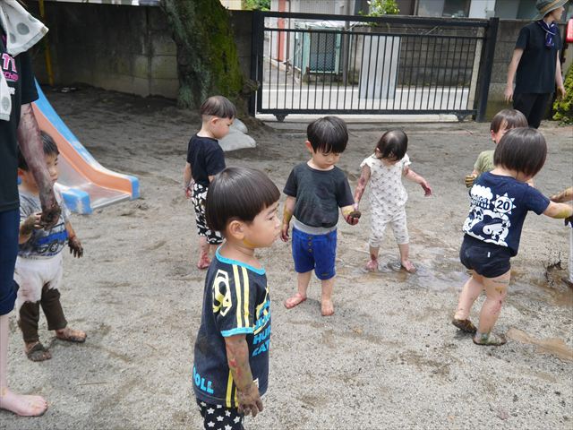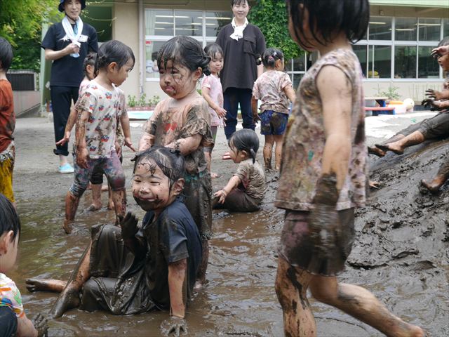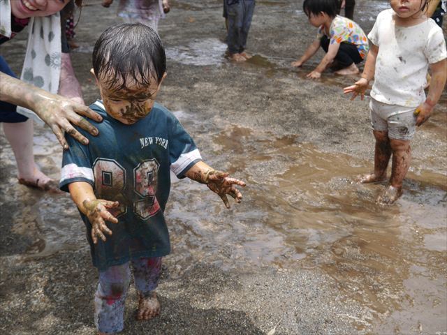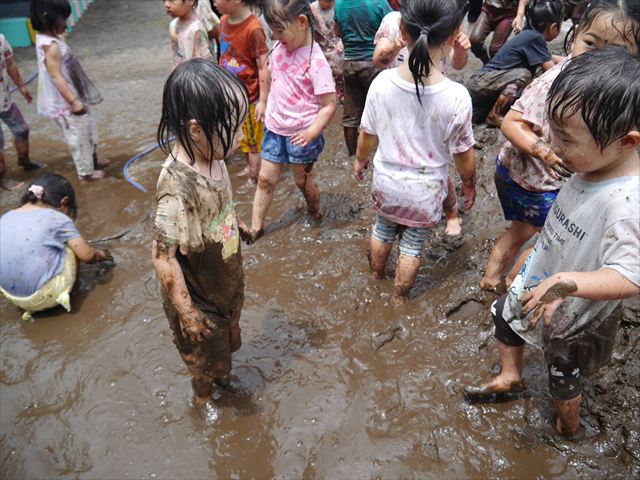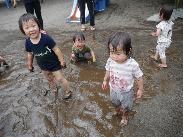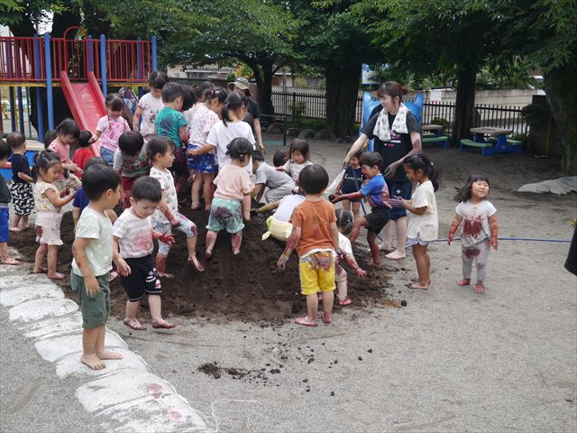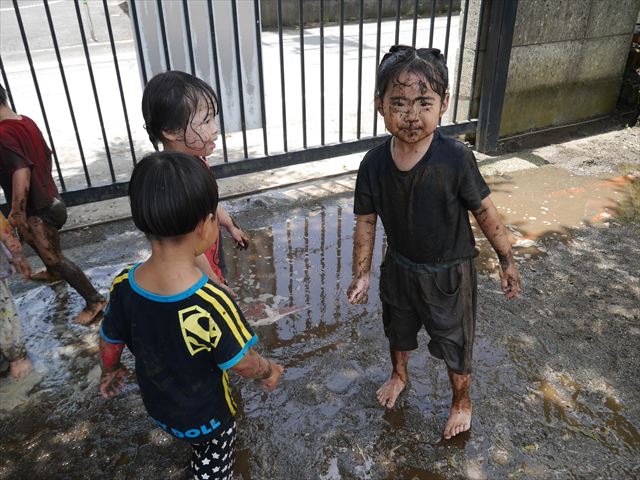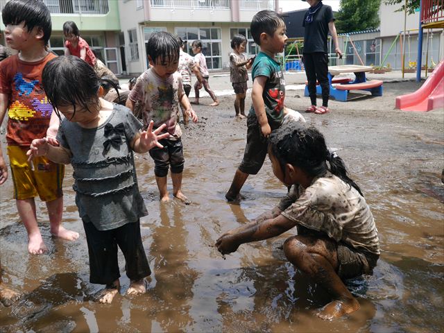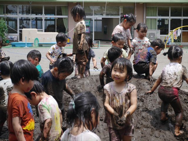 ペイント遊びをしたあとはお待ちかねの泥遊び!朝、届きたての泥で泥遊びを楽しみました。初めは控えめだった子も気付くと泥んこに!泥山の頂上に登ったりそこから泥の滑り台を滑ったりしました。園長先生がシャワーをかけてくれるとキャーキャーと盛り上がるお友だちでした\(^o^)/泥遊びが少し苦手な子も泥山から流れてくる泥や水を触って遊ぶ姿も見られました\(^o^)/かなりダイナミックに遊ぶ子が多く遊んだお洋服は泥で染まってしまっています。そのまま持ち帰らせていただいていますがご了承ください。また体、髪の毛、落としきれていない汚れがあると思いますが申し訳ありません。お風呂でペイント遊び、泥遊びの様子をお子さんと一緒にお話ししながらよく洗っていただけると助かります。よろしくお願いします。