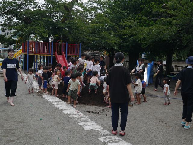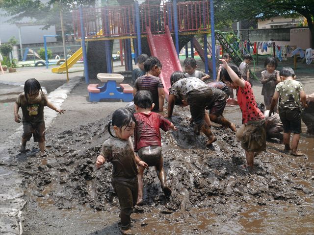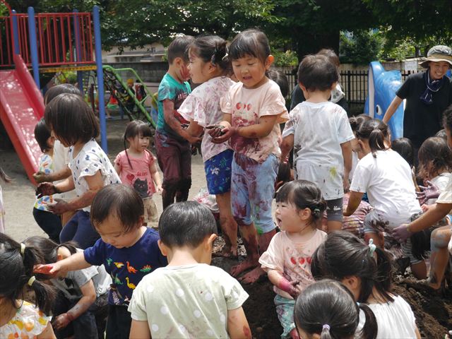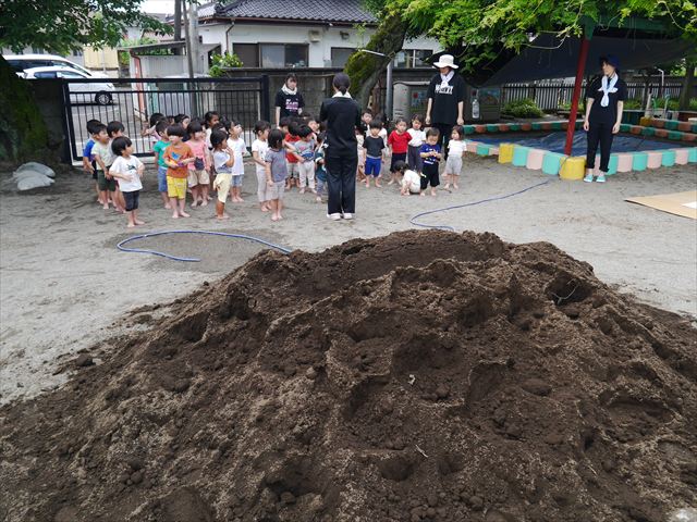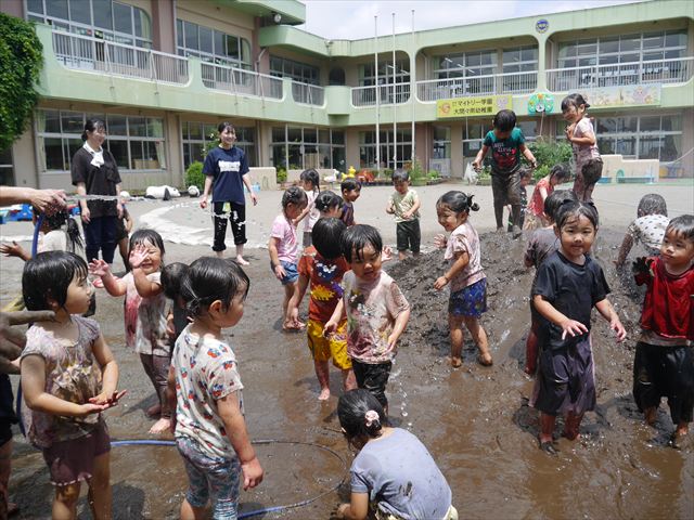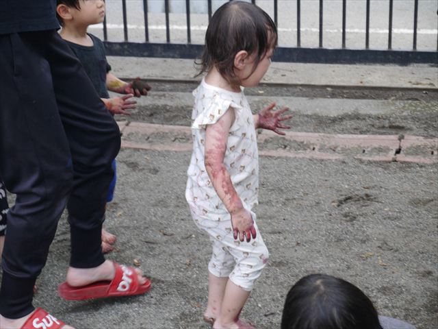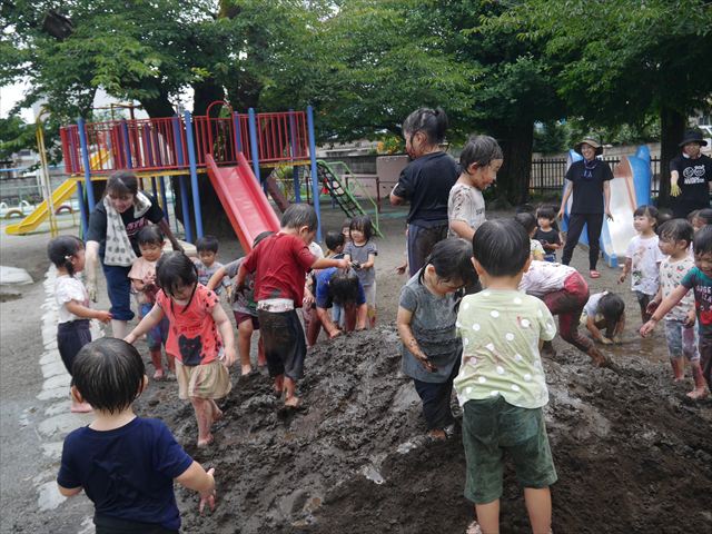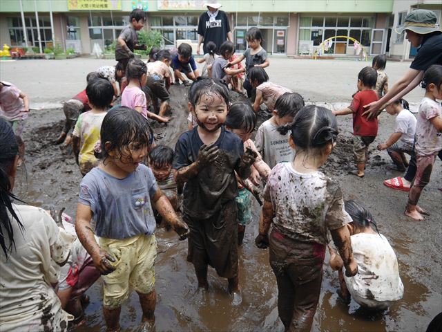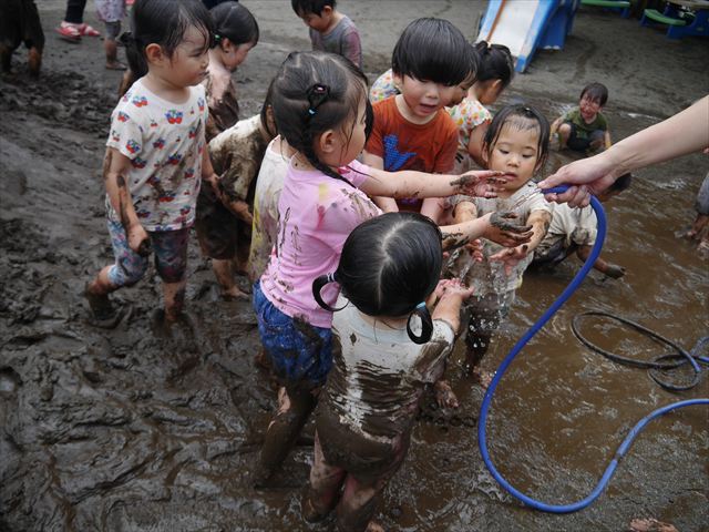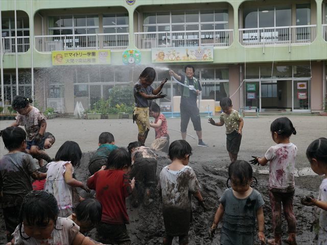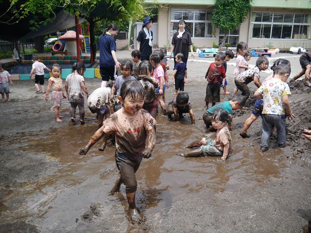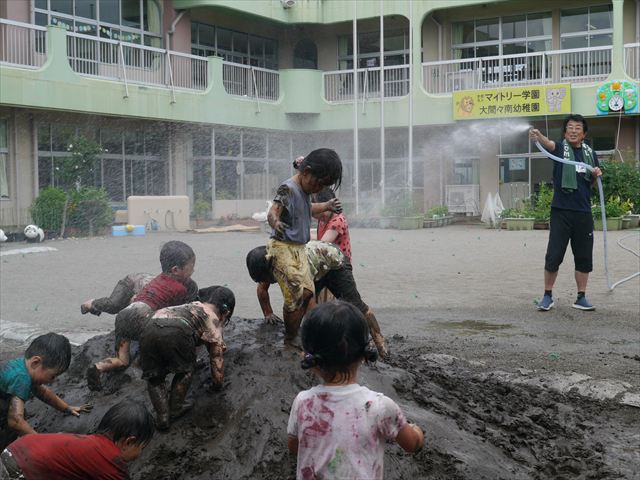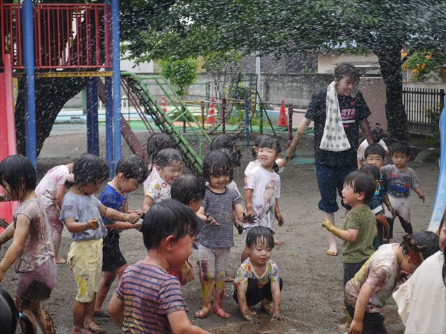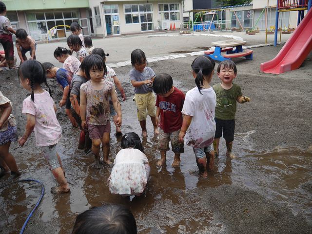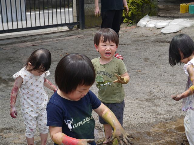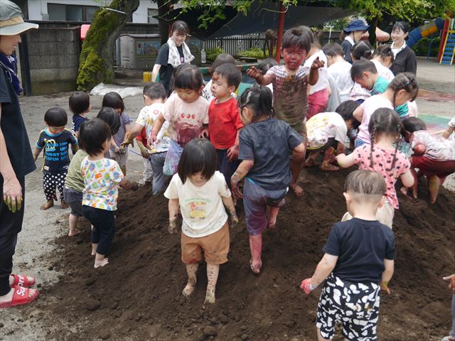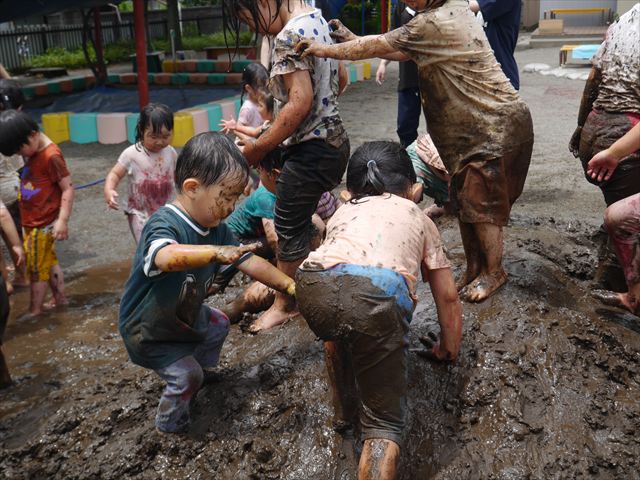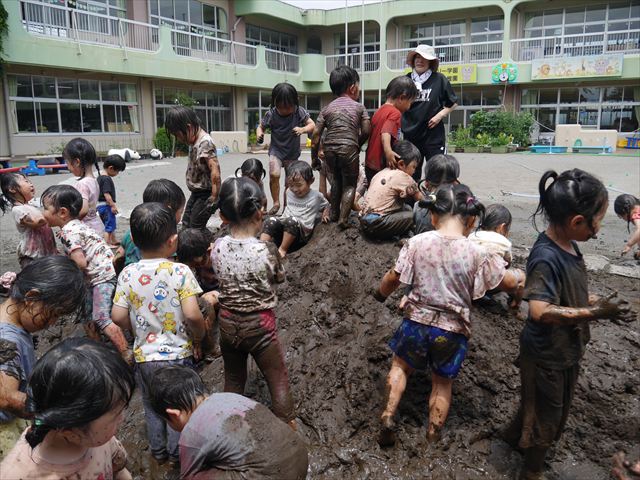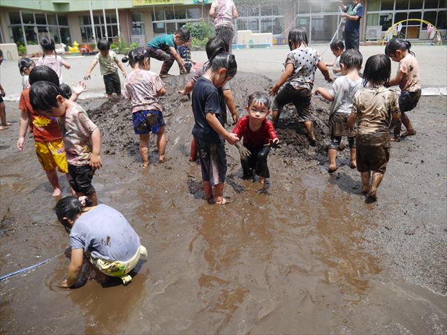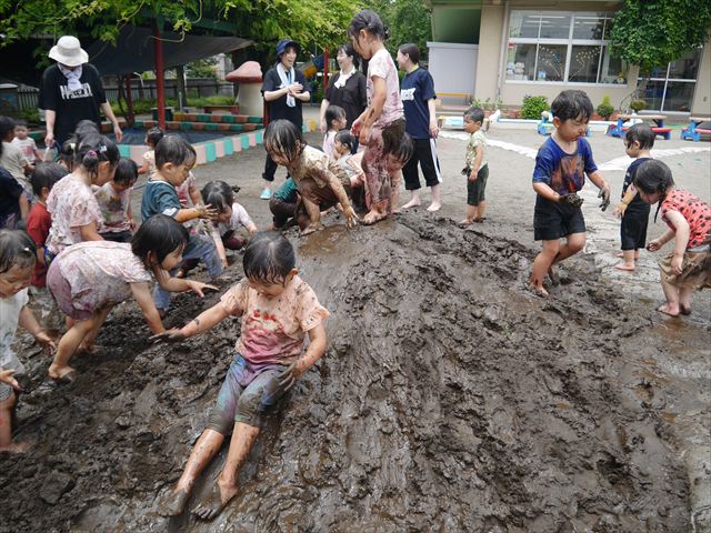 ペイント遊びをしたあとはお待ちかねの泥遊び!朝、届きたての泥で泥遊びを楽しみました。初めは控えめだった子も気付くと泥んこに!泥山の頂上に登ったりそこから泥の滑り台を滑ったりしました。園長先生がシャワーをかけてくれるとキャーキャーと盛り上がるお友だちでした\(^o^)/泥遊びが少し苦手な子も泥山から流れてくる泥や水を触って遊ぶ姿も見られました\(^o^)/かなりダイナミックに遊ぶ子が多く遊んだお洋服は泥で染まってしまっています。そのまま持ち帰らせていただいていますがご了承ください。また体、髪の毛、落としきれていない汚れがあると思いますが申し訳ありません。お風呂でペイント遊び、泥遊びの様子をお子さんと一緒にお話ししながらよく洗っていただけると助かります。よろしくお願いします。