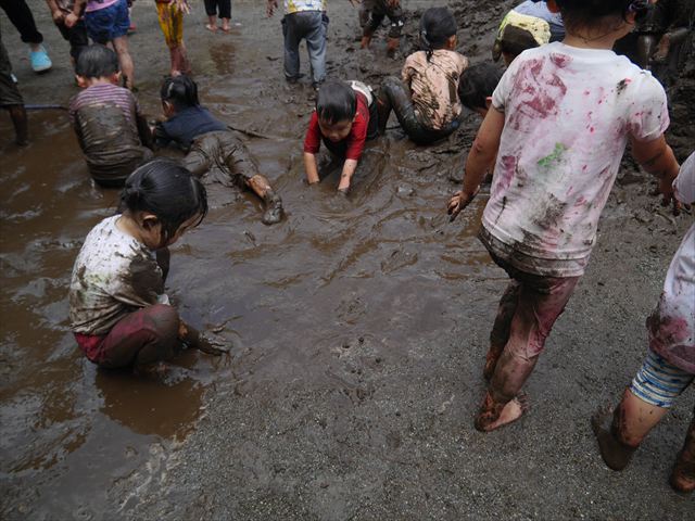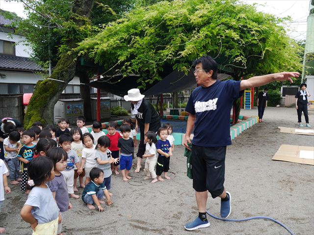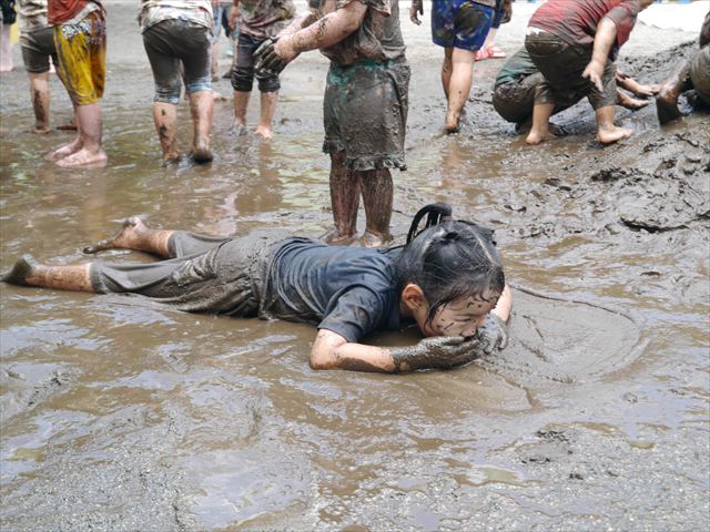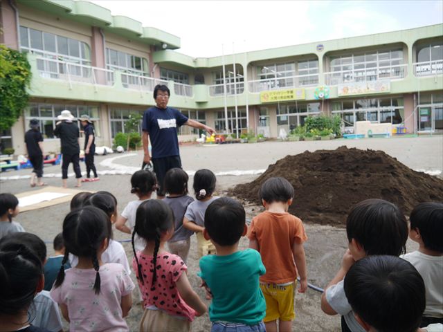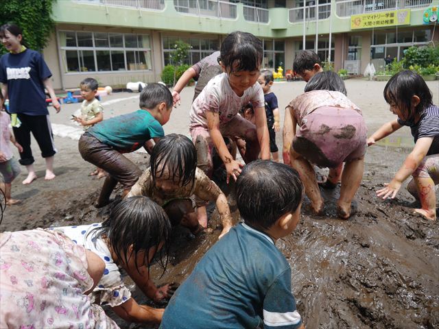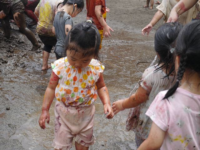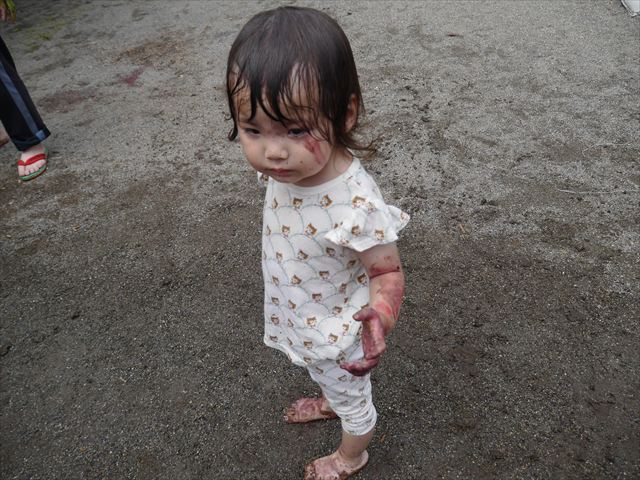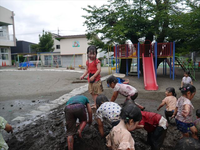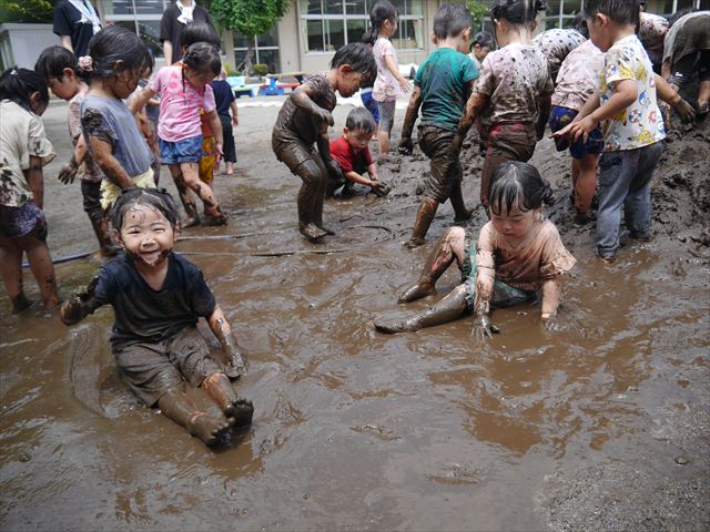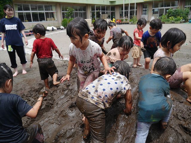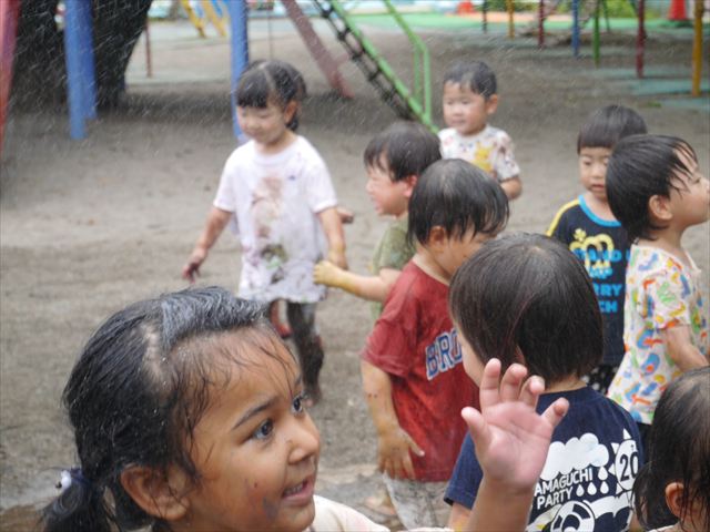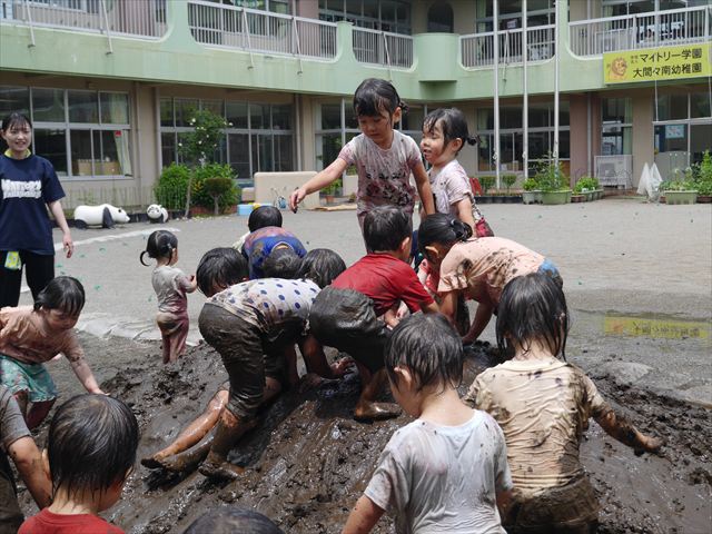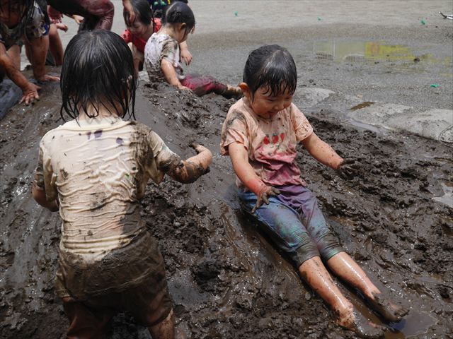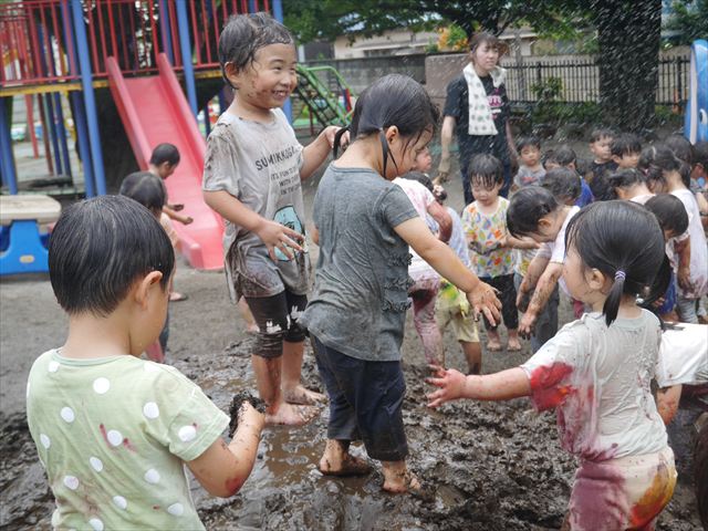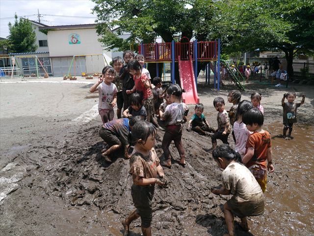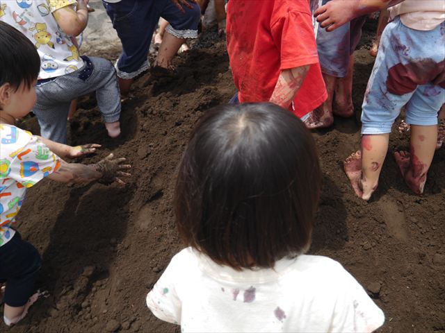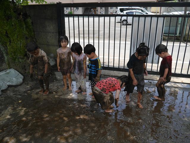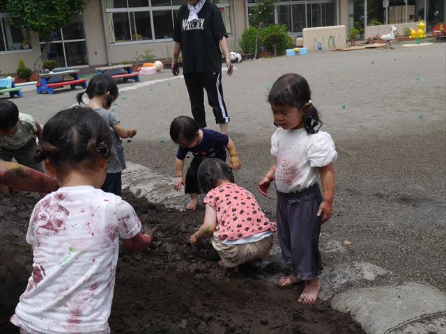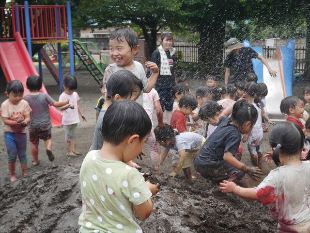ペイント遊びをしたあとはお待ちかねの泥遊び!朝、届きたての泥で泥遊びを楽しみました。初めは控えめだった子も気付くと泥んこに!泥山の頂上に登ったりそこから泥の滑り台を滑ったりしました。園長先生がシャワーをかけてくれるとキャーキャーと盛り上がるお友だちでした\(^o^)/泥遊びが少し苦手な子も泥山から流れてくる泥や水を触って遊ぶ姿も見られました\(^o^)/かなりダイナミックに遊ぶ子が多く遊んだお洋服は泥で染まってしまっています。そのまま持ち帰らせていただいていますがご了承ください。また体、髪の毛、落としきれていない汚れがあると思いますが申し訳ありません。お風呂でペイント遊び、泥遊びの様子をお子さんと一緒にお話ししながらよく洗っていただけると助かります。よろしくお願いします。