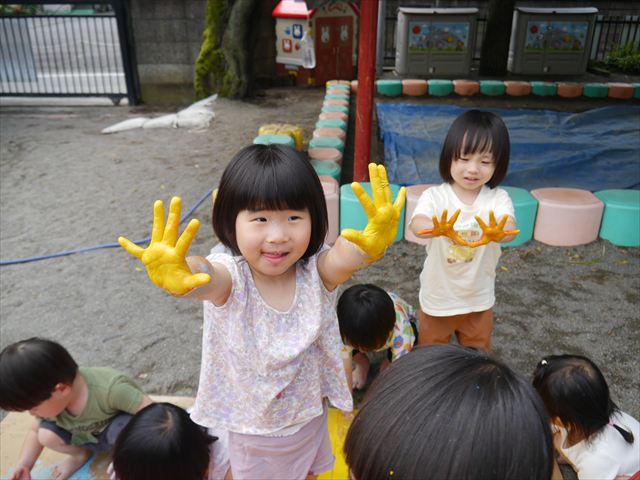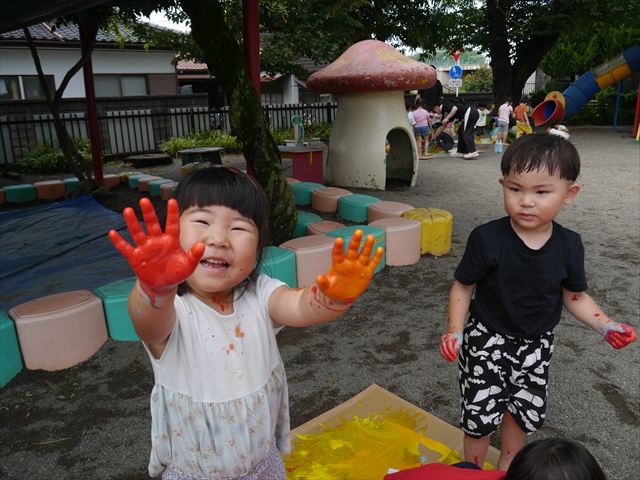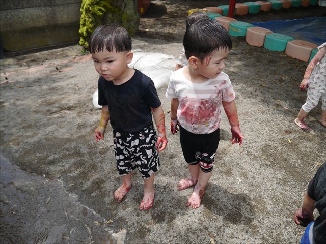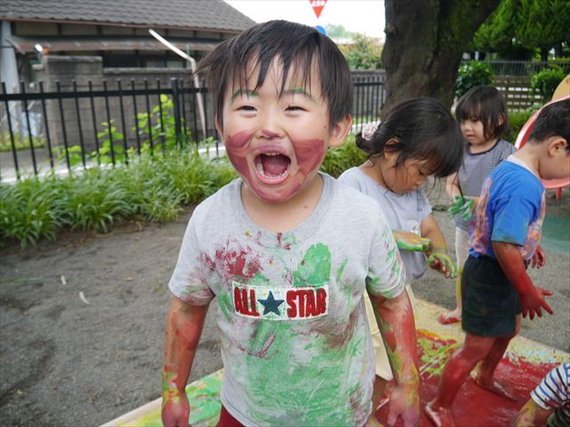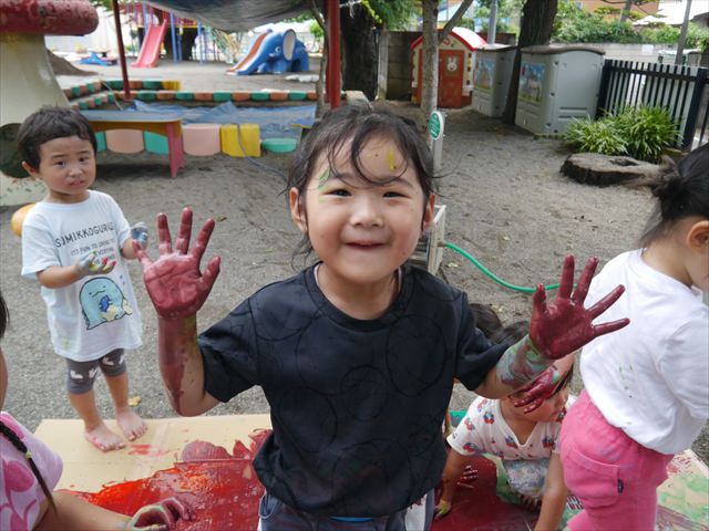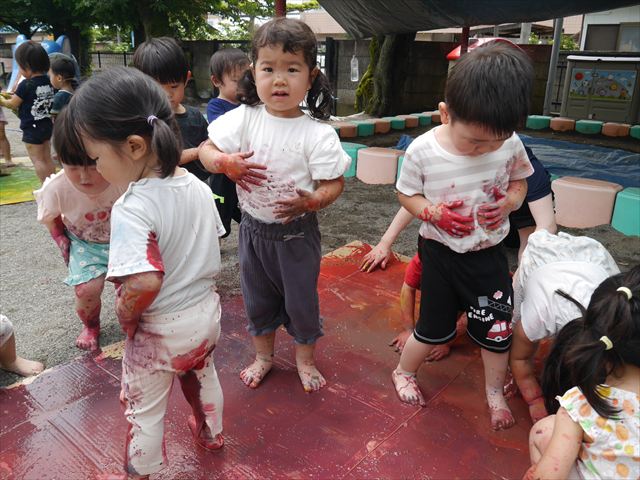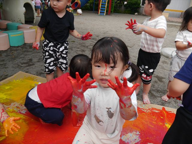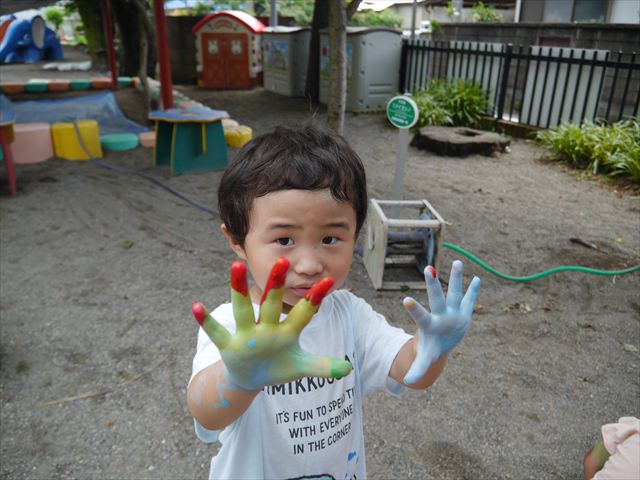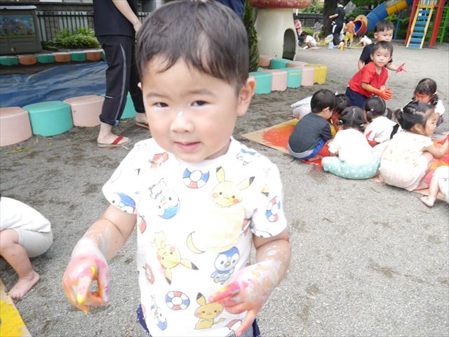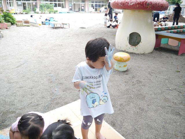 ^^)色が変わったぁ〜お化粧?!大興奮のお友だちでした。顔もお洋服も足もみんな絵の具だらけになって楽しみました(