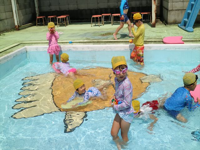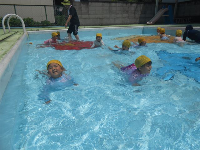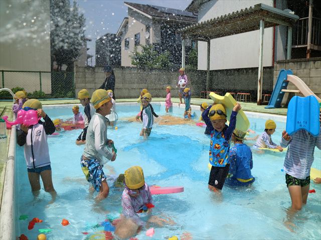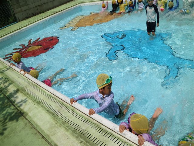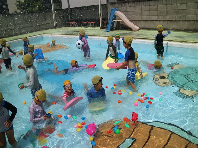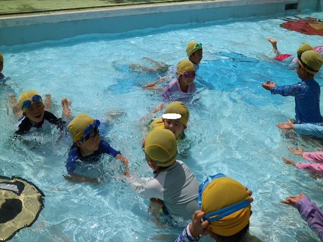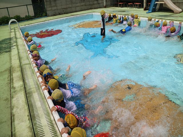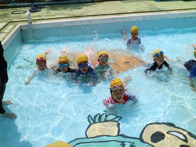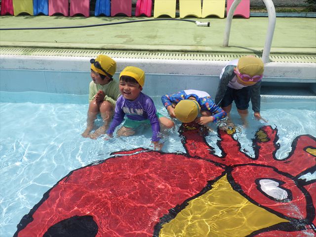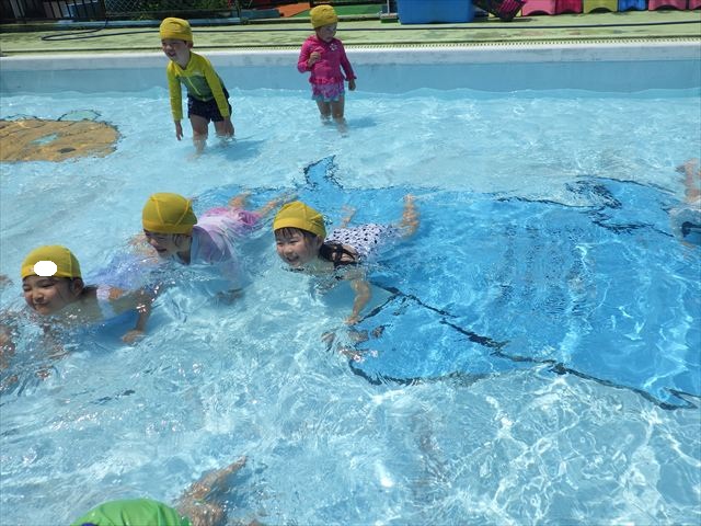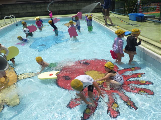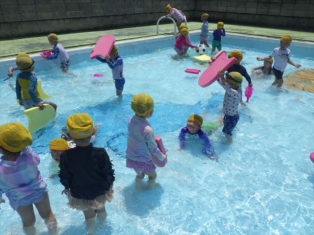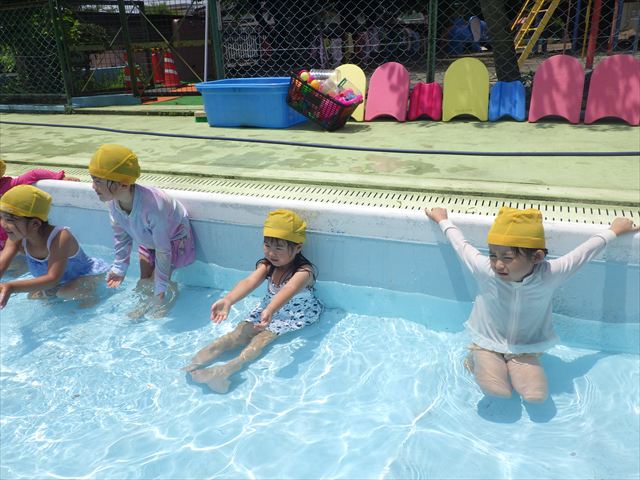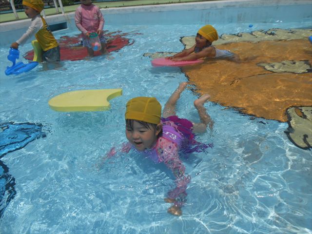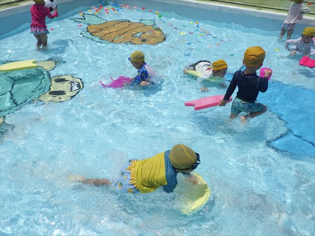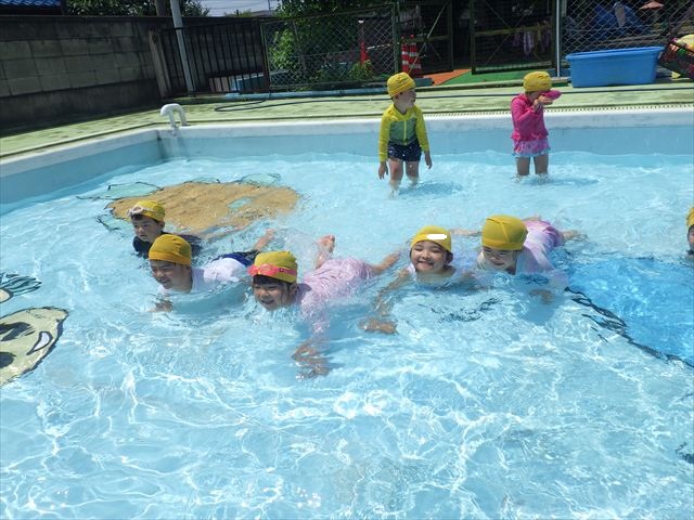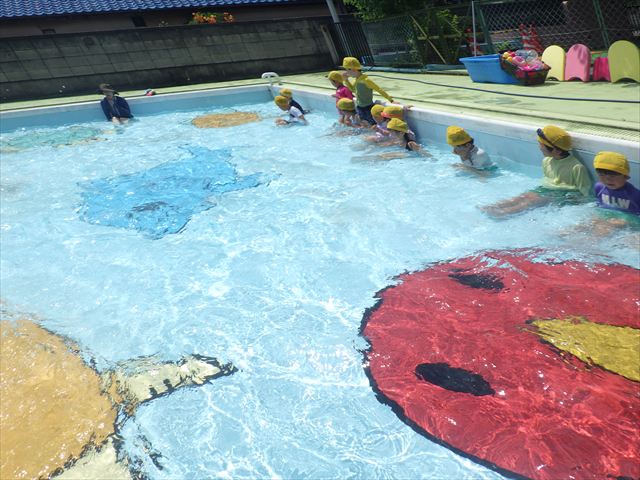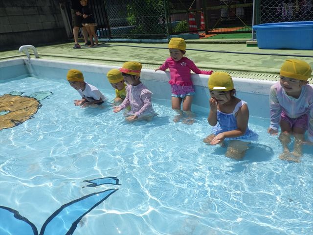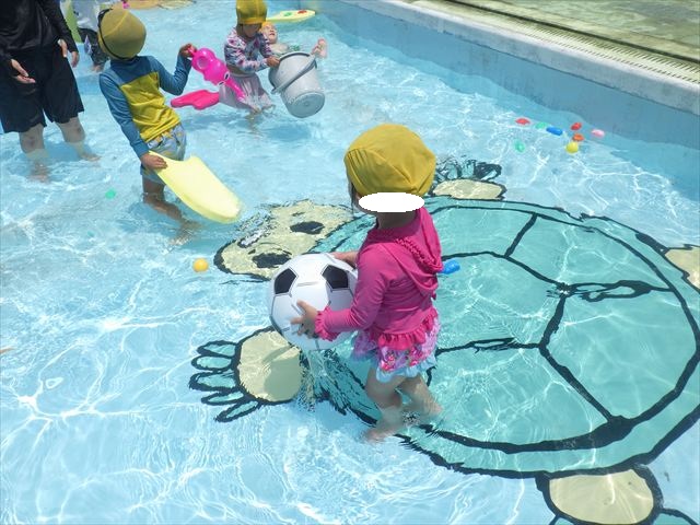 今日は、天気も良く、プール遊びを楽しみました!(^^)!今日はとても暑かったので水が気持ちよく、泳ぐ子もいたり、バタ足をする子がいたりと水にも慣れたくさん遊ぶことができました(