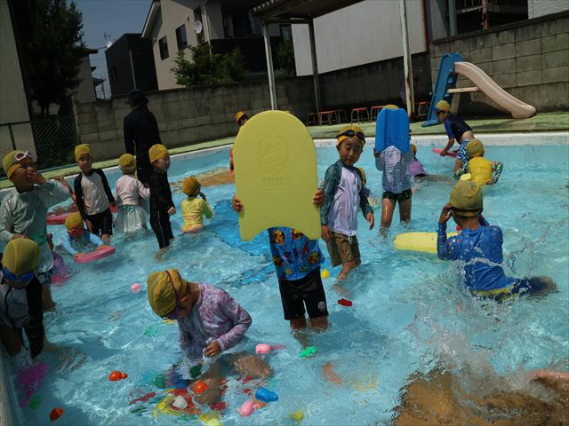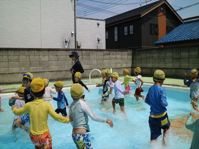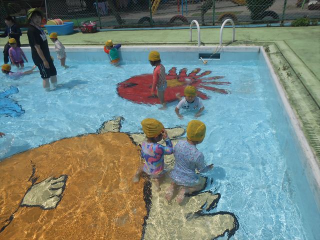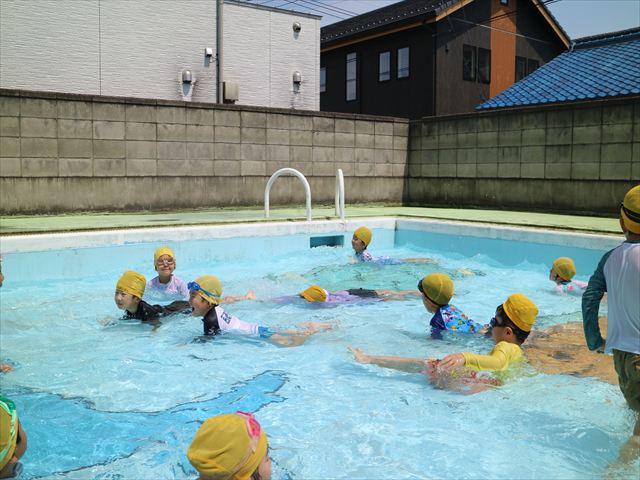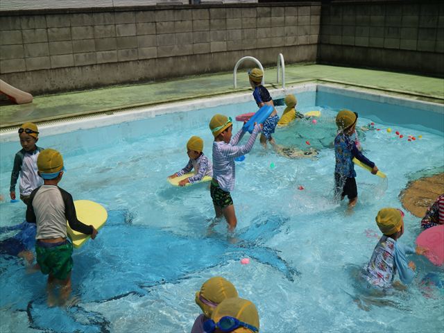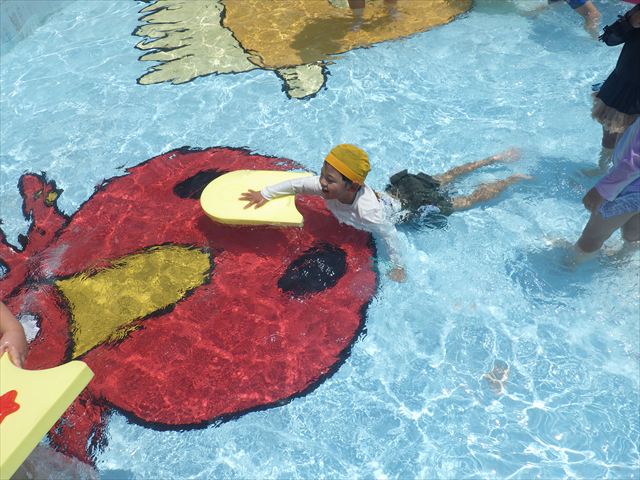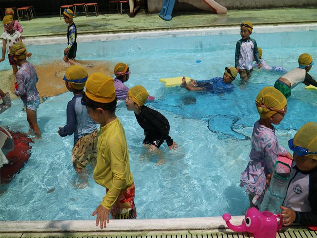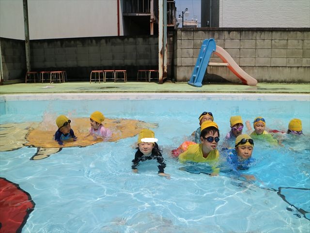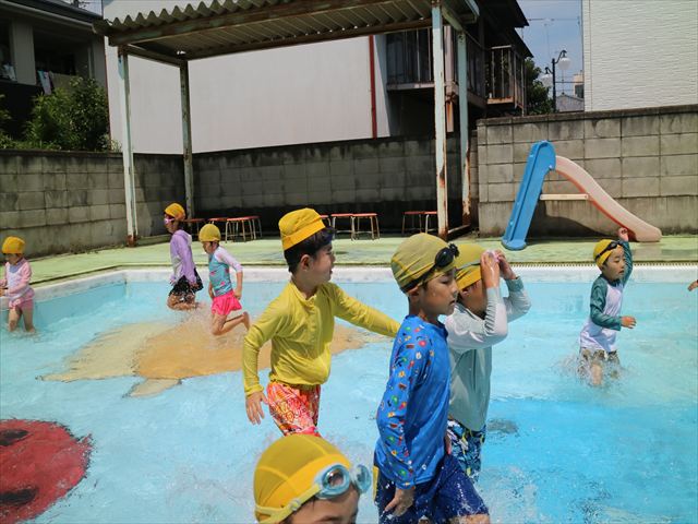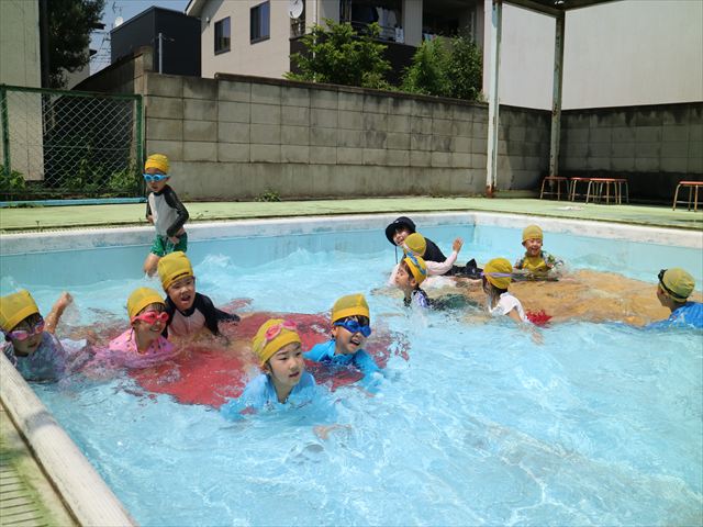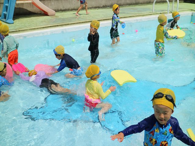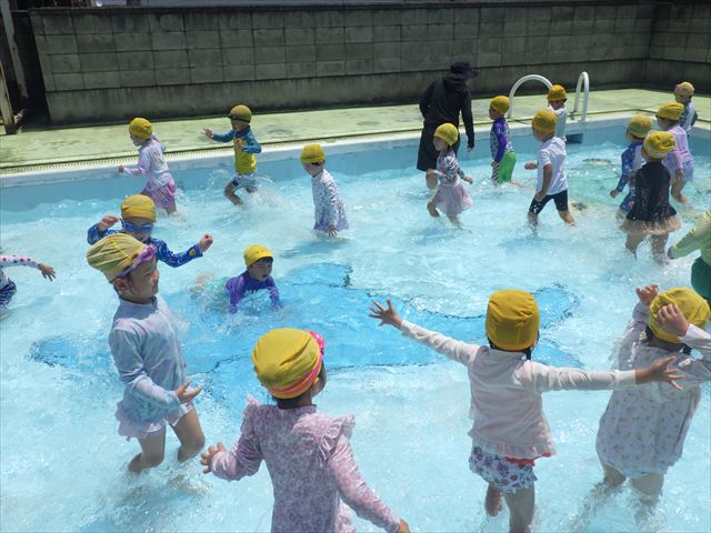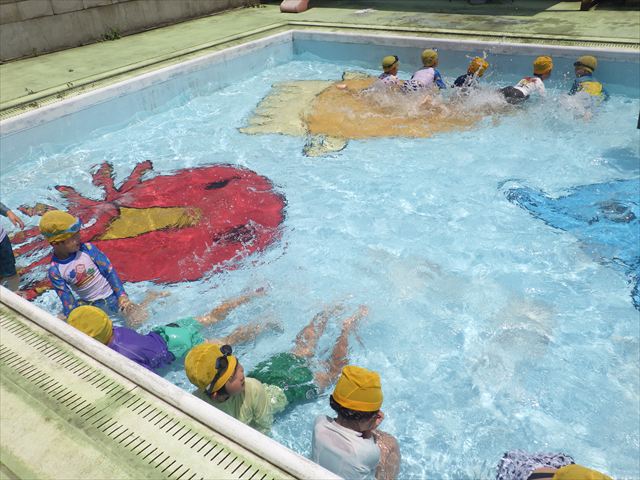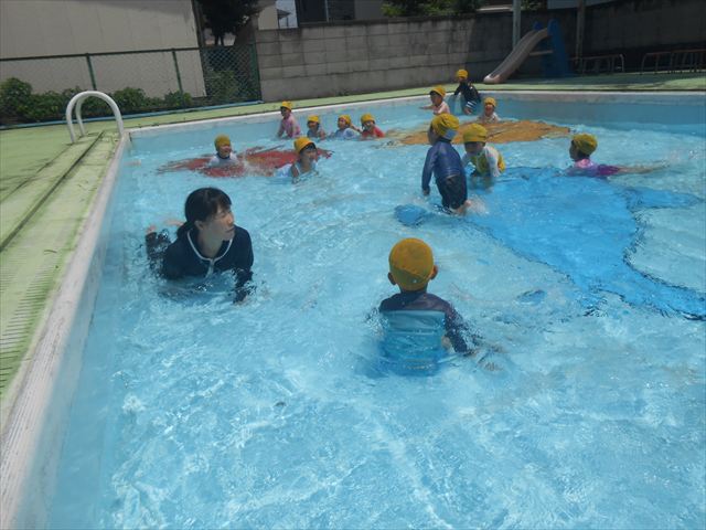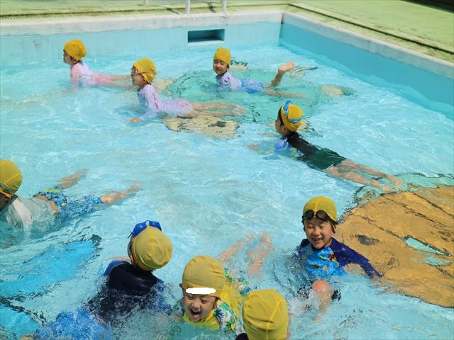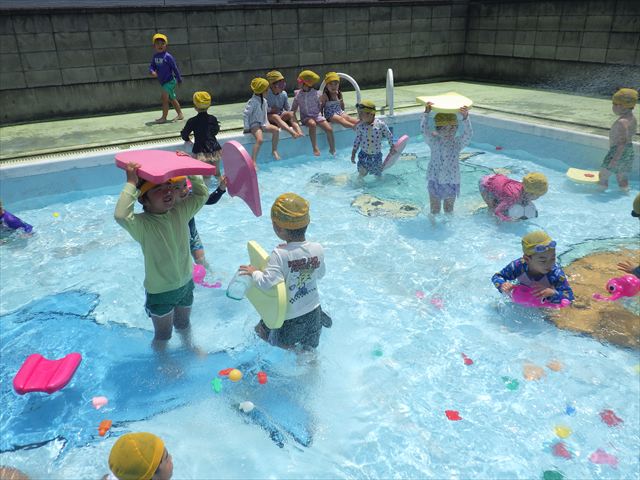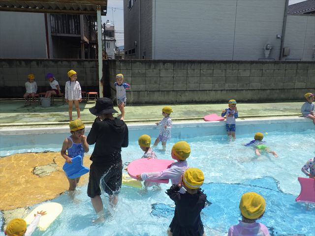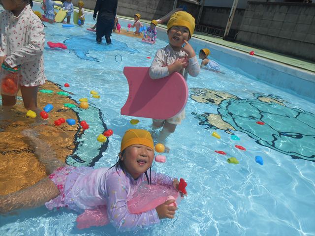 今日は、天気も良く、プール遊びを楽しみました!(^^)!今日はとても暑かったので水が気持ちよく、泳ぐ子もいたり、バタ足をする子がいたりと水にも慣れたくさん遊ぶことができました(