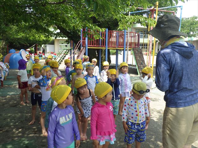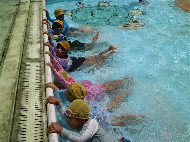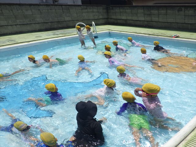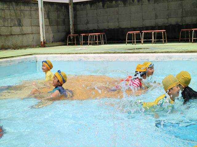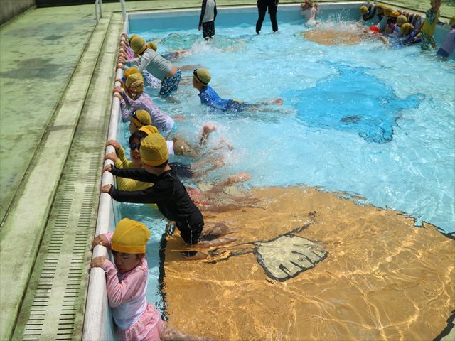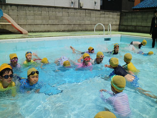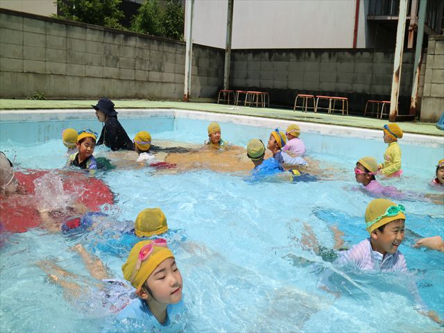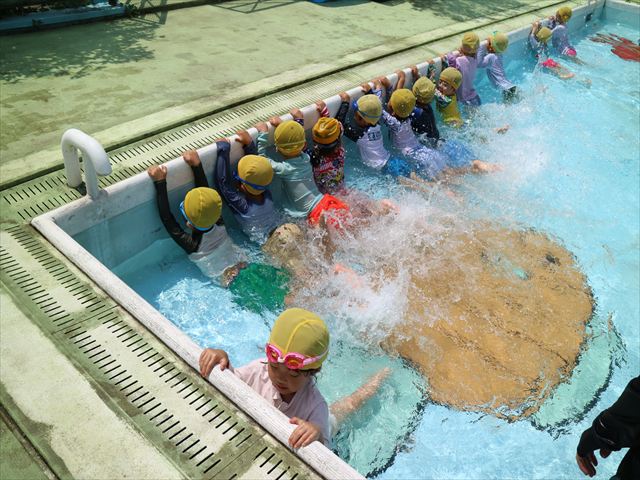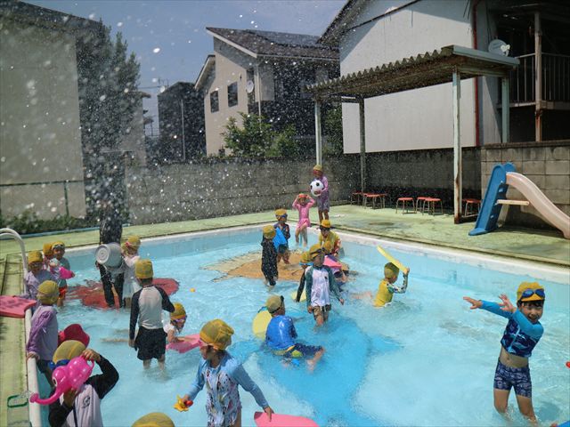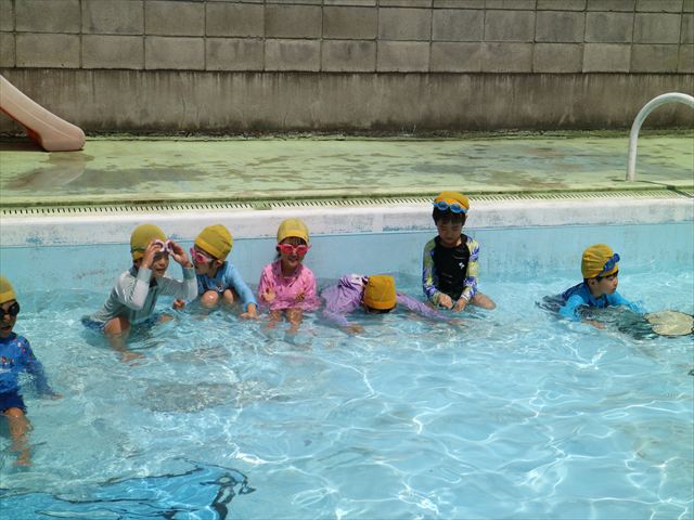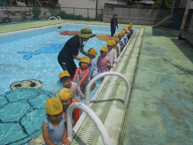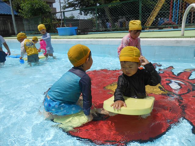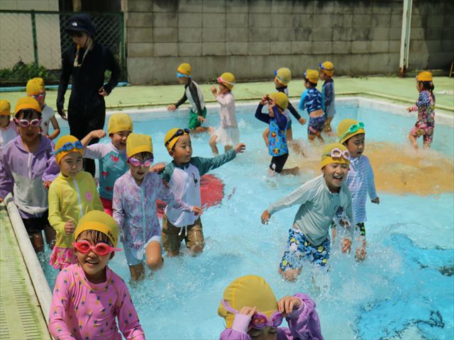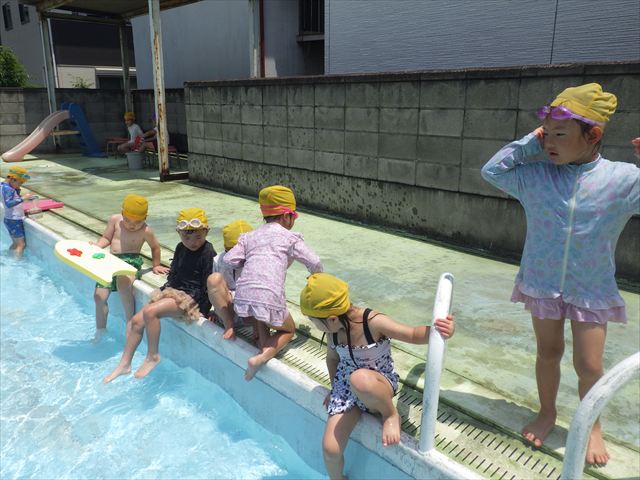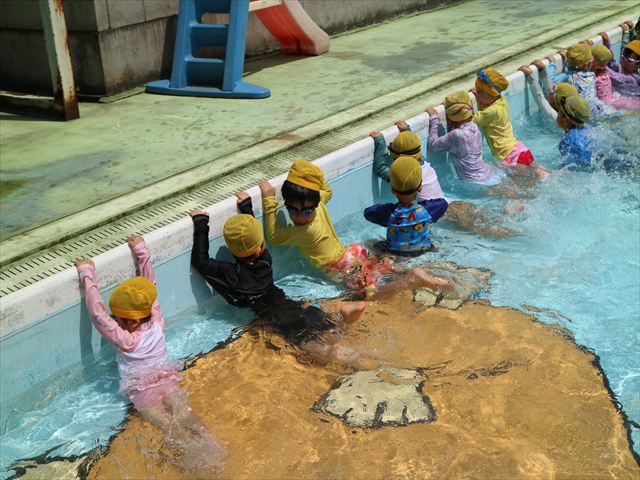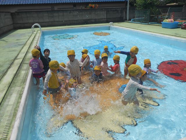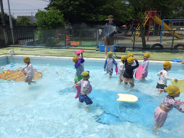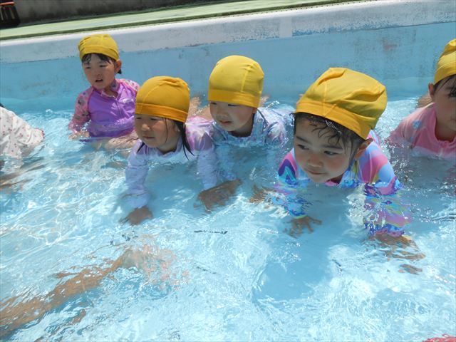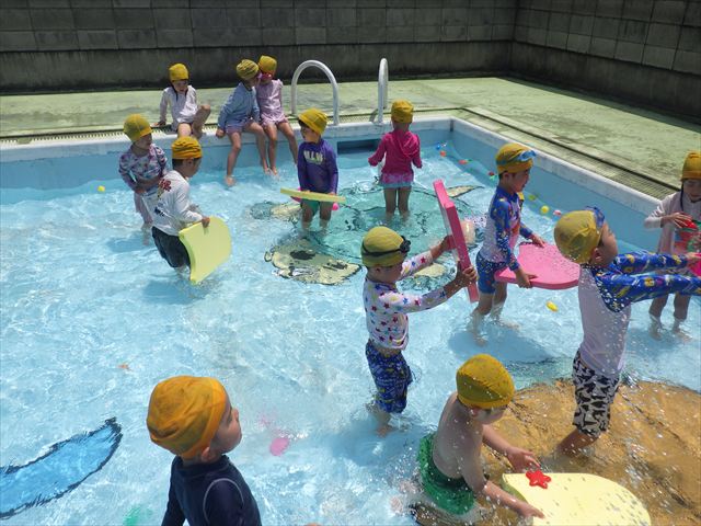 今日は、天気も良く、プール遊びを楽しみました!(^^)!今日はとても暑かったので水が気持ちよく、泳ぐ子もいたり、バタ足をする子がいたりと水にも慣れたくさん遊ぶことができました(