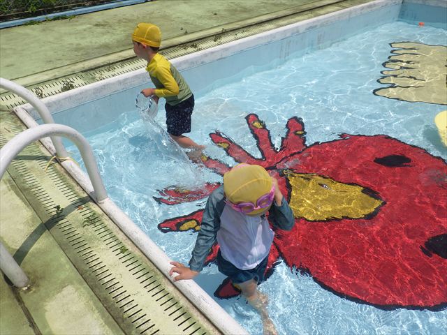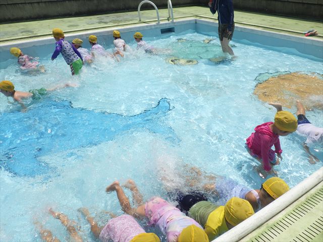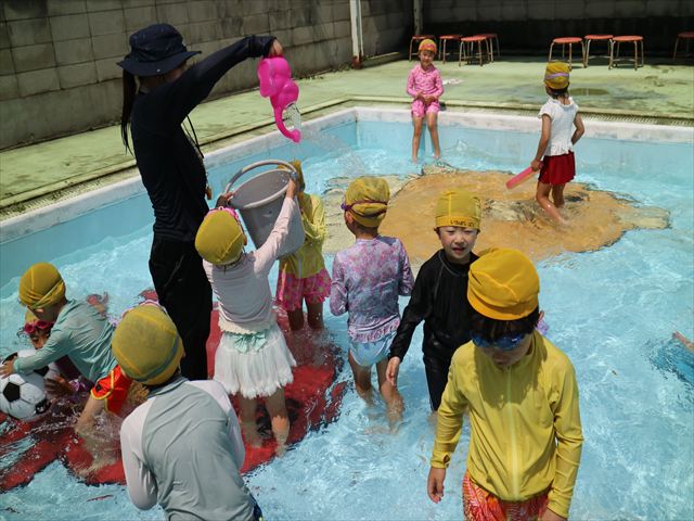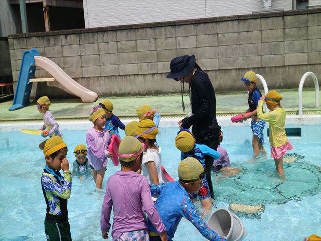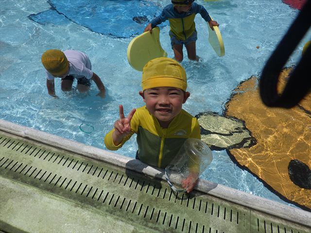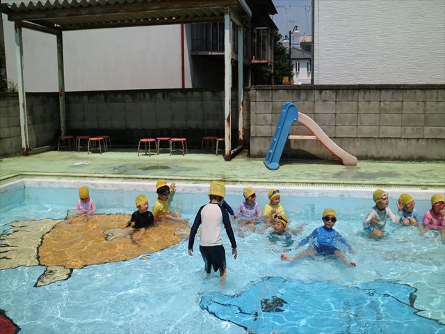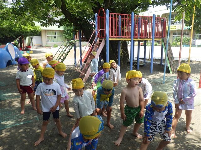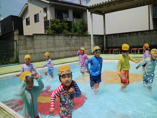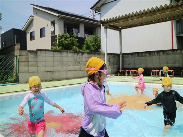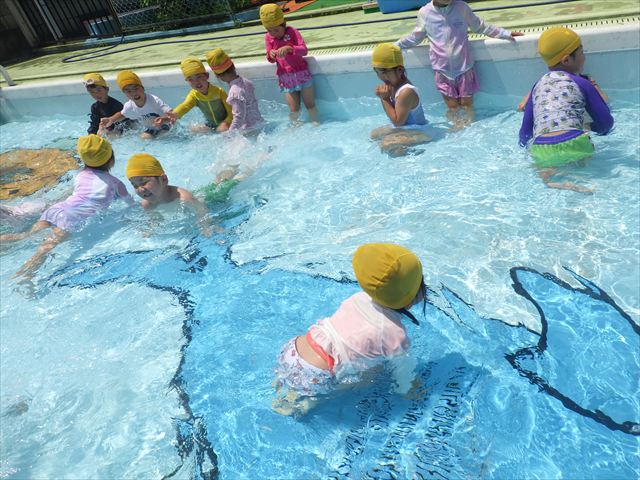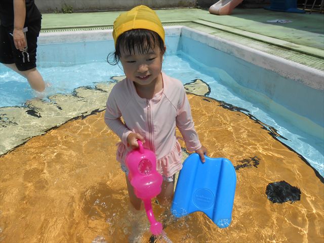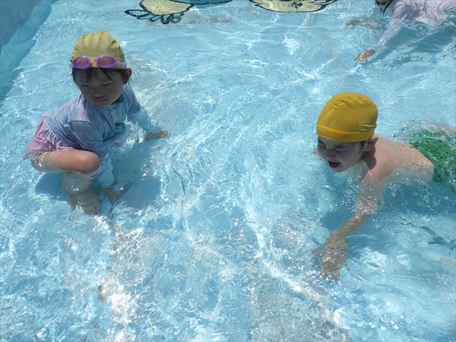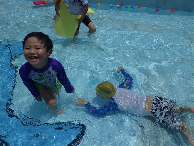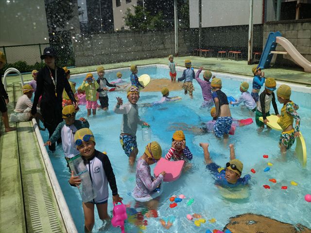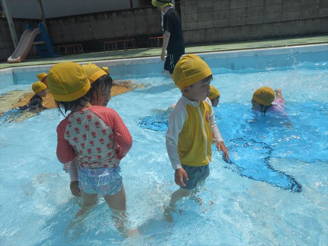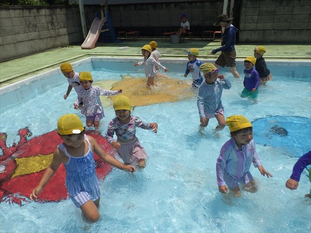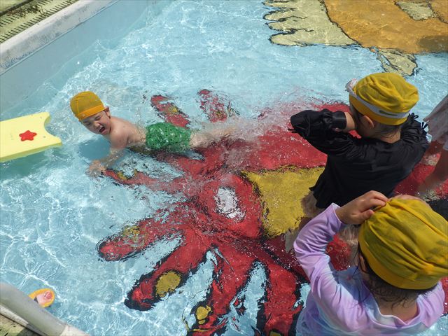 午後にプール遊びをしました。今日もとても暑くプールの水がとても気持ちよかったようです!水に顔をつけることに慣れてきた子が増えてきて自分から積極的に潜ったり、お水をかけたりすく姿も見られました!