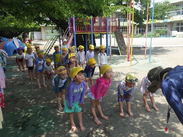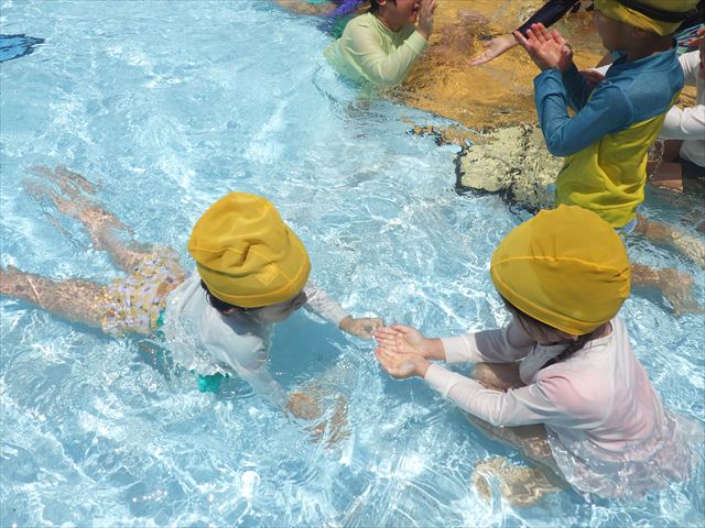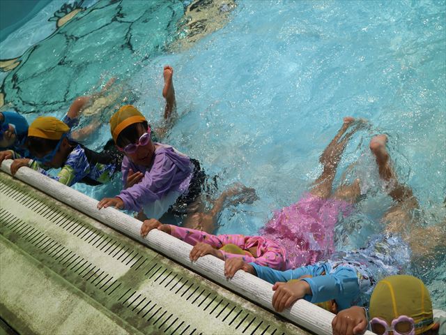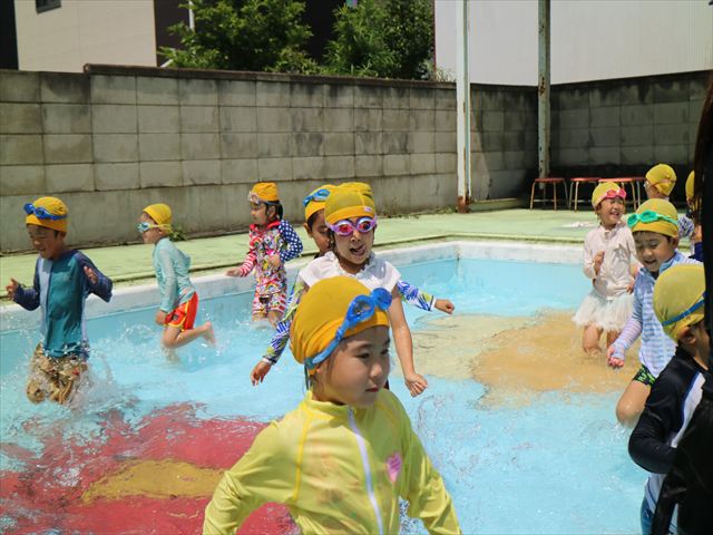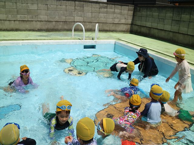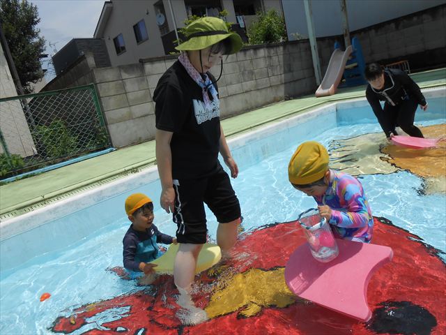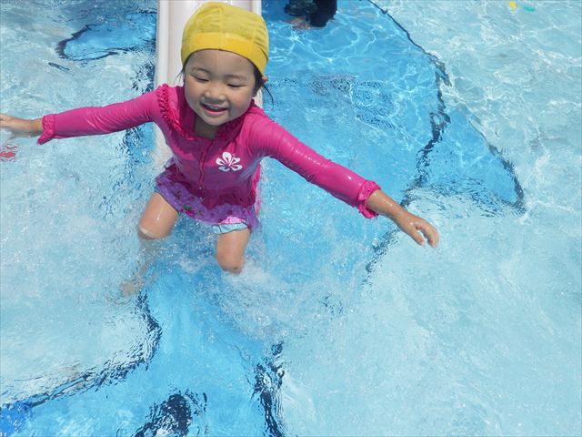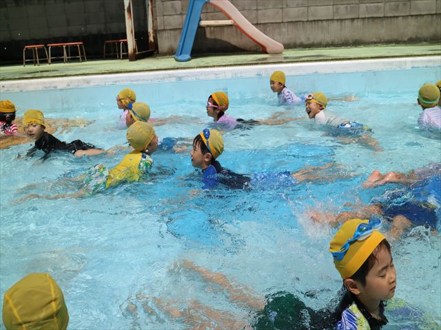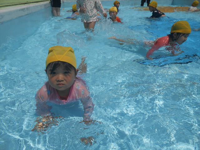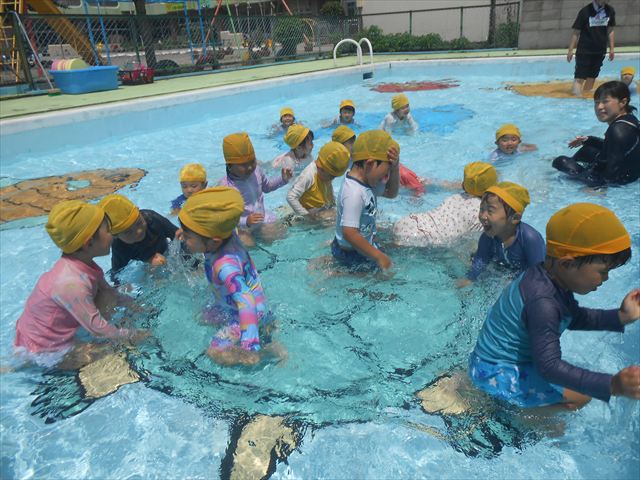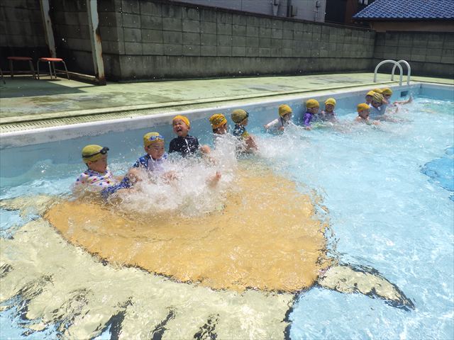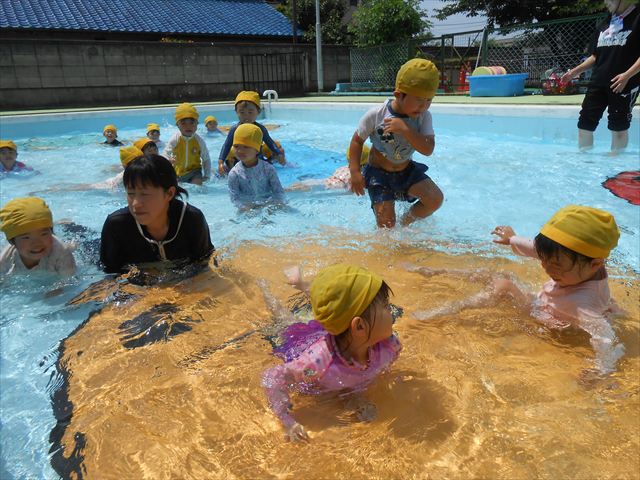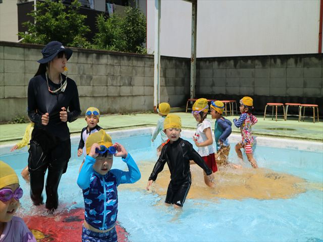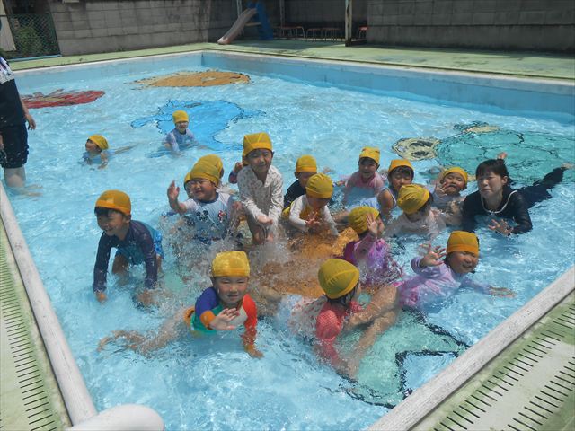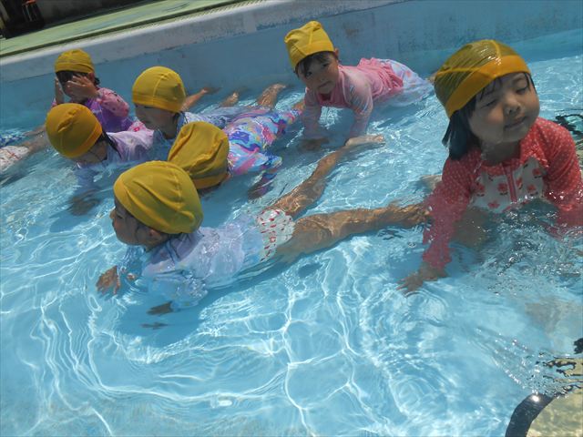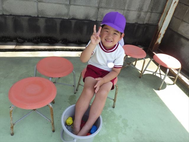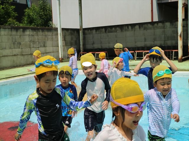 午後にプール遊びをしました。今日もとても暑くプールの水がとても気持ちよかったようです!水に顔をつけることに慣れてきた子が増えてきて自分から積極的に潜ったり、お水をかけたりすく姿も見られました!