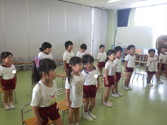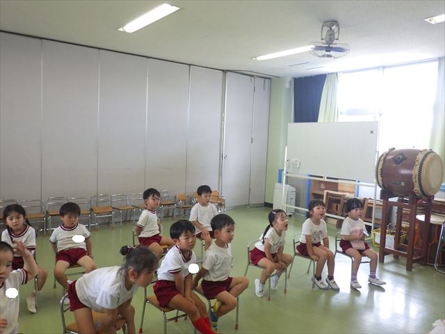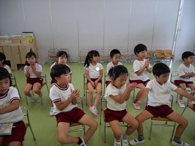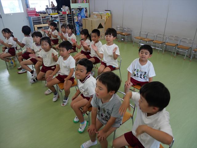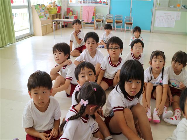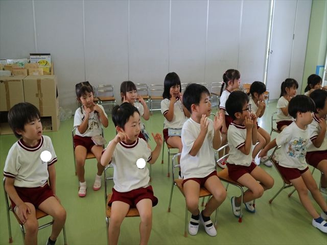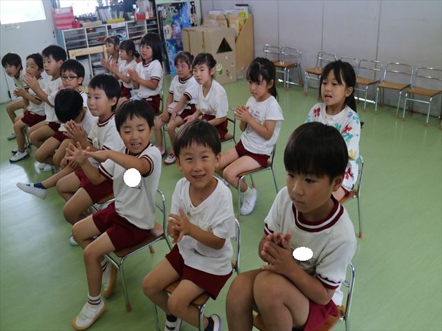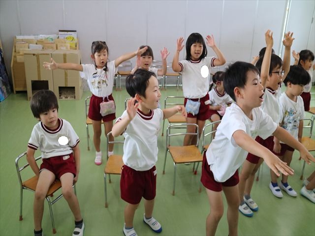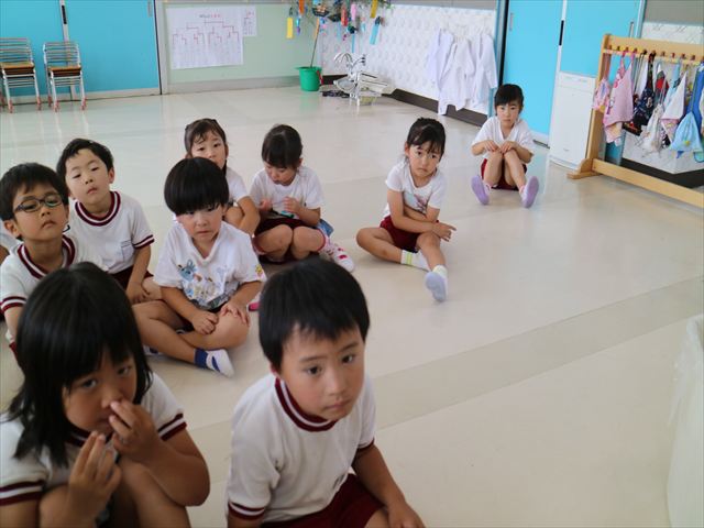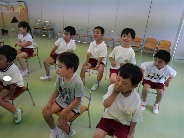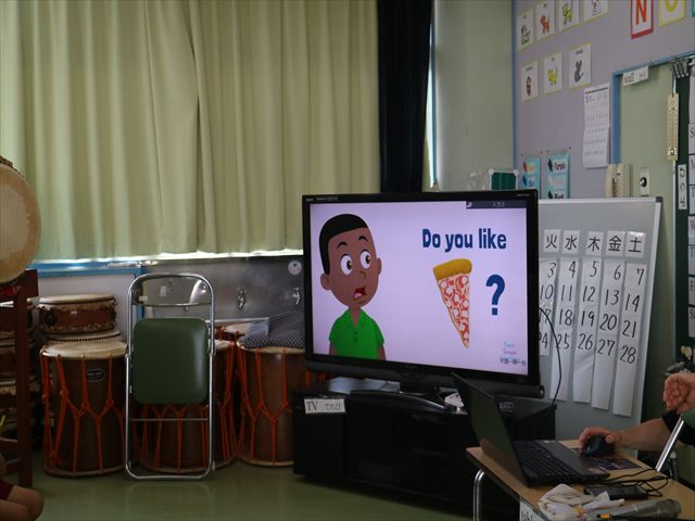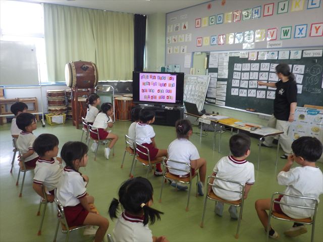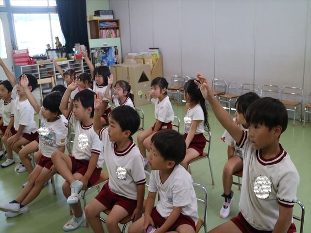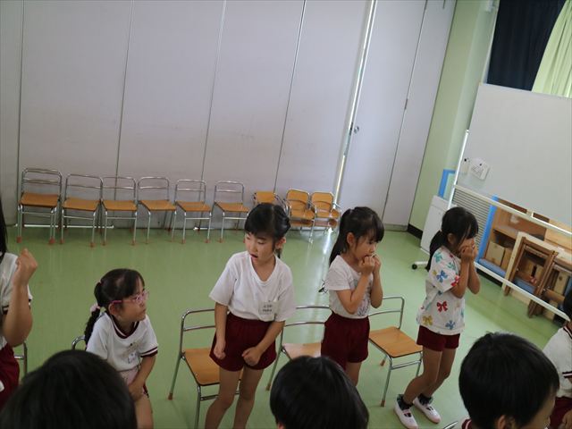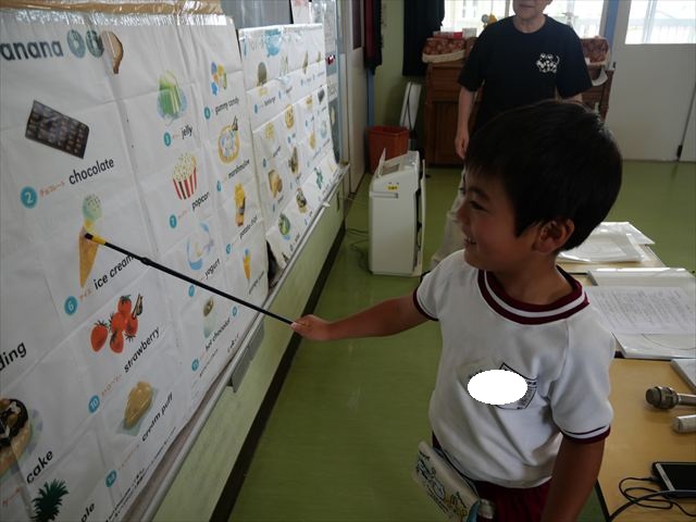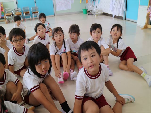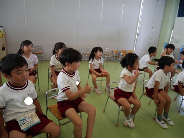 英語教室では、先日教えていただいた図形の形や「幸せなら手をたたこう」の英語バージョンや好きかどうか質問をする練習をしました!前に出てやってくれるお友達!の声を聞いて一斉に手を上げて、真剣な様子のこどもたちでした!
