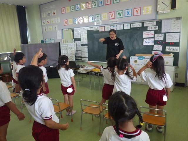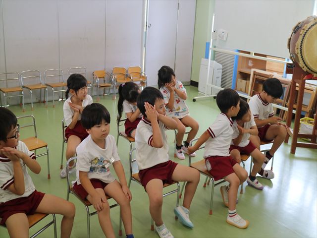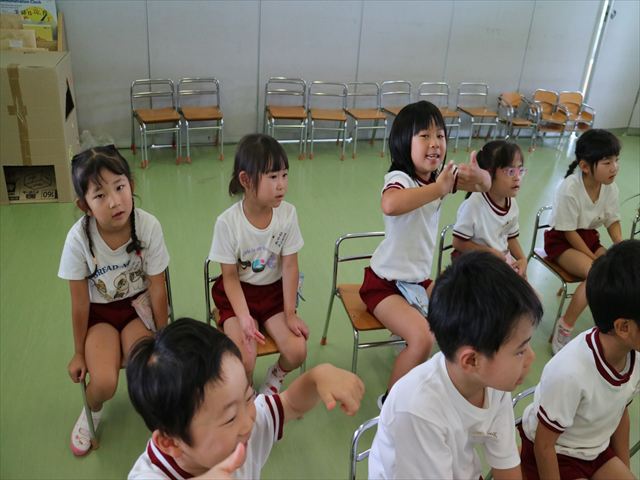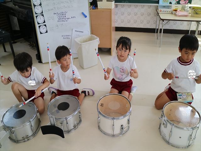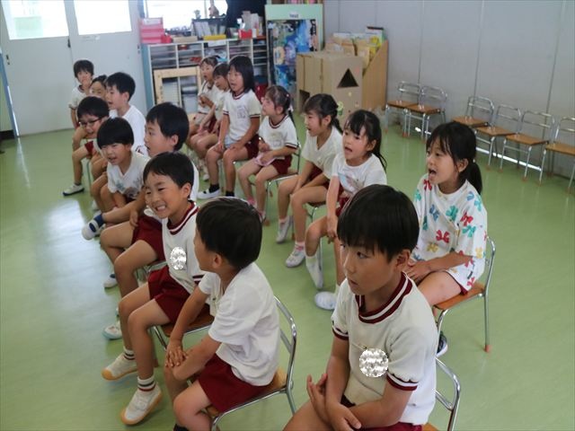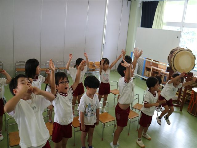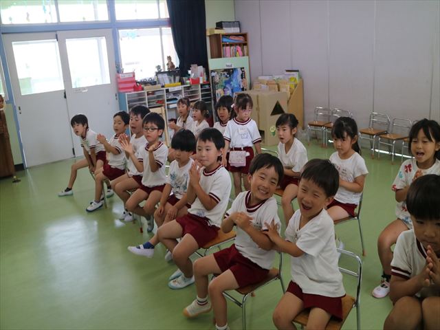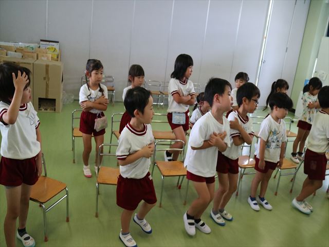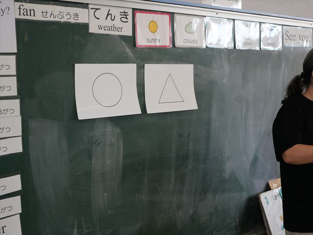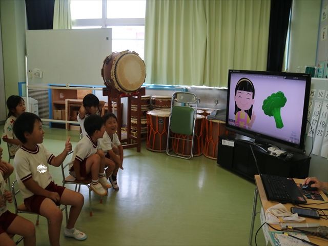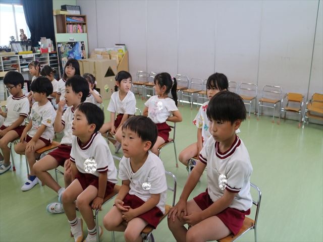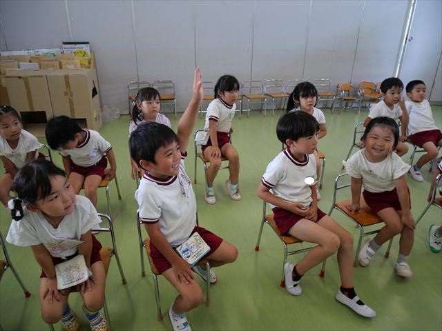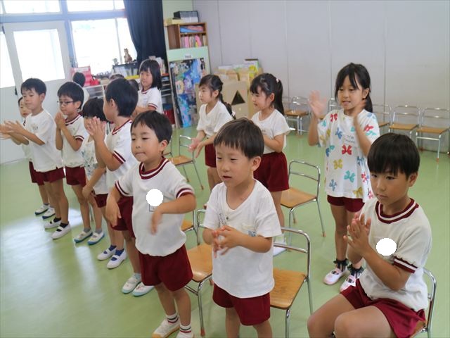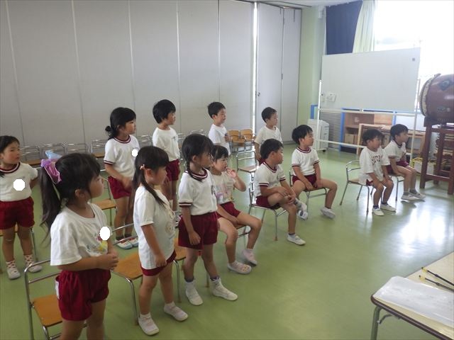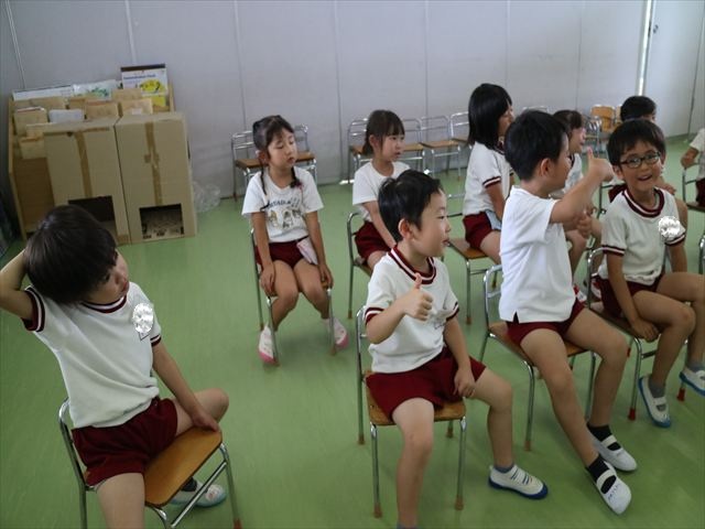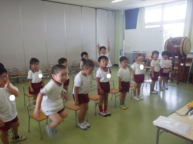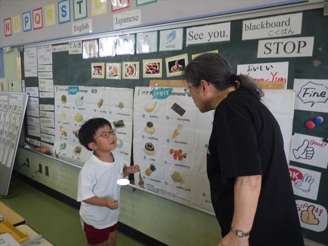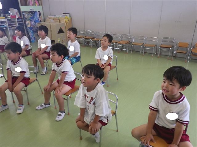 英語教室では、先日教えていただいた図形の形や「幸せなら手をたたこう」の英語バージョンや好きかどうか質問をする練習をしました!前に出てやってくれるお友達!の声を聞いて一斉に手を上げて、真剣な様子のこどもたちでした!