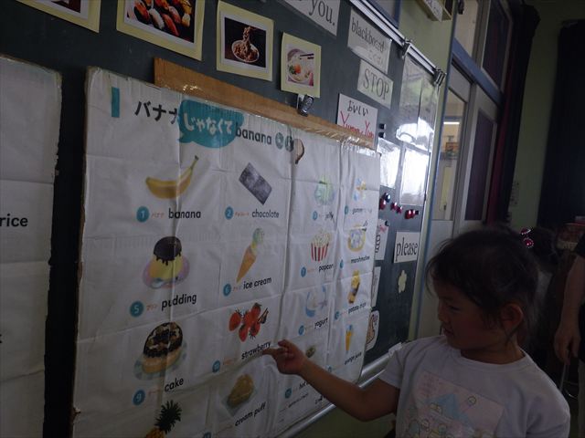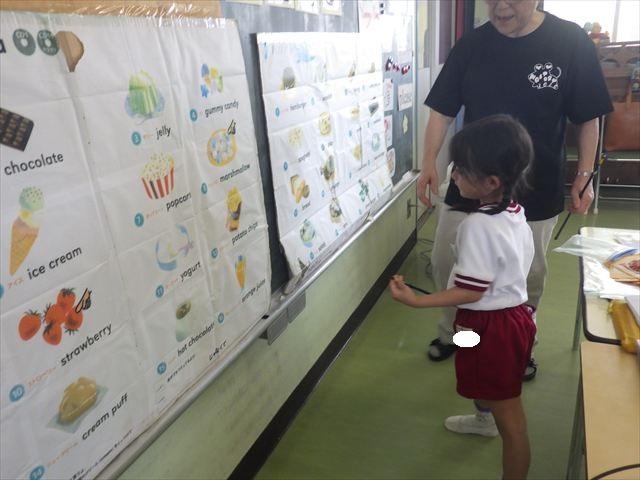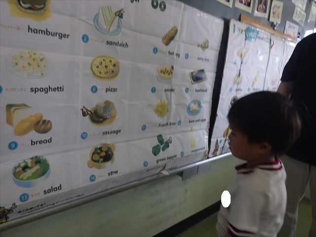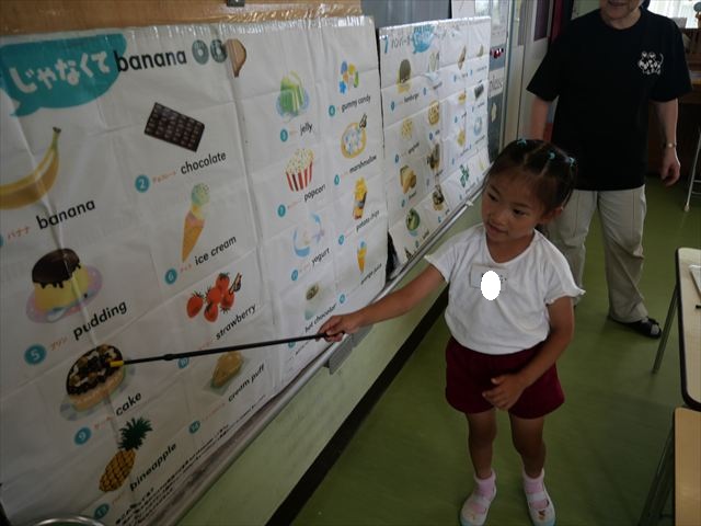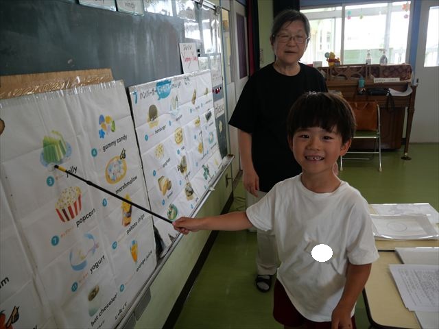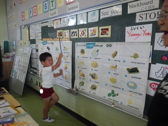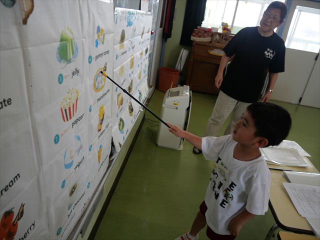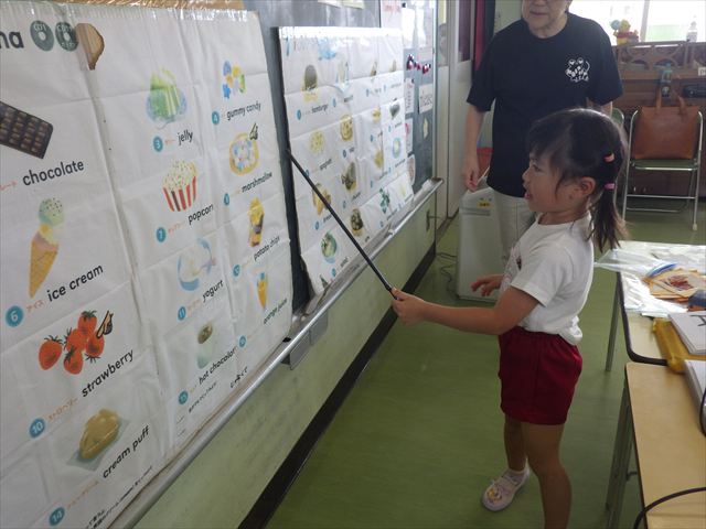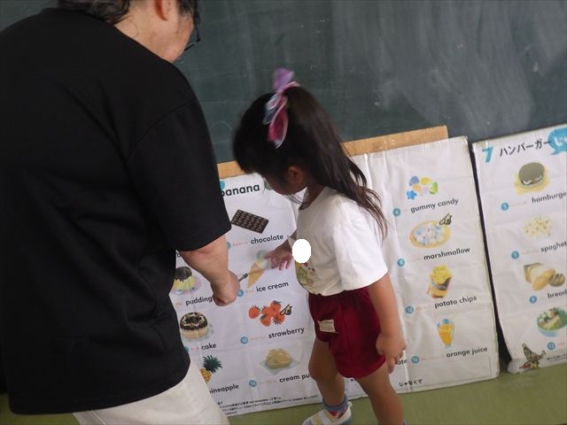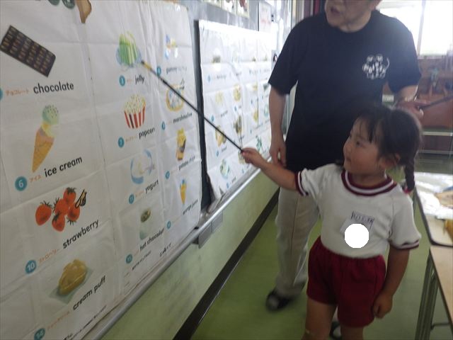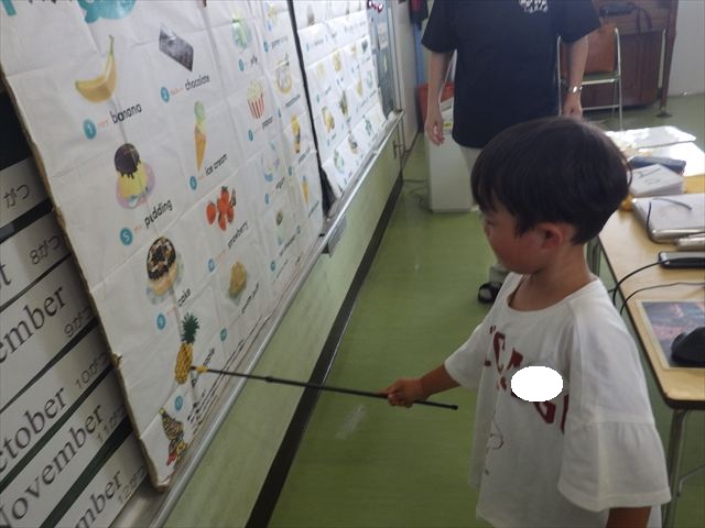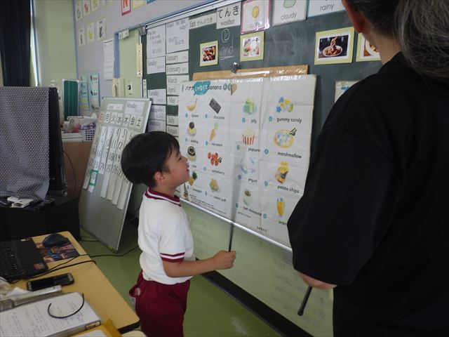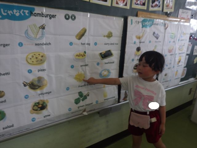 今日の英語教室は「I like~」で自分の好きな食べ物を伝える練習をしました。色々な種類の食べ物が正しく言えるようになっていてびっくりです!二つ好きな場合は、「and」を付けることも教えてもらい、子どもたちはすぐに吸収していました。またABCの曲では、一緒に口ずさみながら楽しくできました♪