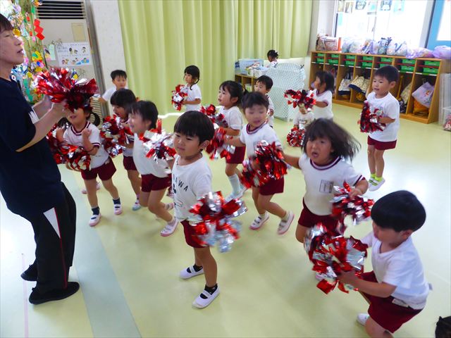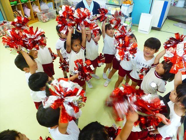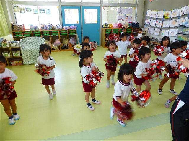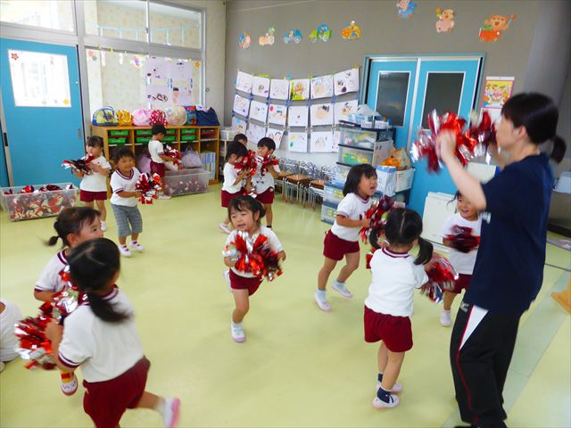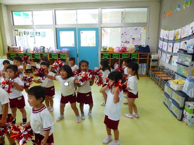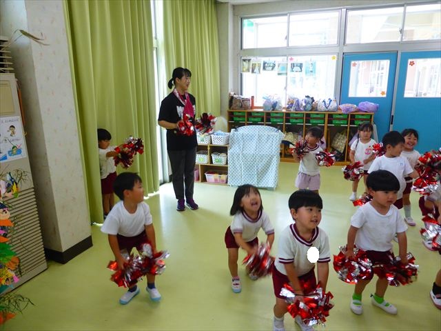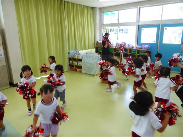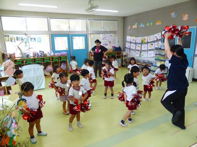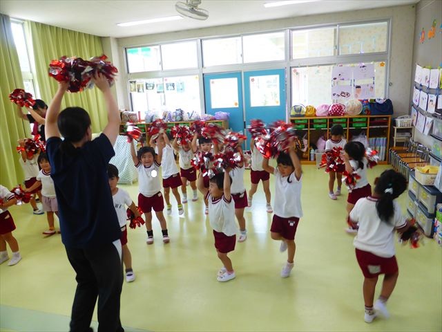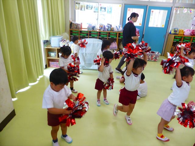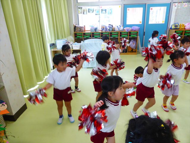 ^^)曲をかけて自由に踊ったり体を動かしたりしました。運動会で使う、キラキラのポンポンを用意すると「うわ~」「きれい」などなど盛り上がり、音を立てたり、振ったり、お友だちと一緒に踊ったりと自由に楽しむことができました。ダンスを好きになって今後のチアダンスに意欲的に参加できるといいなと思っています(