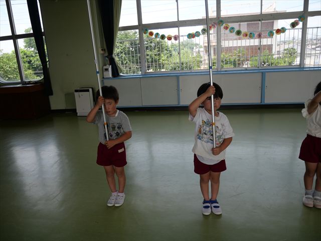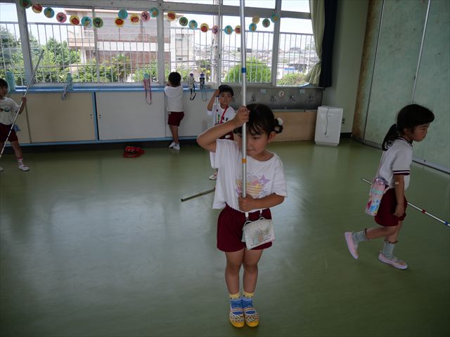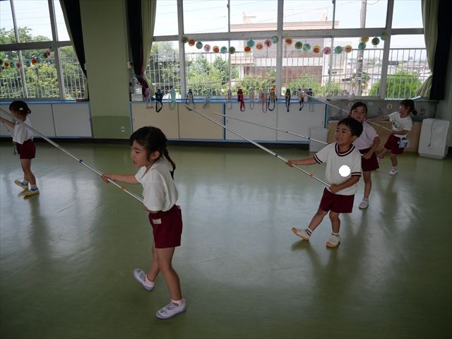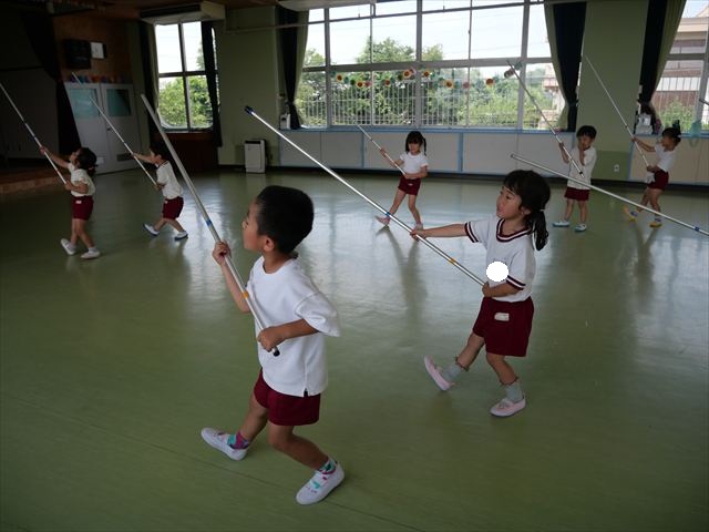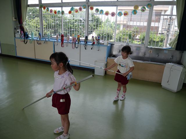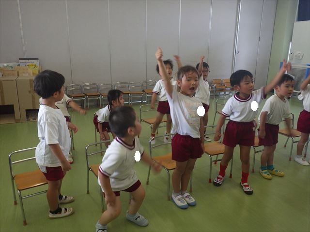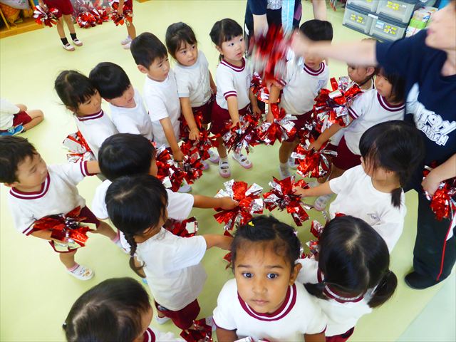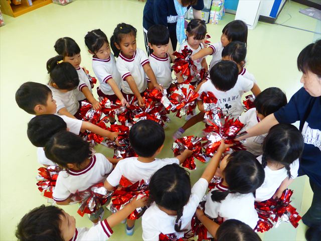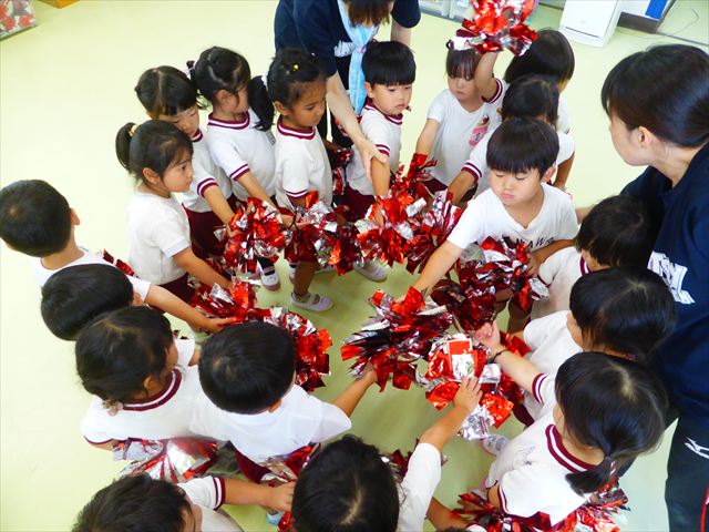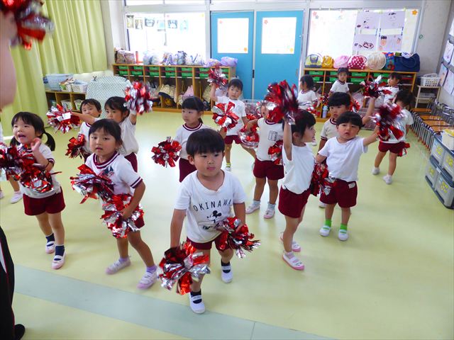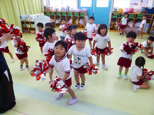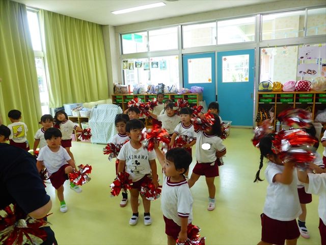 ^^)曲をかけて自由に踊ったり体を動かしたりしました。運動会で使う、キラキラのポンポンを用意すると「うわ~」「きれい」などなど盛り上がり、音を立てたり、振ったり、お友だちと一緒に踊ったりと自由に楽しむことができました。ダンスを好きになって今後のチアダンスに意欲的に参加できるといいなと思っています(