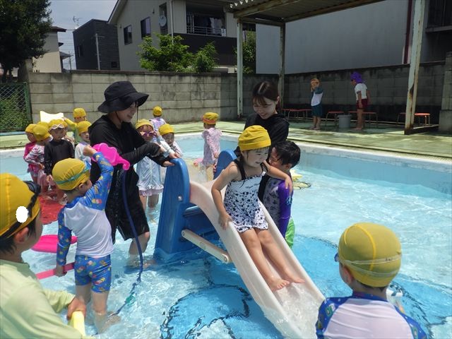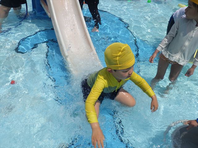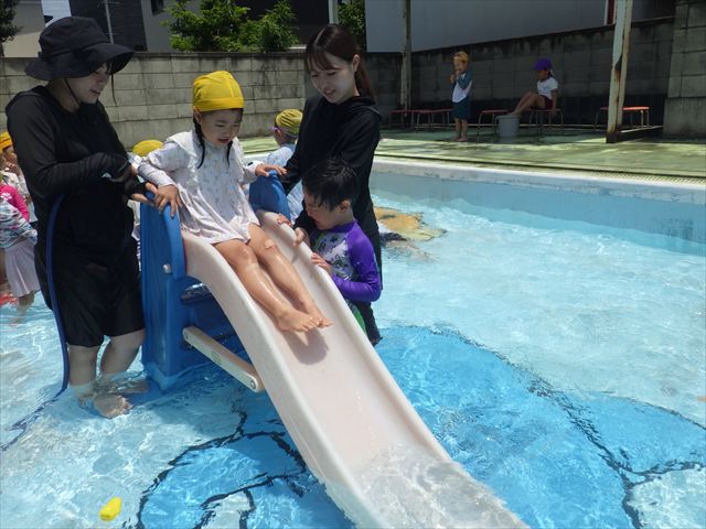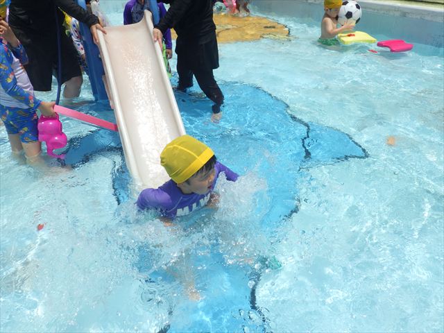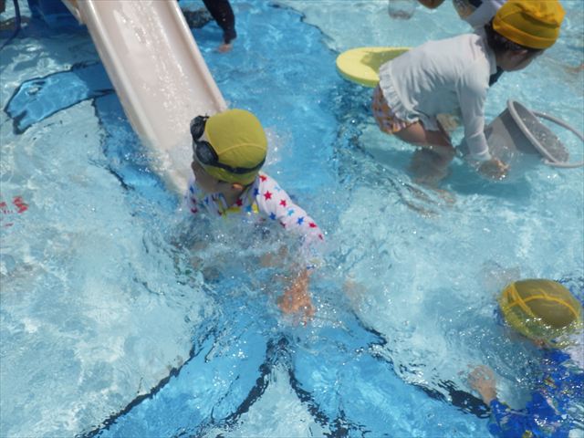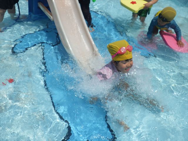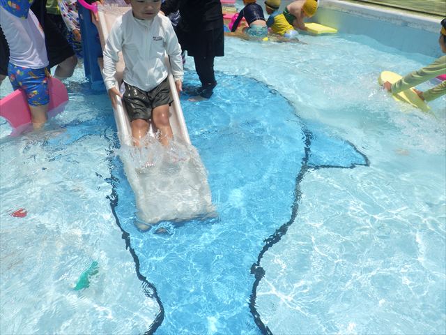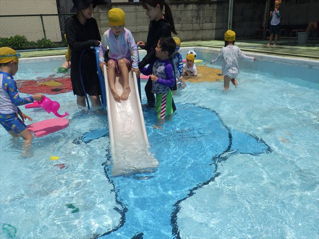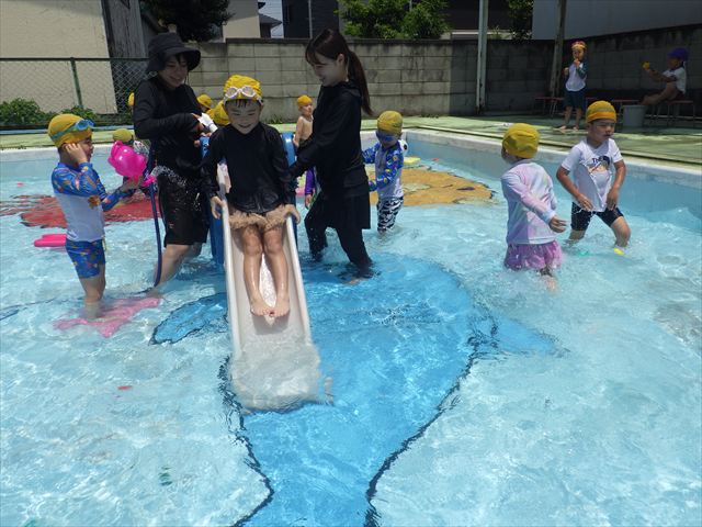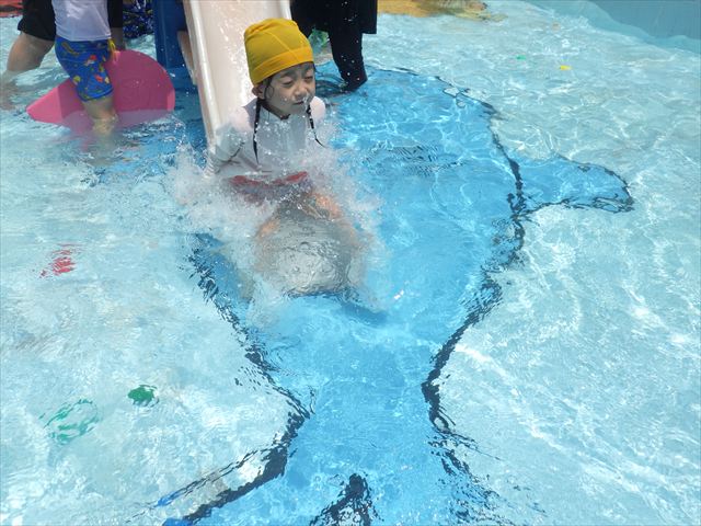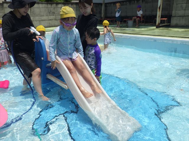 プール遊びではバタ足の練習をしたり滑り台でウオータースライダーを楽しみま今日もとても暑かったですが、ホースのシャワーを浴びたりおもちゃで自由に遊んだりして楽しく過ごせました!