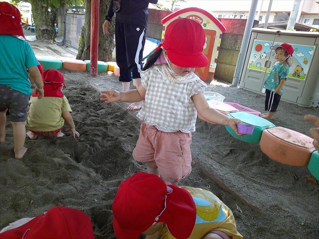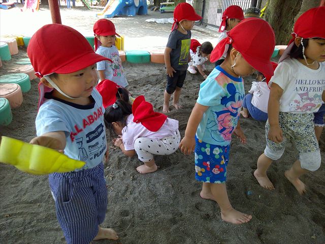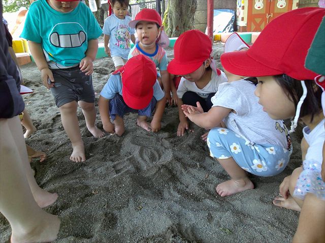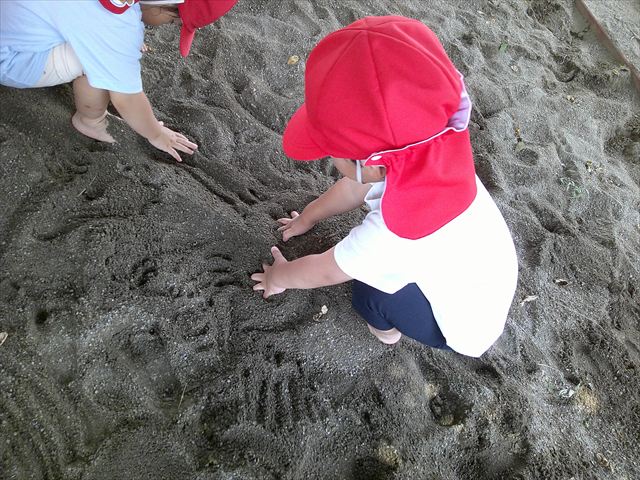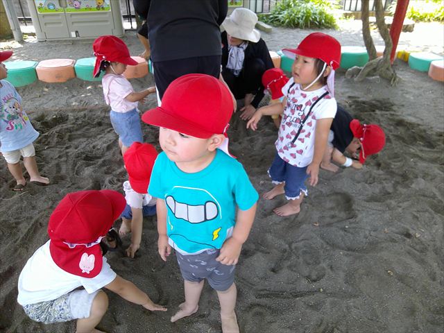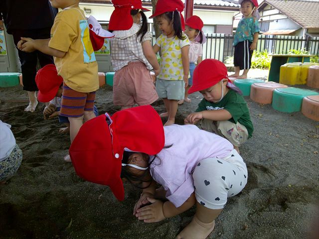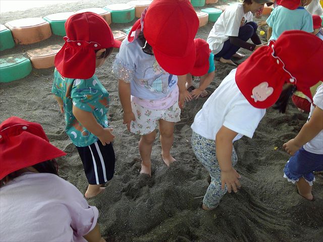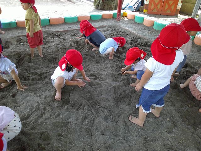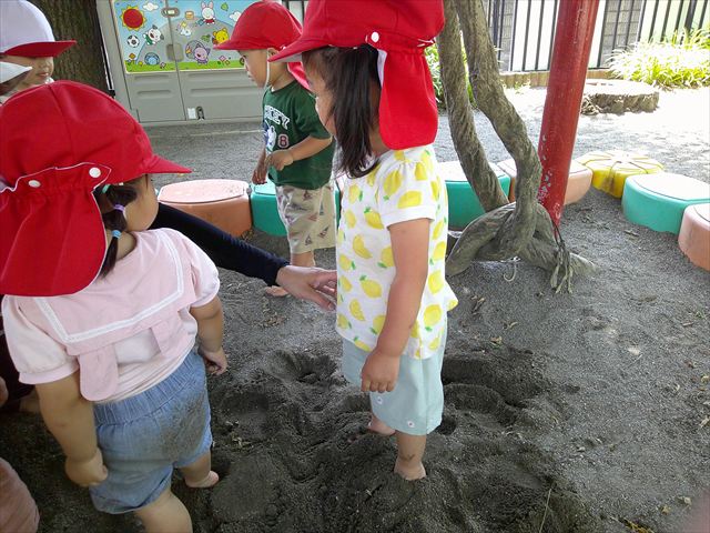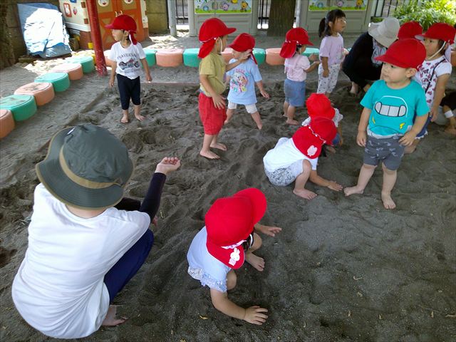 今回のたんぽぽ組は、 先週の木曜日のペイント・泥遊びを活かして、裸足で砂遊びをしてみました。泥遊びの時は砂に水が混じって泥となりましたが、今回は砂だけなので「さらさらしてる~」「おすなつめたーい!」とまた違った感想が聞かれました。せっかくなので、みんなで砂の中に足をかくれんぼ♪砂風呂のような足が埋まる感覚に「きゃー!」と大興奮でした!(^^)!その後は、お友だちは砂山に登りに行き、先生たちがおもちゃを隠して宝探しです!手や足を使って砂を掘り起こし、おもちゃをたくさん見つけられました☆裸足で砂に触れる感覚を、存分に味わえたかと思います。また、裸足で遊べるのは今日だけだという話もしました。明日からは通常通り靴を履いて遊びますのでご了承ください<(_ _)>