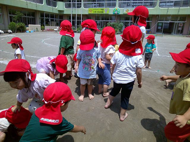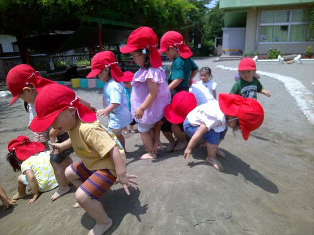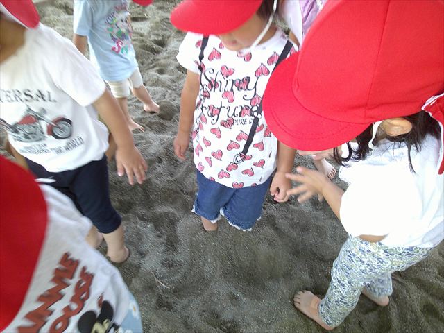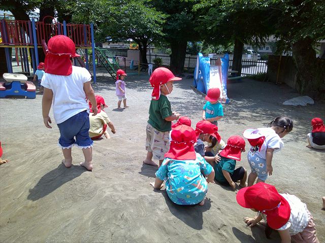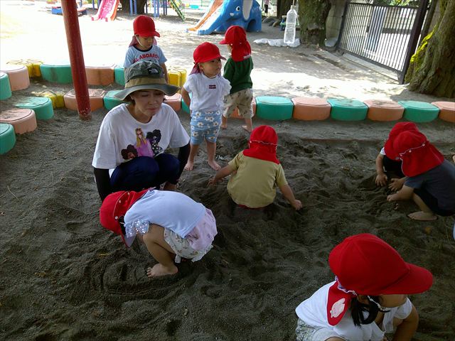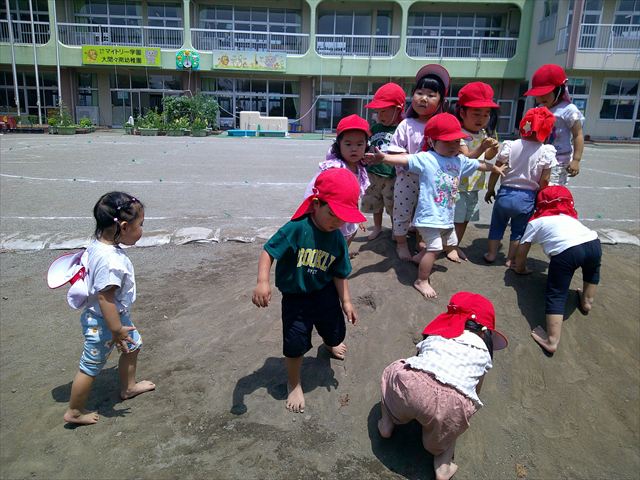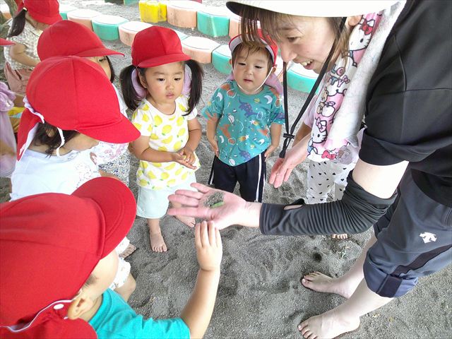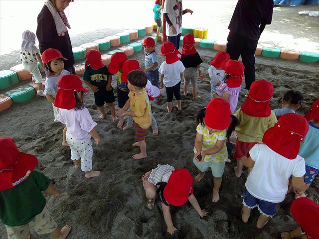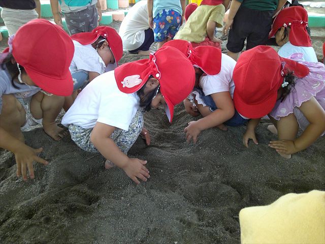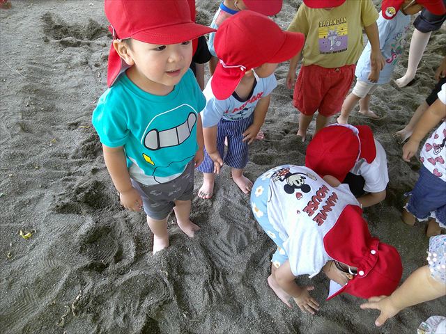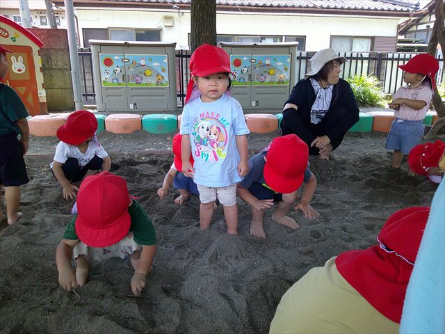 今回のたんぽぽ組は、 先週の木曜日のペイント・泥遊びを活かして、裸足で砂遊びをしてみました。泥遊びの時は砂に水が混じって泥となりましたが、今回は砂だけなので「さらさらしてる~」「おすなつめたーい!」とまた違った感想が聞かれました。せっかくなので、みんなで砂の中に足をかくれんぼ♪砂風呂のような足が埋まる感覚に「きゃー!」と大興奮でした!(^^)!その後は、お友だちは砂山に登りに行き、先生たちがおもちゃを隠して宝探しです!手や足を使って砂を掘り起こし、おもちゃをたくさん見つけられました☆裸足で砂に触れる感覚を、存分に味わえたかと思います。また、裸足で遊べるのは今日だけだという話もしました。明日からは通常通り靴を履いて遊びますのでご了承ください<(_ _)>
