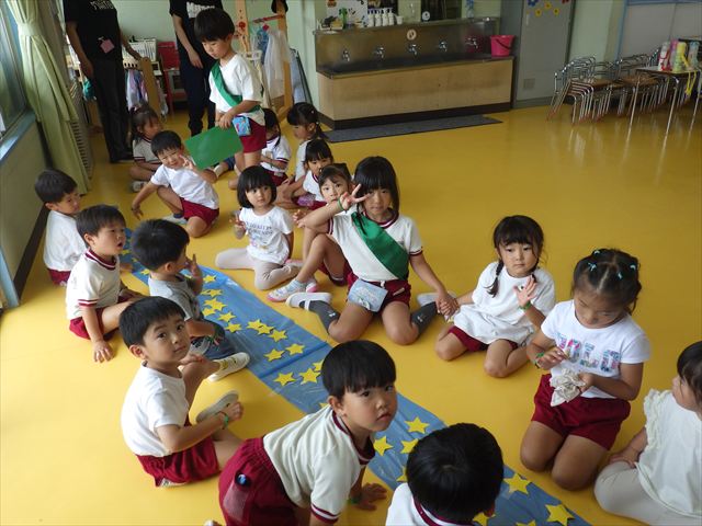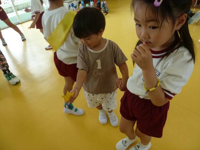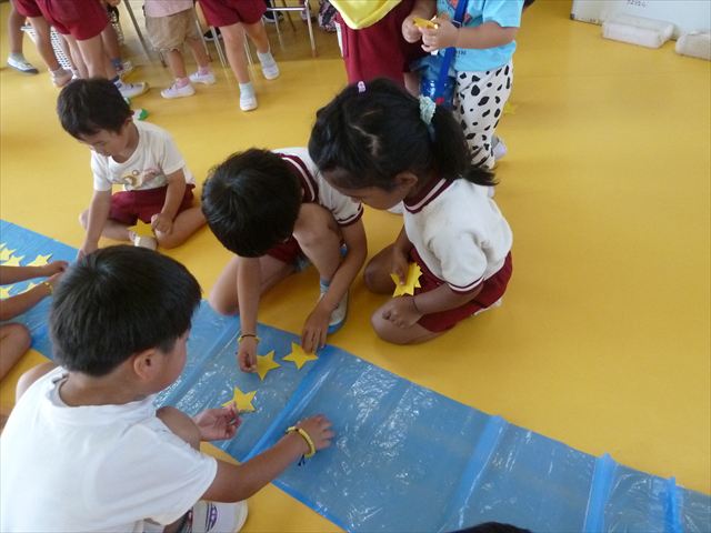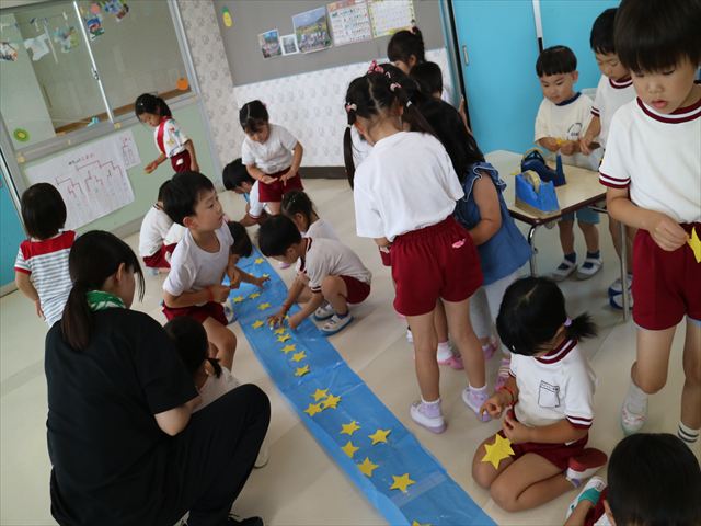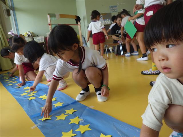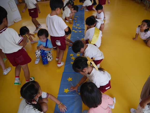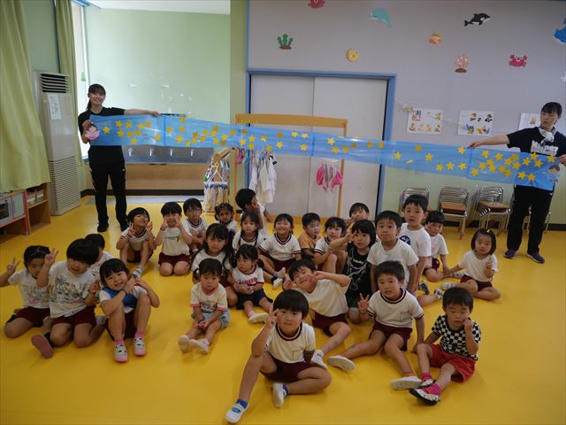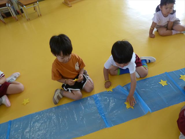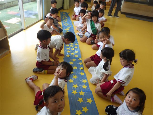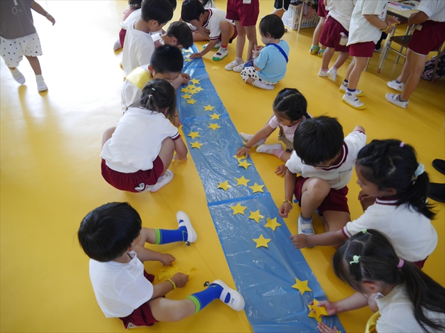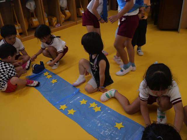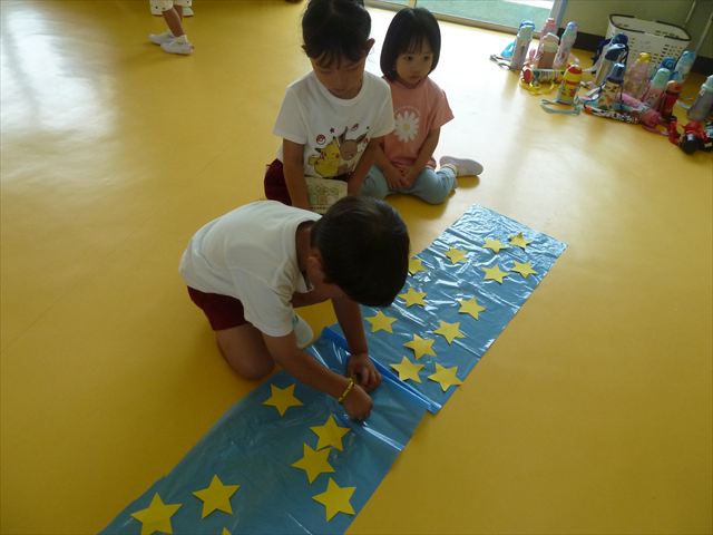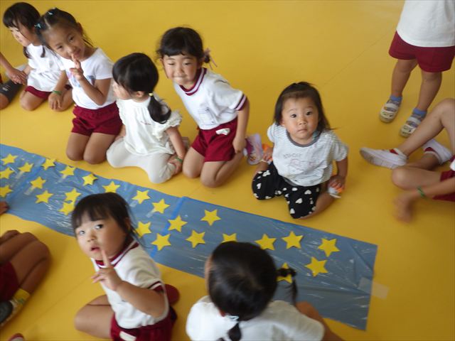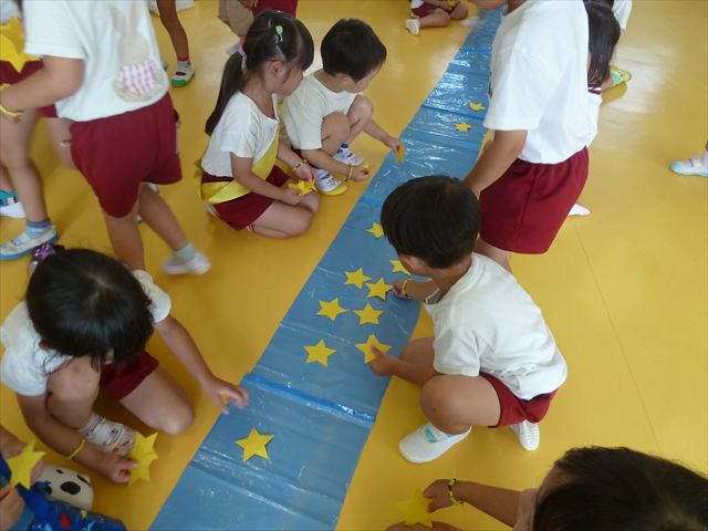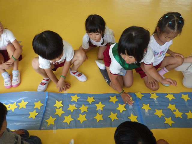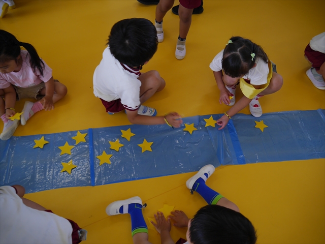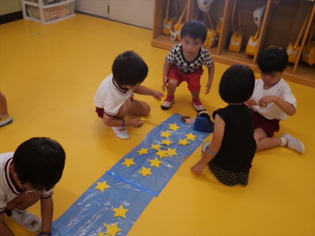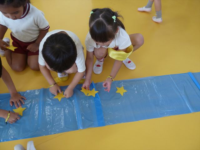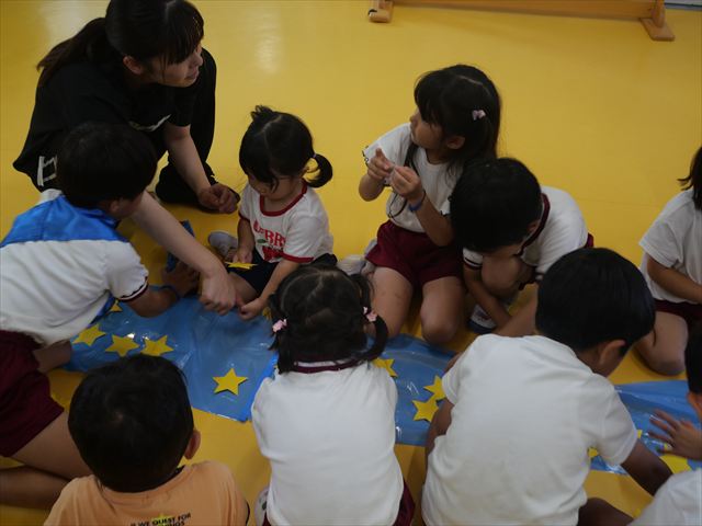今日の第3回は、初めてたんぽぽさんたちが参加するので、「自己紹介」をしたあと、仲間意識を高めるため「手遊び」や「宝探し&天の川を作ろう!」などを行いました。年長さんがリーダーとなって年中さんや年少さん、たんぽぽさんたちの面倒を見ながら、みんな仲良く楽しく遊べたようで何よりです! (^^)b ヘ(^o^)/ (*^^*)