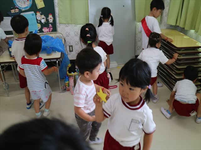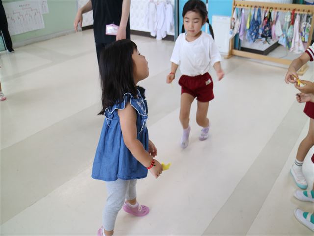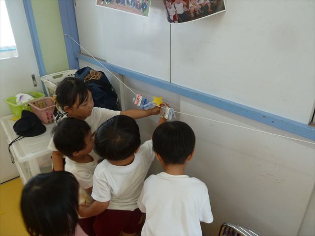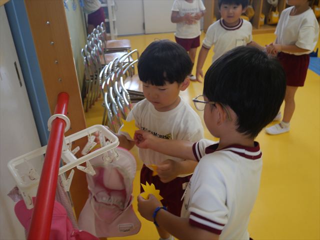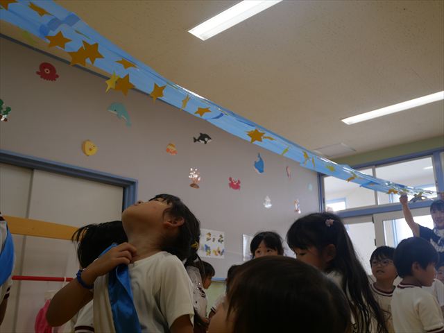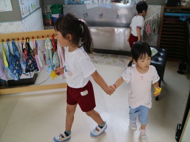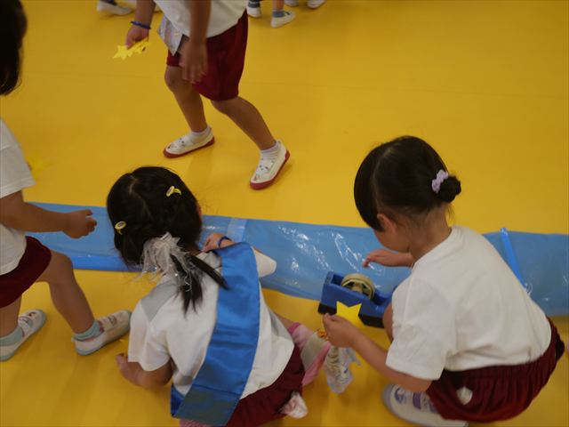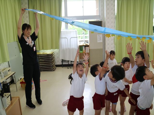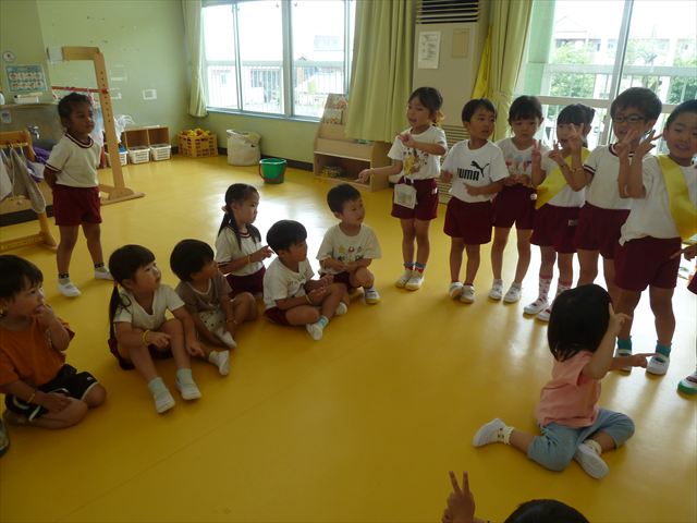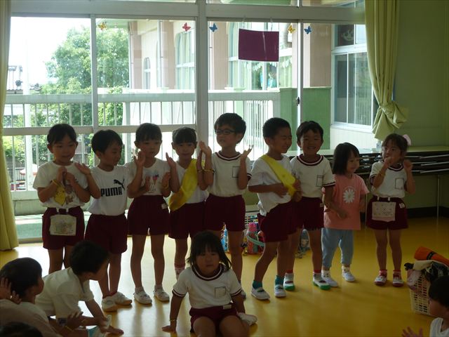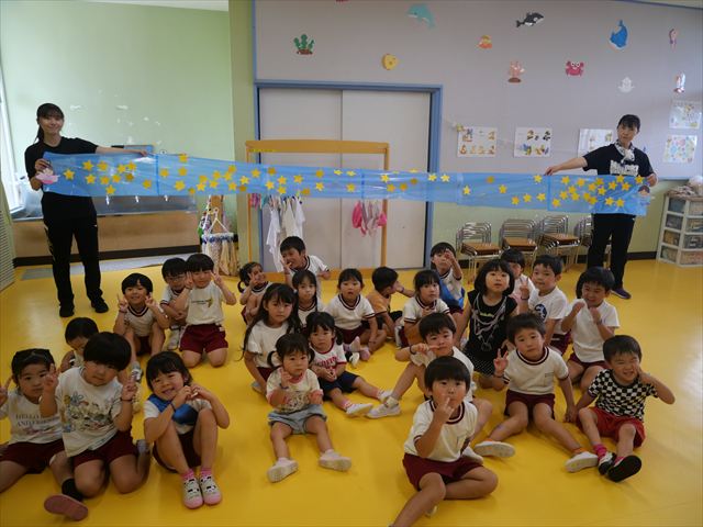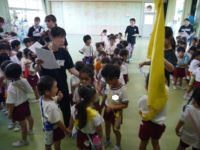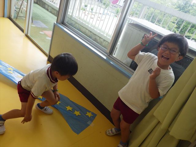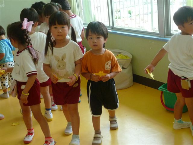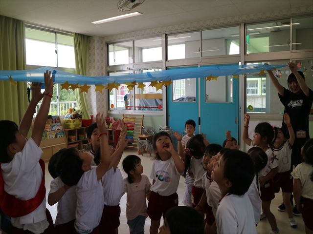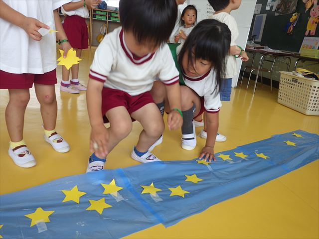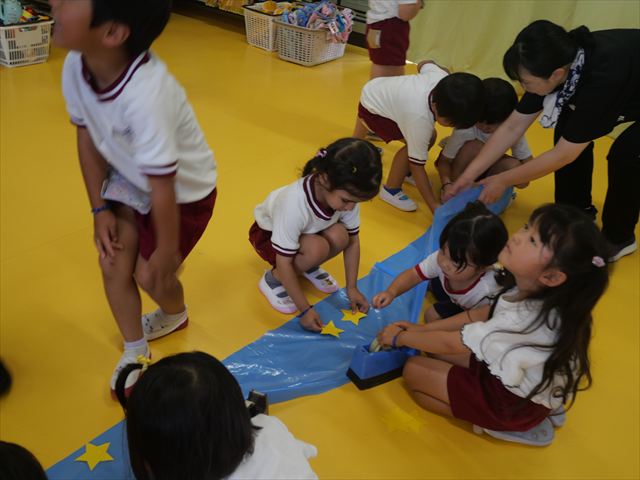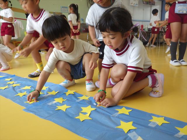 今日の第3回は、初めてたんぽぽさんたちが参加するので、「自己紹介」をしたあと、仲間意識を高めるため「手遊び」や「宝探し&天の川を作ろう!」などを行いました。年長さんがリーダーとなって年中さんや年少さん、たんぽぽさんたちの面倒を見ながら、みんな仲良く楽しく遊べたようで何よりです! (^^)b ヘ(^o^)/ (*^^*)