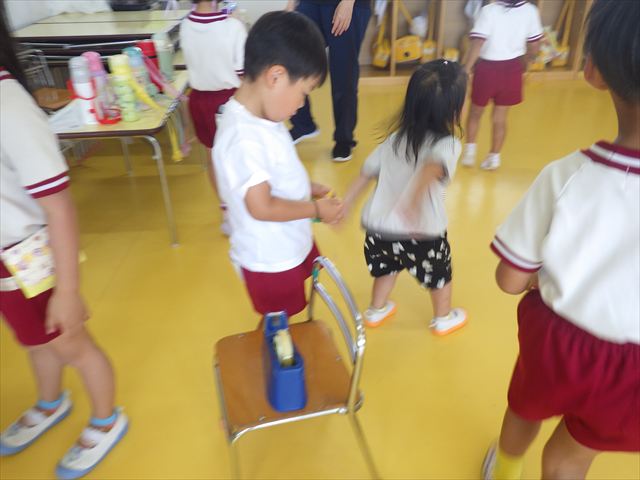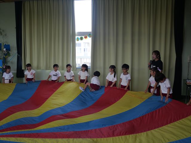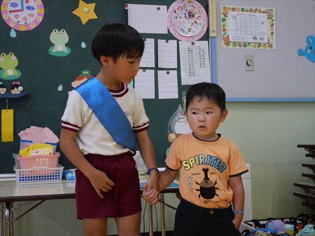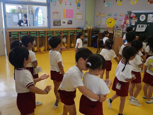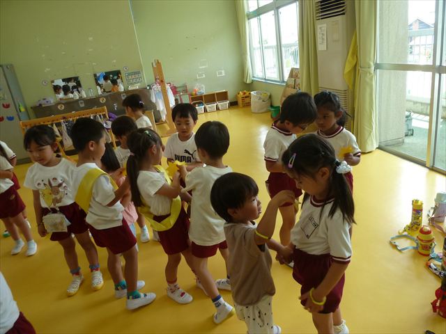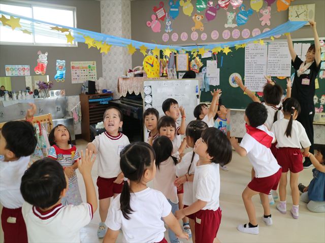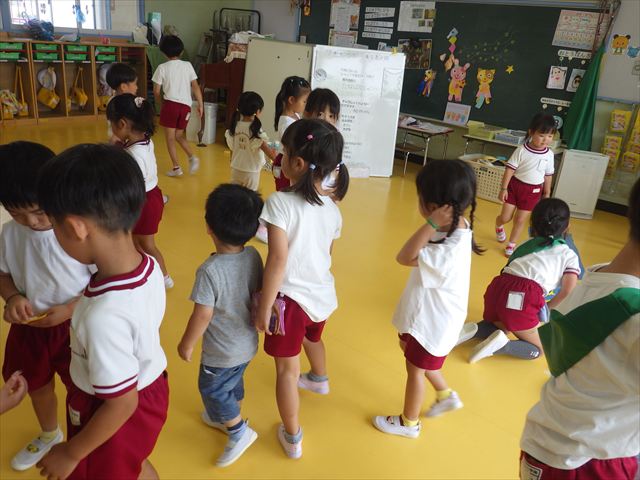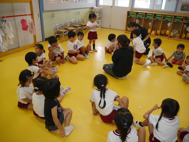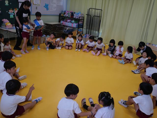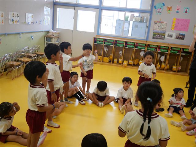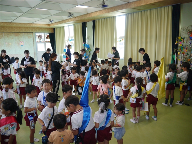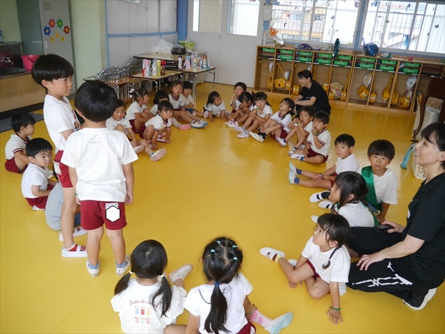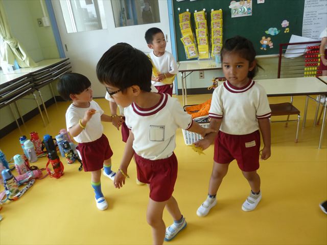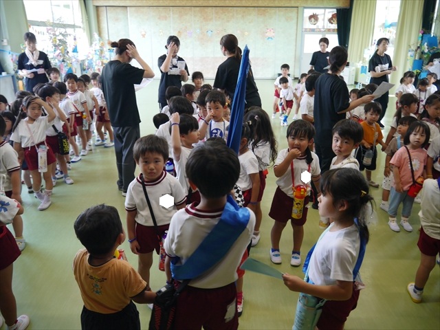 今日は、第3回縦割り保育活動を行いました。今回からちょっと成長した「たんぽぽさん」たちも参加しました。本園では「魅力ある幼稚園」を目指して、「縦割り保育活動」を推進しています。縦割り保育活動の教育的意義・教育効果の良さを踏まえ、一貫性・統一性のあるものにし、年上園児のリーダーシップや自主性・主体性、年下園児の協調性や行動力を育み、上下関係の人間関係の良さを体験させ、子どもたちの日常の保育に生かしていきたいと考え、回数も増やし、内容も改善しながら実施しています。