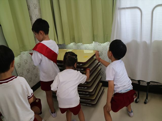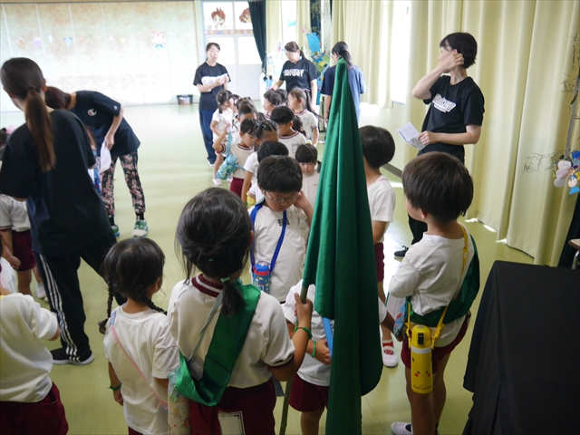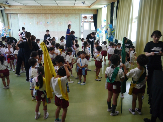 縦割り班 は仲間意識を高め、活動しやすくするため、年長・年中・年少・たんぽぽさんをそれぞれ4グループに分け「レッド・ブルー・イエロー・グリーン」のチームを組織しています。また、グループごとに年長さんたちが下の子をより面倒見やすく、安全に活動できるようにするため、グループの中に上の子と下の子の2人組のバディシステムで活動するようにしています。(*^_^*)