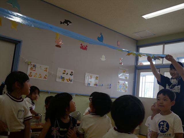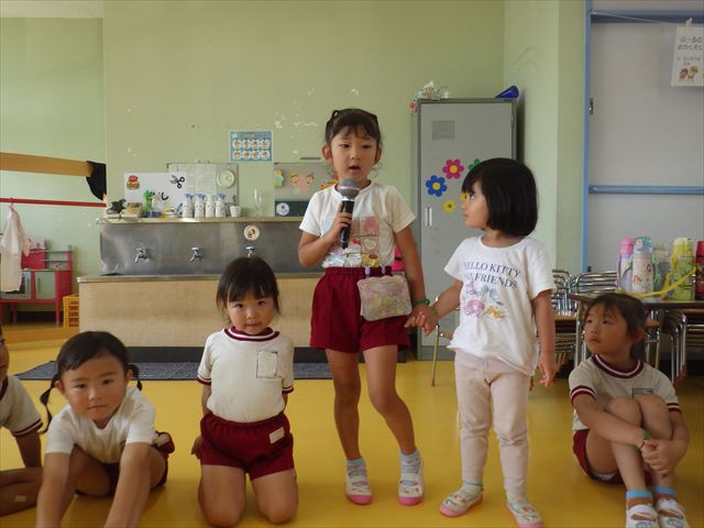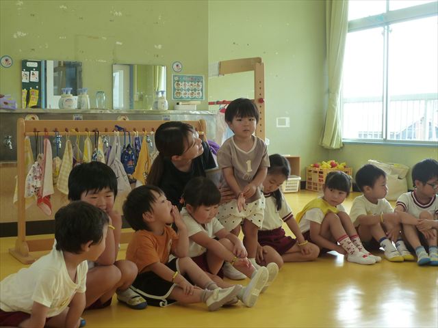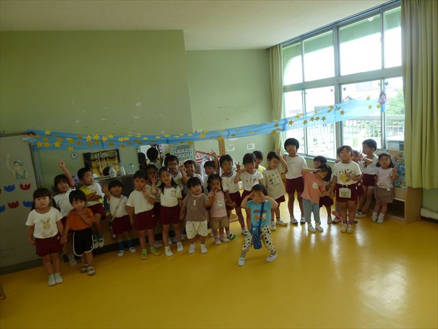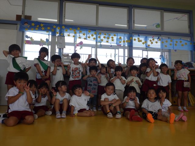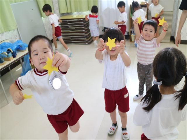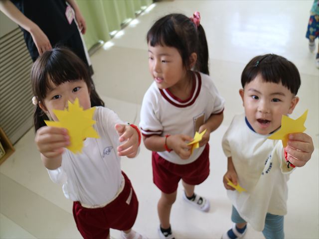 園長先生の話のあと、先生たちが「織姫・彦星の七夕伝説」の紙芝居をしてくれ、「七夕」の悲しいお話に思いをはせました。そのあと、園長先生から「織姫星と彦星」の夜空での位置、そしてはくちょう座のデネブを加えた「夏の大三角形」の話がありました。(^_^)b子どもたちに詳しく説明しましたので、親子で一緒に探してみてください。夏休みの宿題にします!(^_^;) とにかく今年の夏は、是非親子で夜空を眺め、天の川を見て、有名な夏の大三角形《こと座のベガ(織姫星)、わし座のアルタイル(彦星)、はくちょう座のデネブ》を探して、星空を眺めながら七夕伝説に思いをはせて下さい!(^_^)b